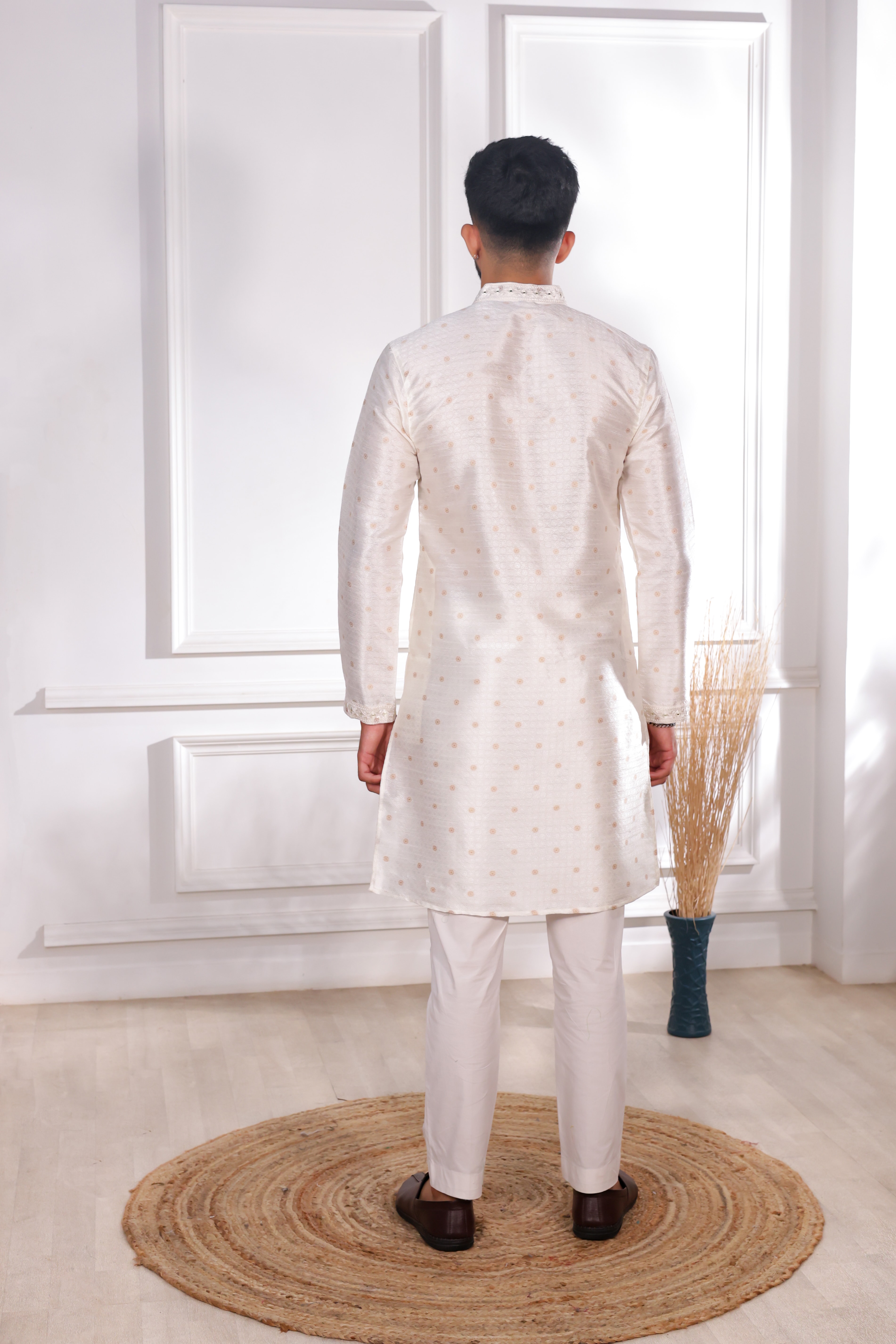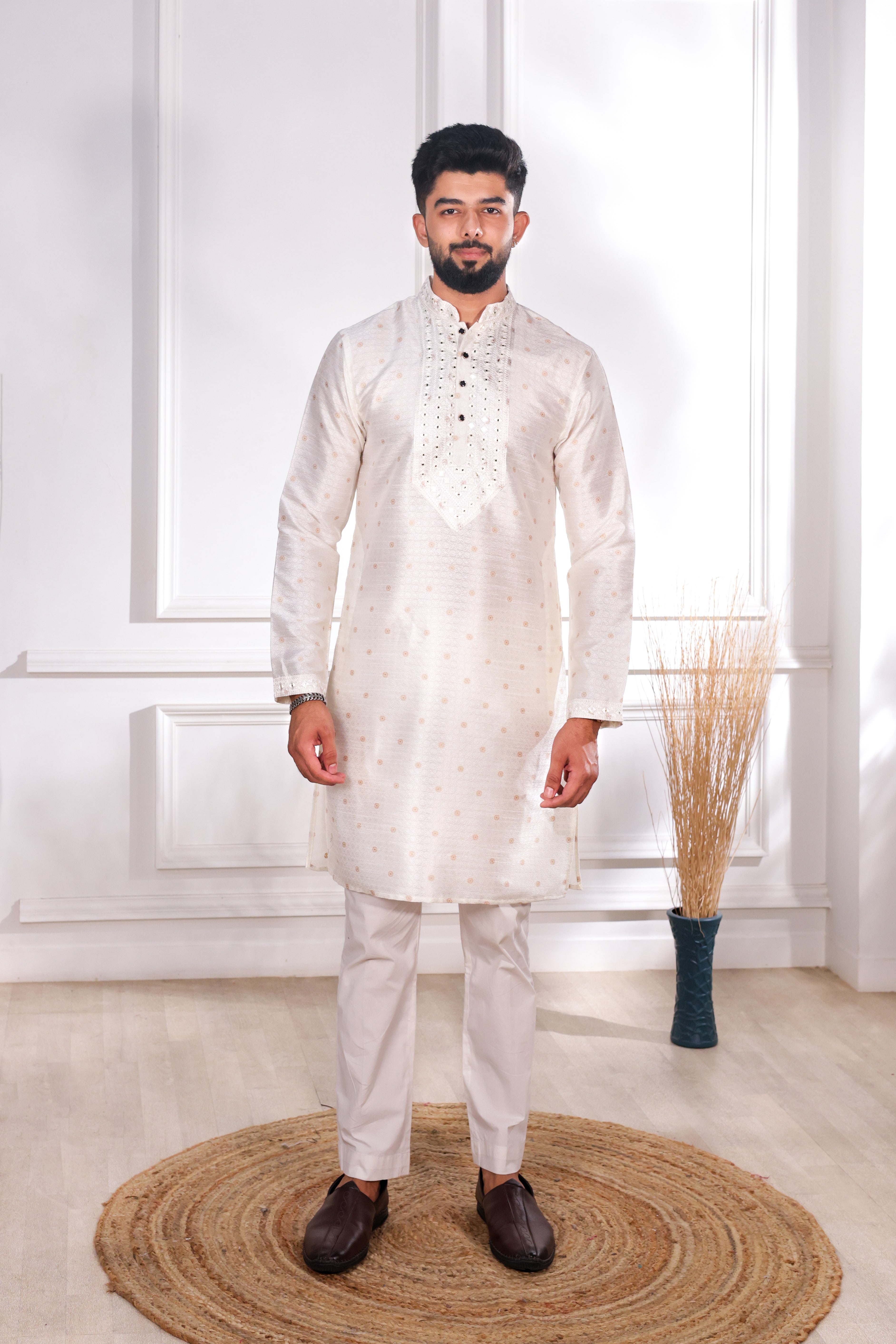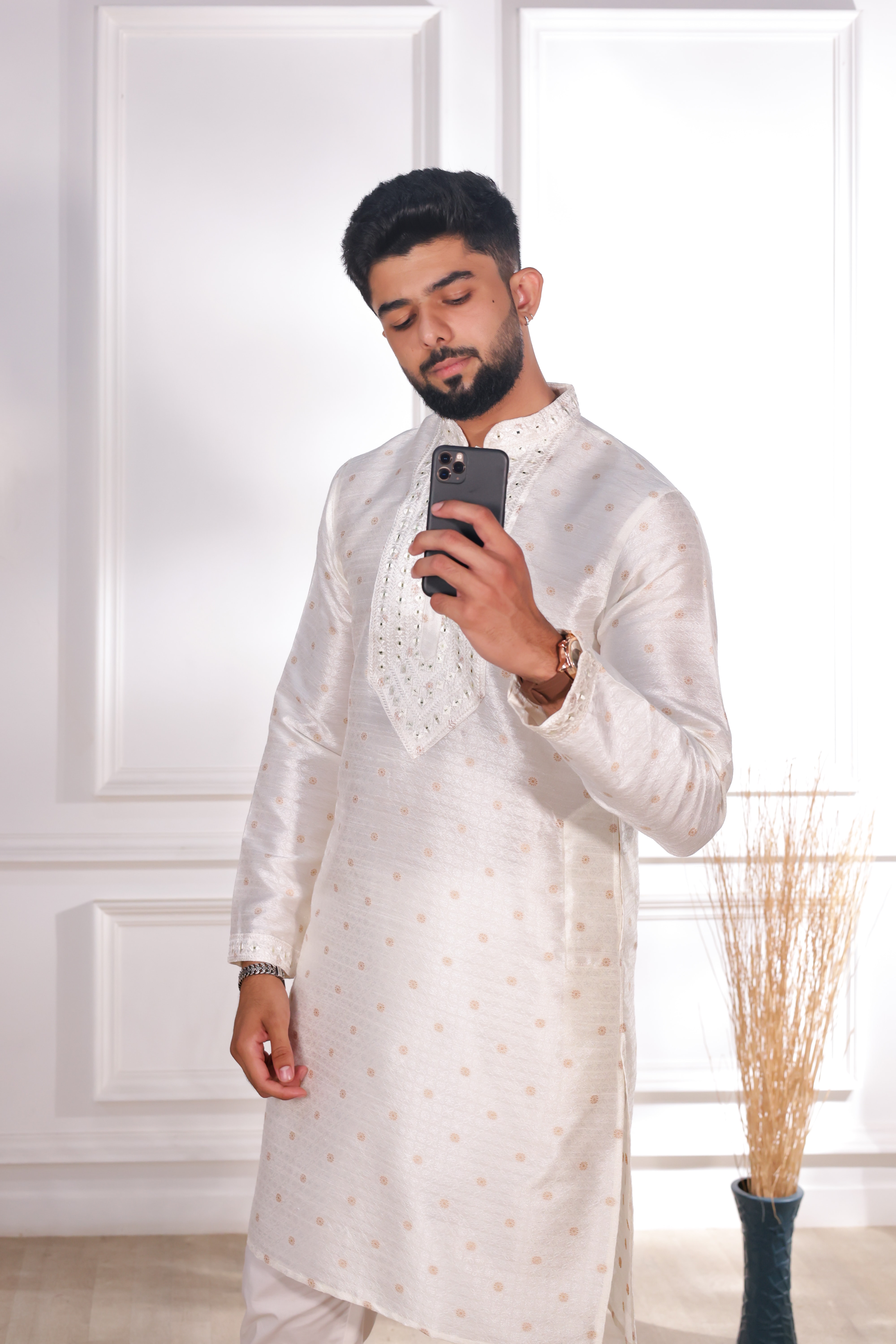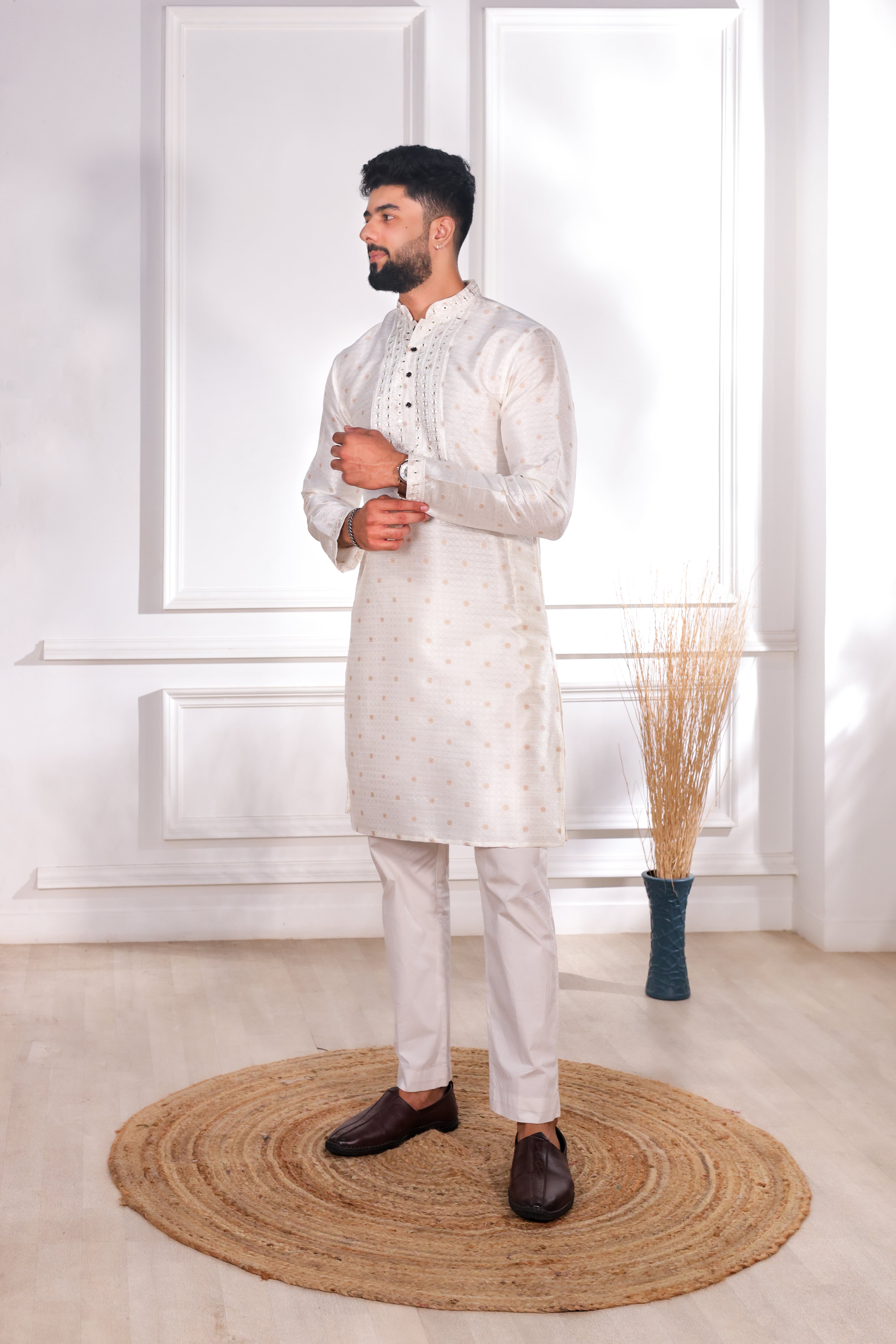 White Color Jacquard Silk Fabric Designer Embroidered Kurta Payjama For Men's