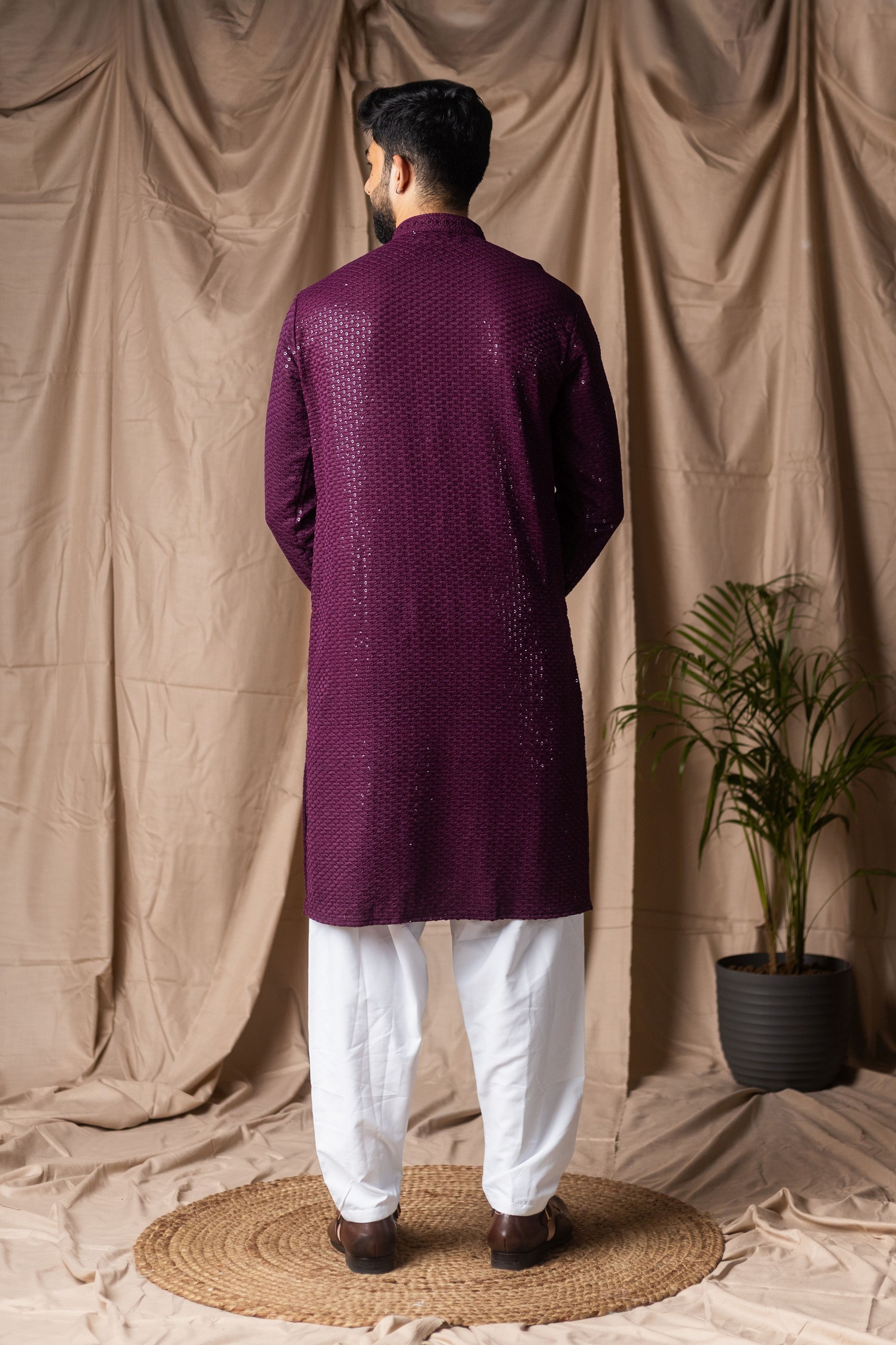 Wine Color Beautiful Thread Embroidery Work Rayon Fabric Ceremonial Men's Kurta Payjama