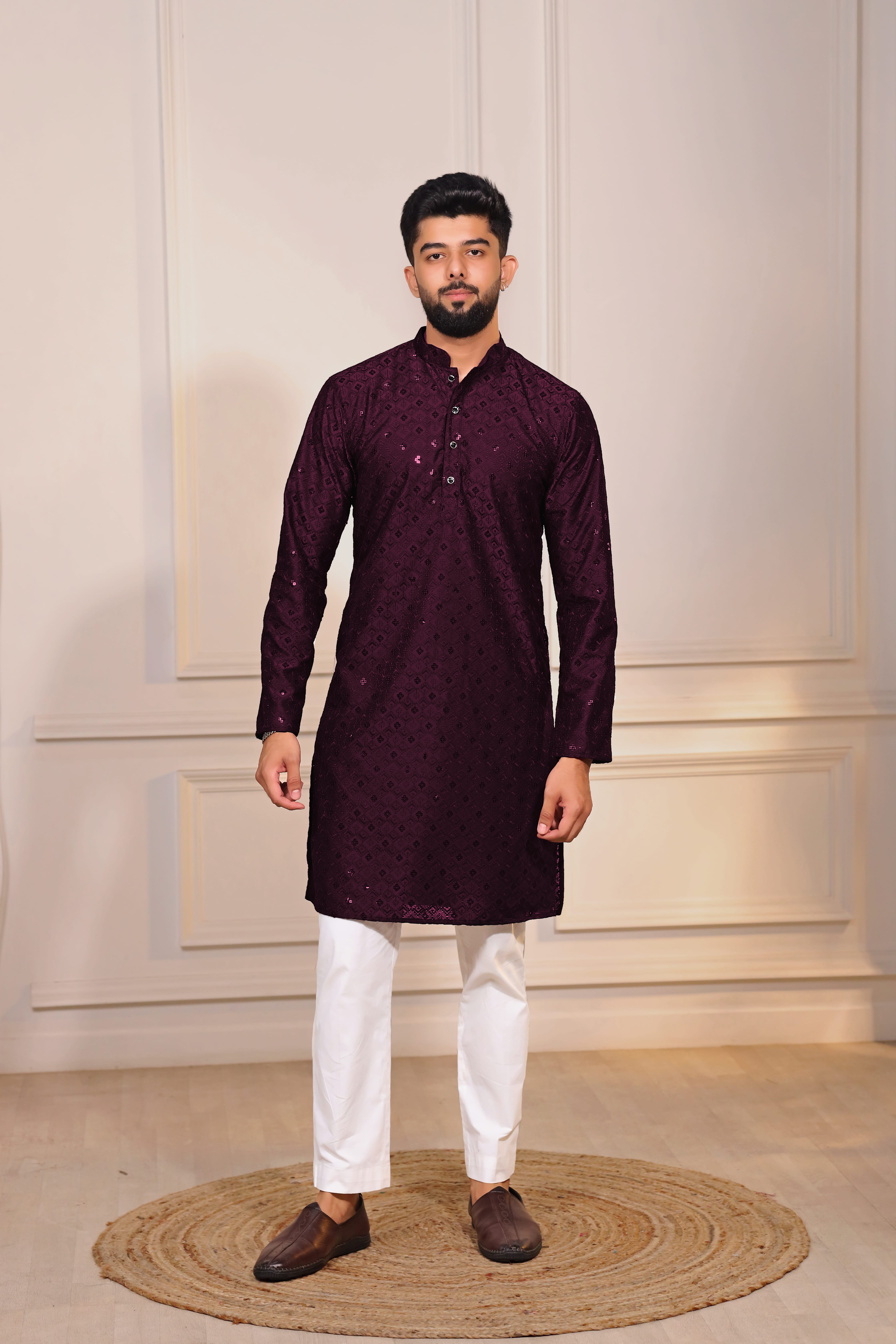 Wine Color Designer Embroidery Work Ceremonial Ethnic Kurta Payjama For Men's