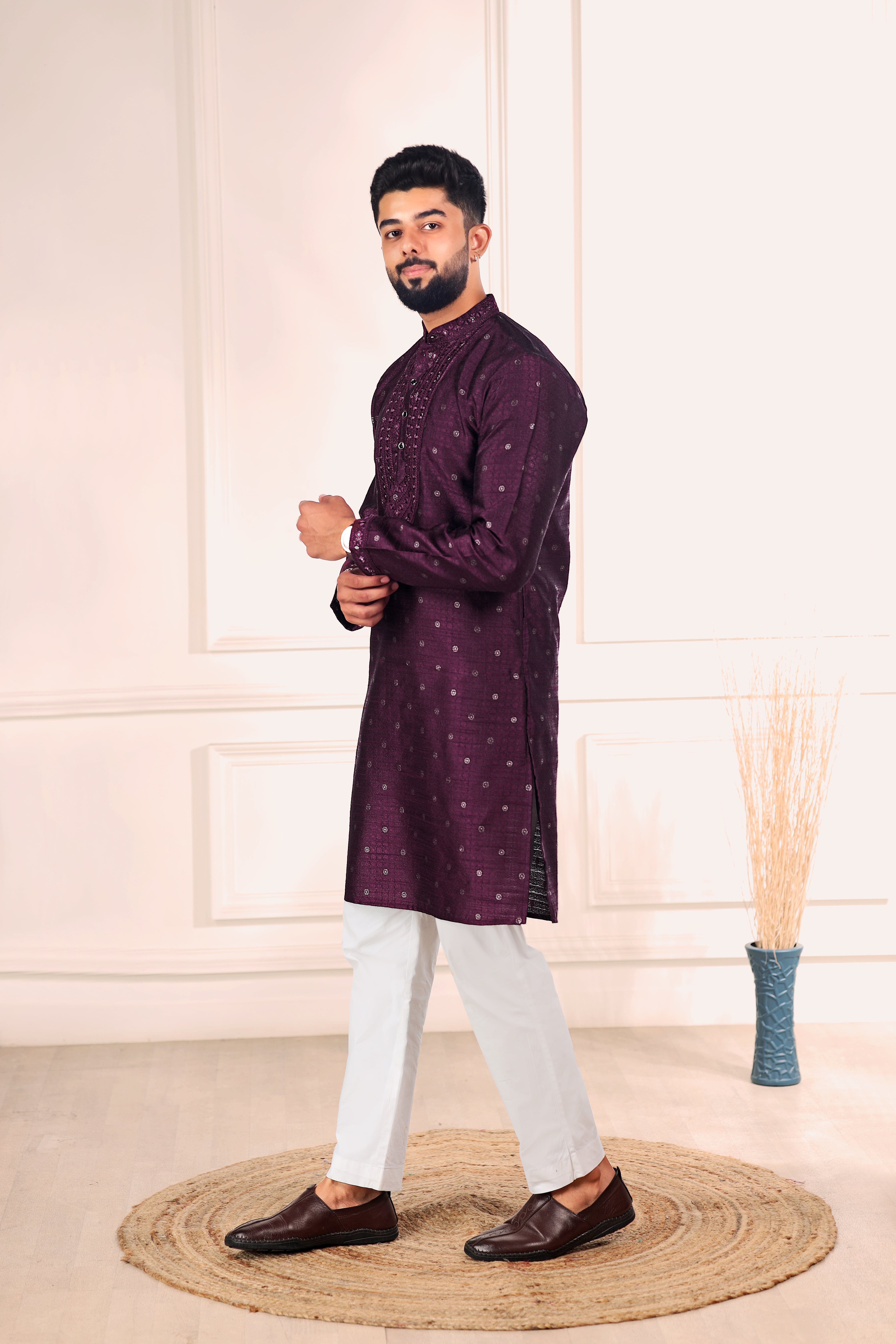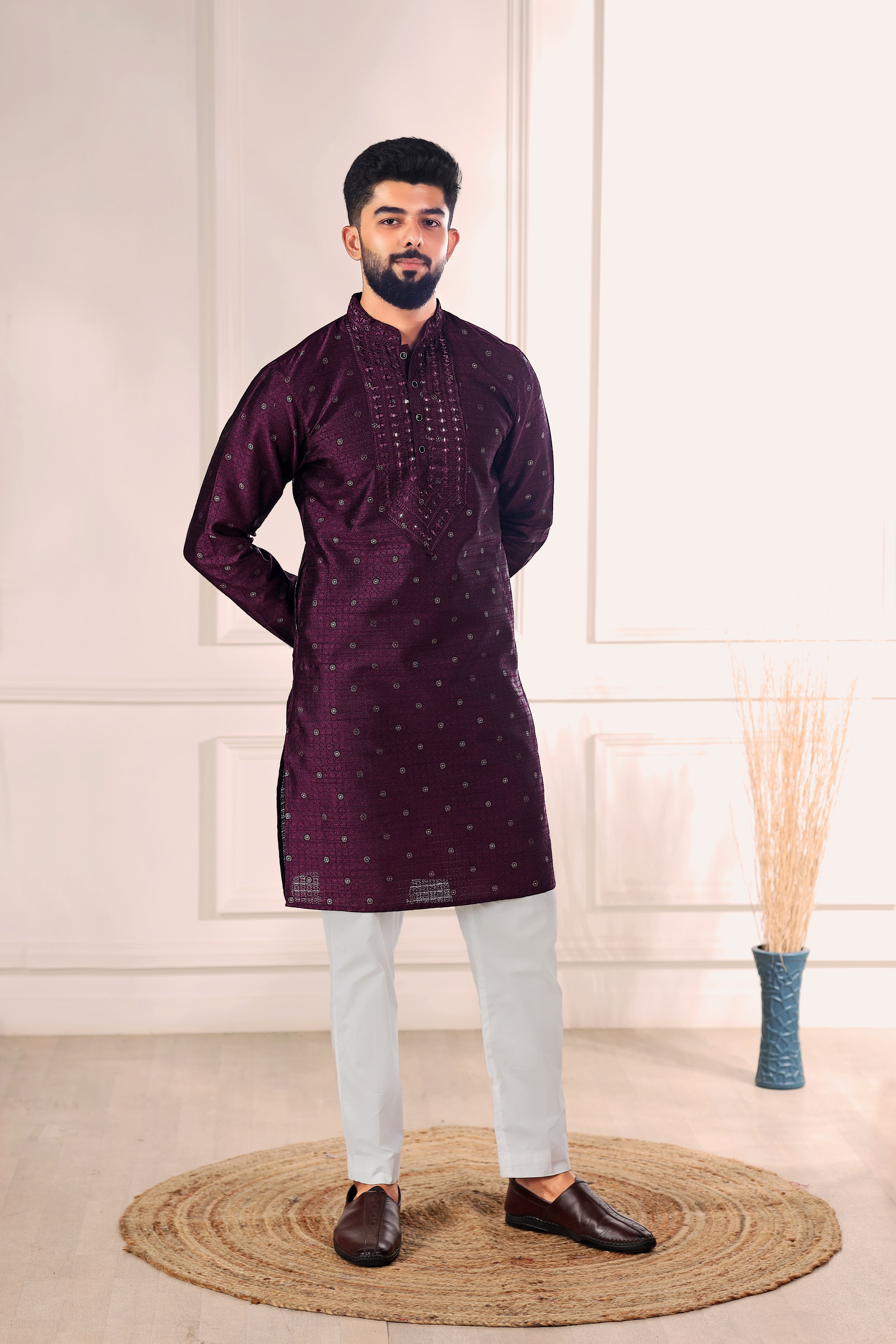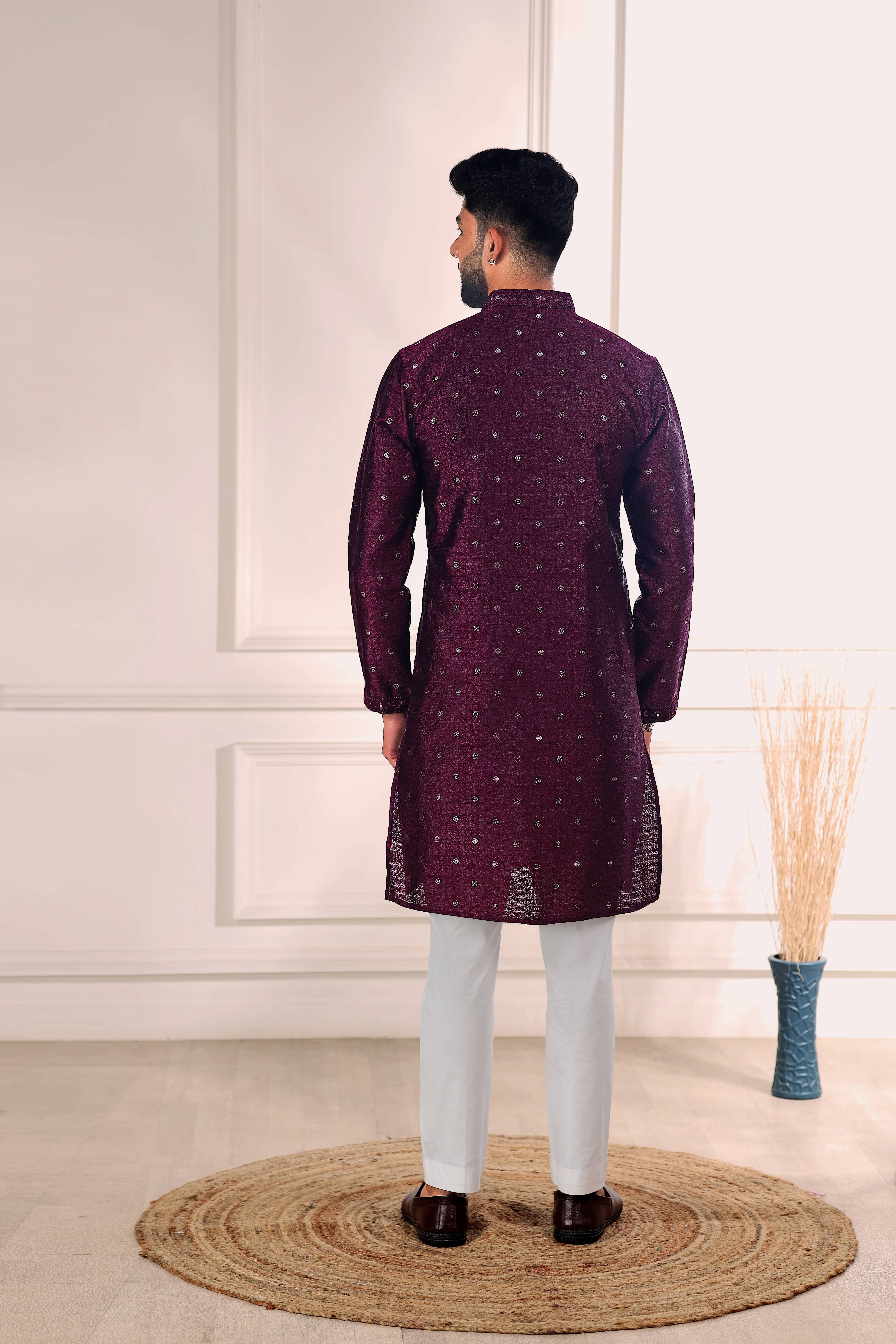 Wine Color Jacquard Silk Fabric Designer Embroidered Kurta Payjama For Men's