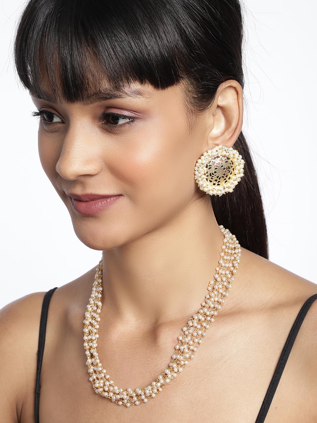 Green layered necklace Material and stone type: german silver with kundan Closure: drawstring Size & Fit Necklace Length: 60 cm Material & Care Material: German Silver Stone type: Kundan Wipe with a soft lint-free clean cloth. Avoid contact with perfume soap hairspray and cosmetics. Avoid using in swimming pools. Store your jewellery in a fabric-lined box to prevent loosening of stone setting