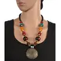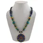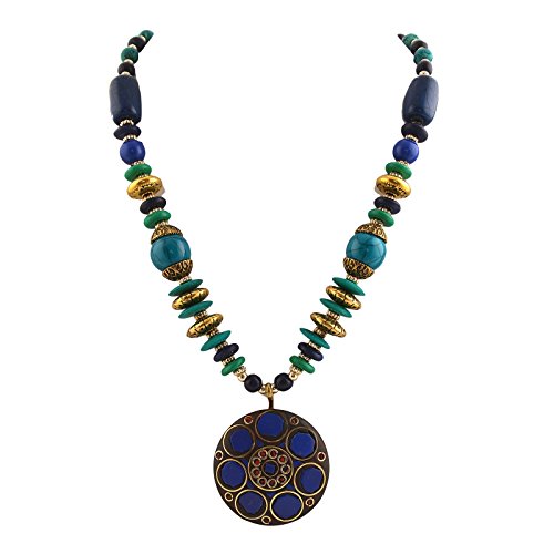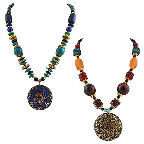 Combo of 2 beautiful Tibetan style beaded necklace. Necklace beautifully handcrafted with a combination of blue red green golden carved beads and dui beads. Round pendant showcases beautiful inlay work in blue green red and gold. Boho style statement fashion necklace for women. Pair with Sarees Kurtis or other ethnic Indo-western as well as casual wear. These Tibetan style fashion necklace will complement your ethnic as well as casual wear. Great for gifting to friends too. Necklace length=23'' Pendant length=2.3'' pendant Width=2.3''; Necklace (with blue pendant)length=20'' Pendant length=2'' Pendant width=2''