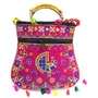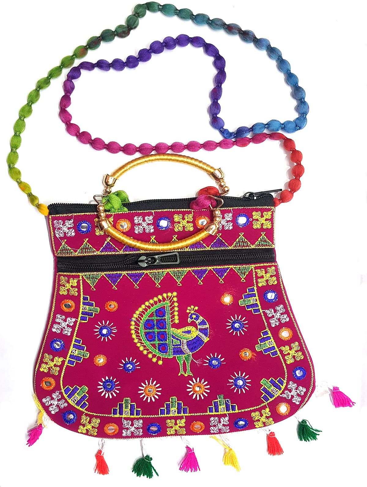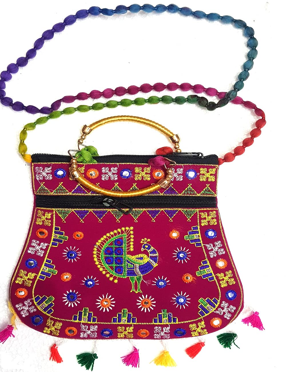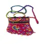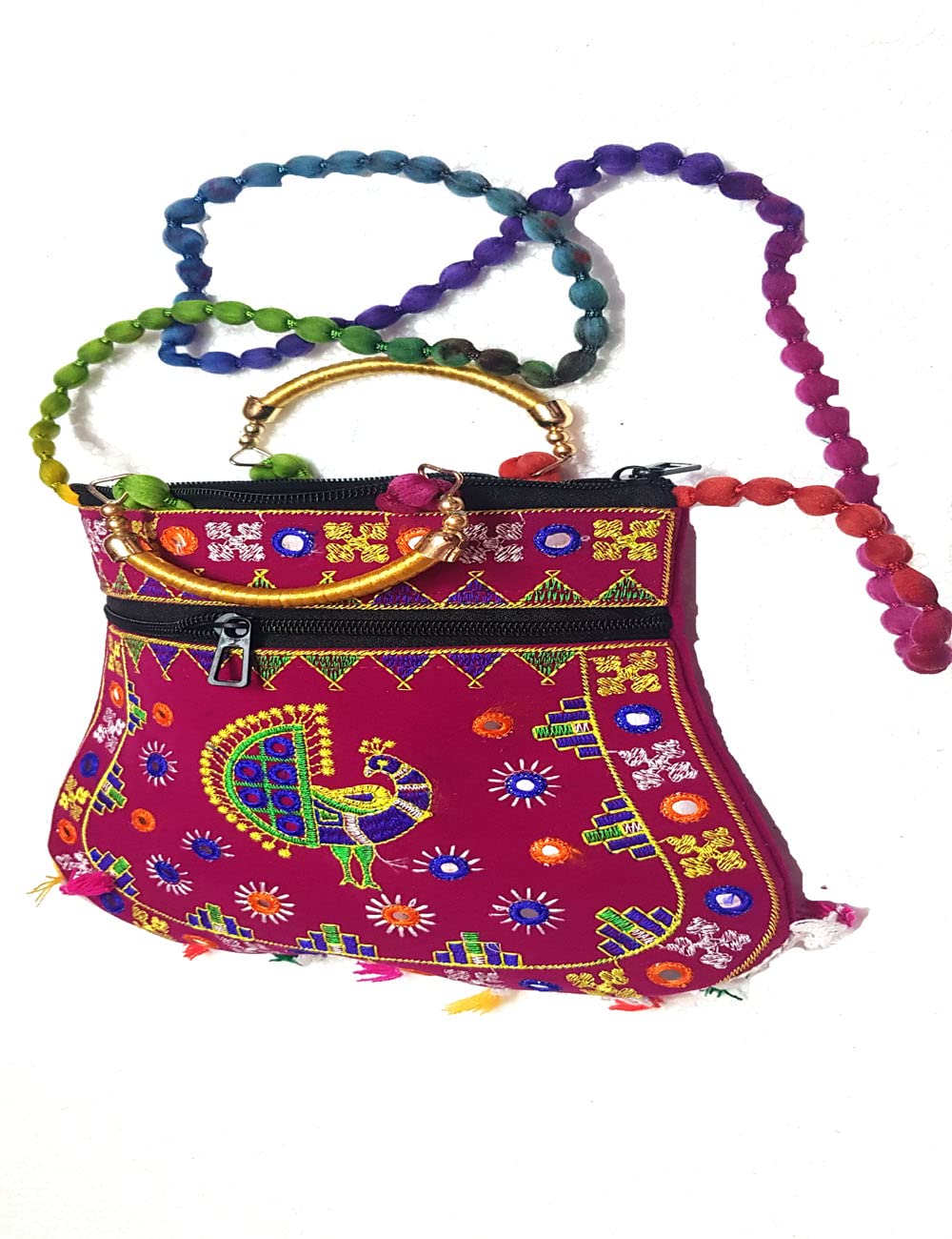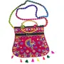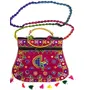 Handcrafted clutches and sling bags for that ethnic chic look. Pair it with ethnic and western outfits. Great companion for college parties or when you go shopping. This dazzling shoulder bag showcases India's textile techniques from Rajasthan. The bag is crafted with cotton appliqué lavish embroidery sequins emulate mirror work. It features a zipper closure as well as a magnetic button beneath the flap and hang from cotton pom pom trim purple strap. Because embroidered patches are recycled in this bag no two are ever identical. However the theme will be the same.