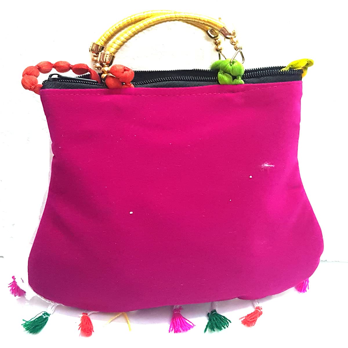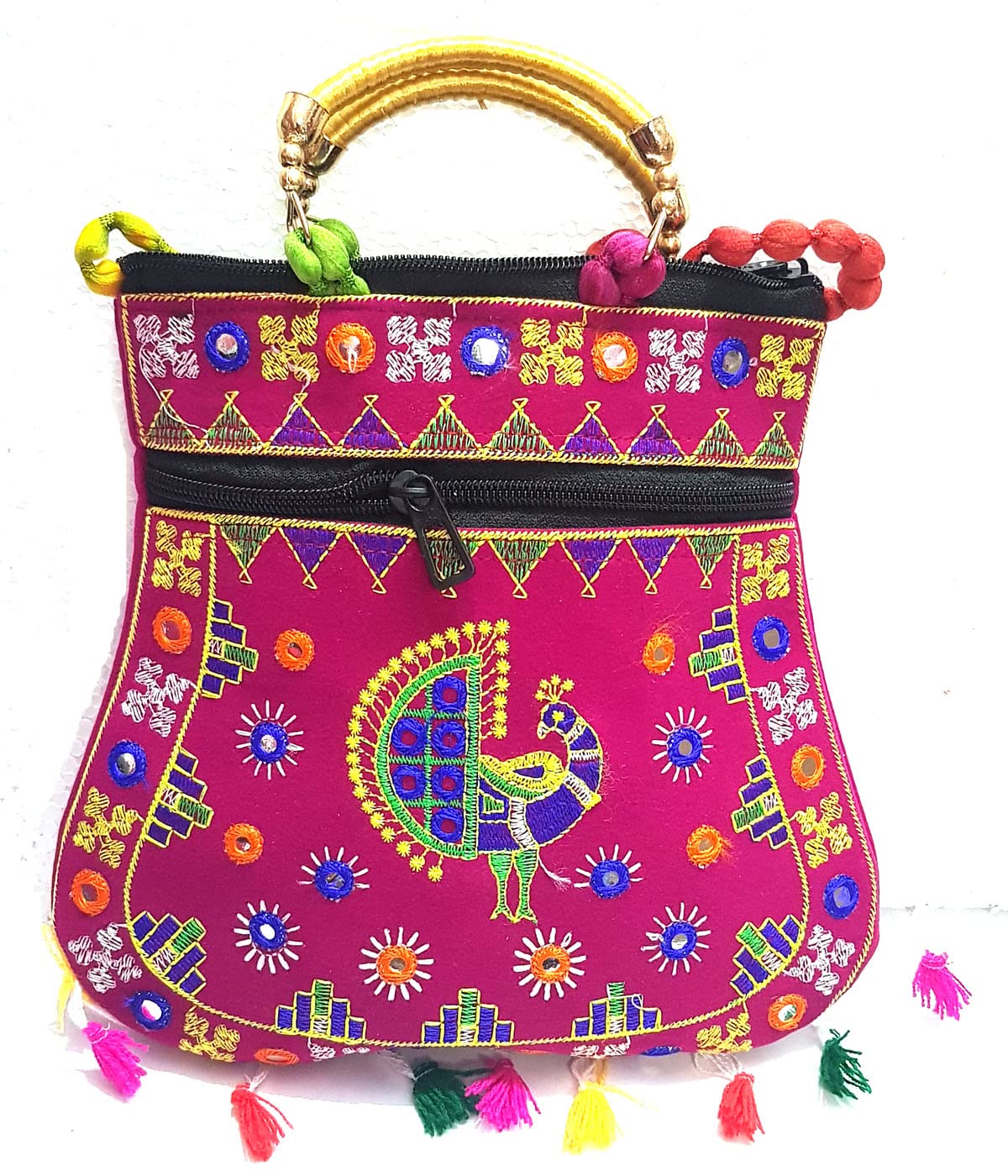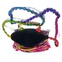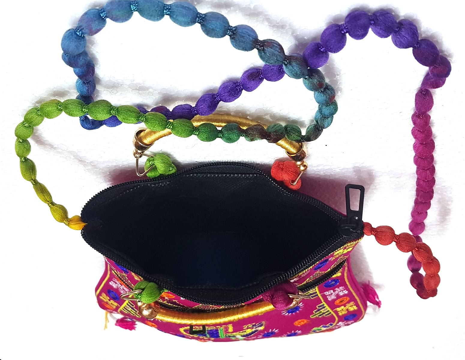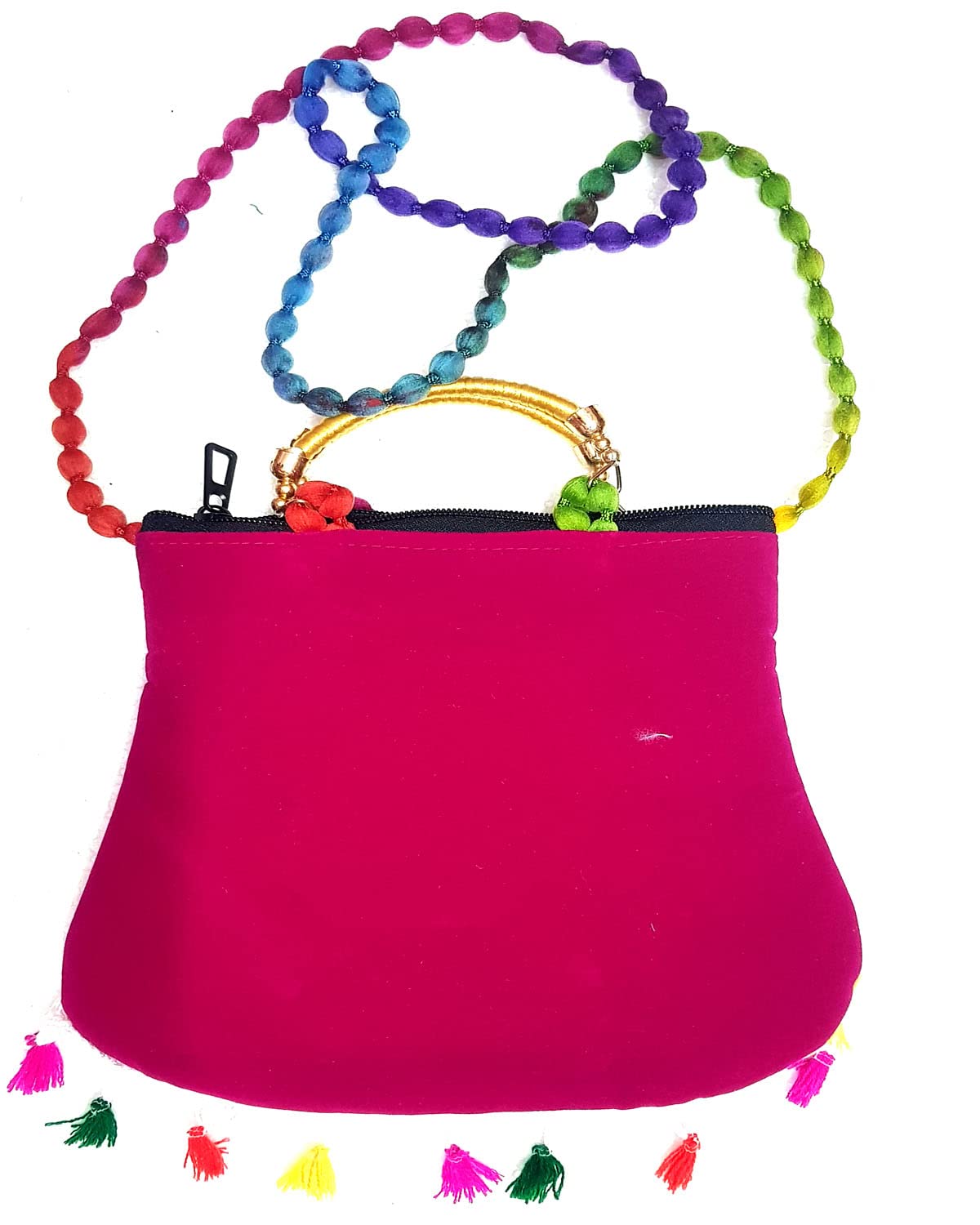 Handcrafted clutches and sling bags for that ethnic chic look. Pair it with ethnic and western outfits. Great companion for college parties or when you go shopping. This dazzling shoulder bag showcases India's textile techniques from Rajasthan. The bag is crafted with cotton appliqué lavish embroidery sequins emulate mirror work. It features a zipper closure as well as a magnetic button beneath the flap and hang from cotton pom pom trim purple strap. Because embroidered patches are recycled in this bag no two are ever identical. However the theme will be the same.