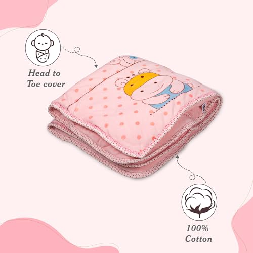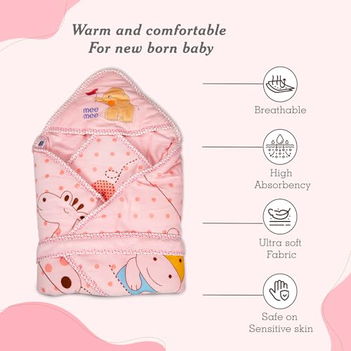 Mee Mee 100% Soft Cotton Hooded Baby Wrapper Cum Warmer, Blanket with Hood for New Born Baby 0 to 6 Months (Pink Printed)