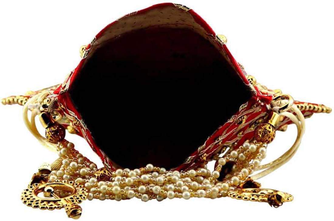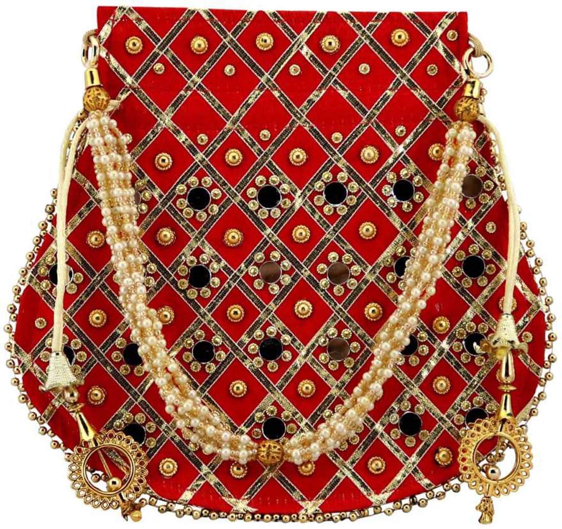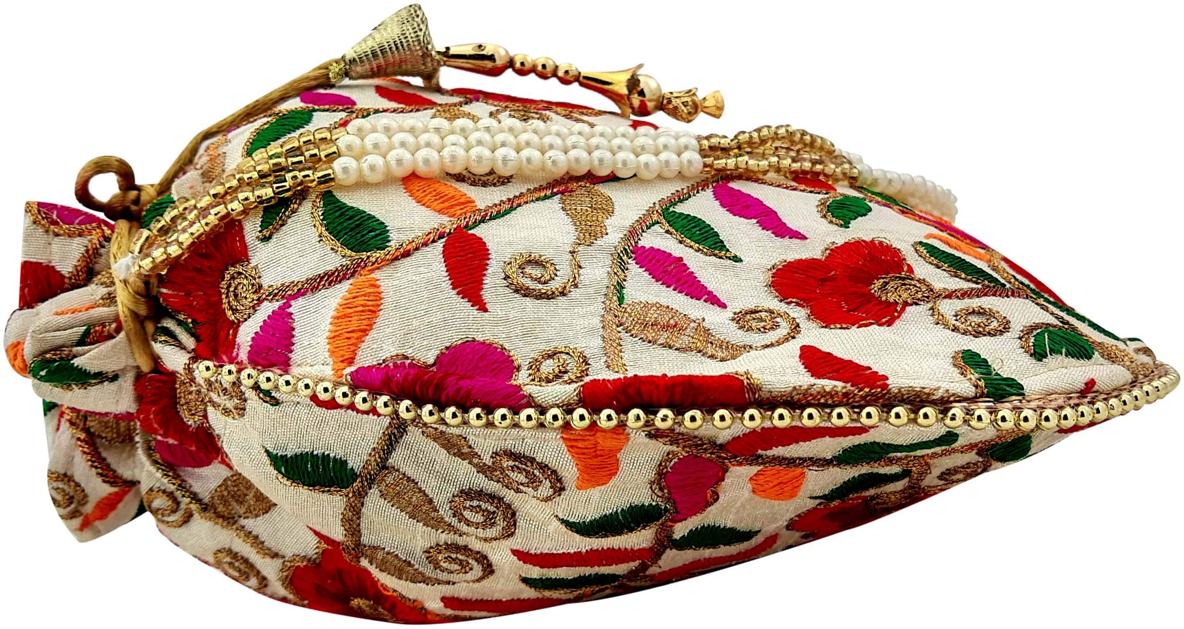 Potli Bag is a Ethnic Stylish Clutch kind of Indian Handbag Potli bag looks very nice with any traditional dresses also goes well with any Casual Indian Dresses. Spacious Compartment that can easily carry today's big smartphonesmobiles and other valuables things. Potli bag are designed for any evening party or casual occasions at any time of the day. Marriage ceremonies to all kind of wedding parties. It can be one of the best gift for any woman. They will just Love it. This Stunning Potli Bag Is Made From Raw Silk With The Embellishment Of Embroidery Sequin Beads And Pearls Etc.