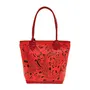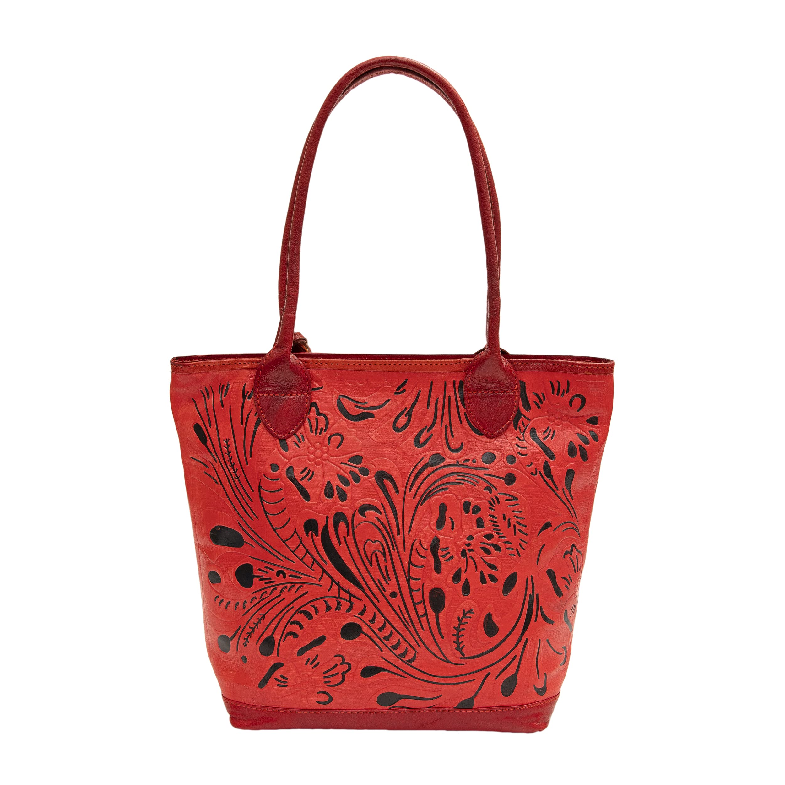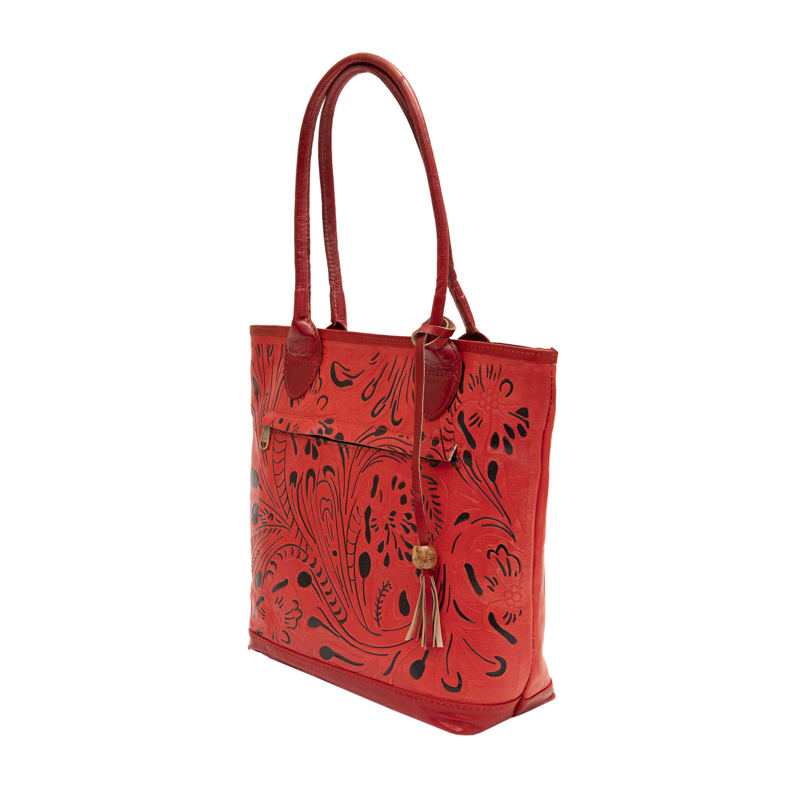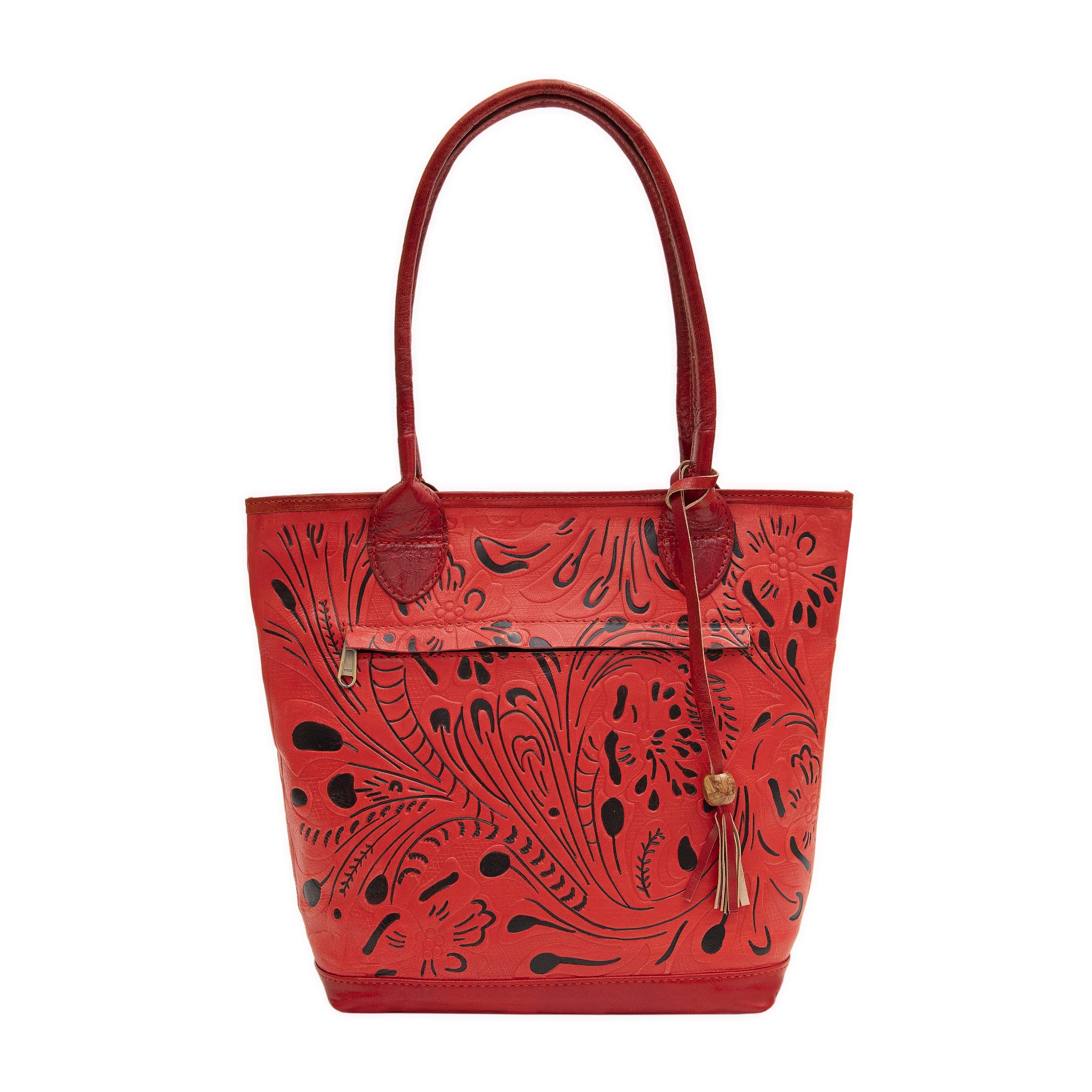 This is a unique handcrafted hand tooled womens handbag made from 100% genuine leather. This bright red hand-painted piece of art has a beautiful design on both sides and is appealing to the eye. The bag closes fully with a zipper on top. Inside the bag there is a zippered compartment and a cellphone pouch. It also has a zipper compartment on the back. DIMENSIONS: Length: 13.8 inches Height: 11.8 inches Width (at base): 3.9 inches Shoulder Strap: 9 inches MATERIALS USED: 100% Genuine leather (vegetable tanned) PCP free chemicals Vegetable-based pigment colors Hammer Brush Wooden Blocks ORIGIN AND MAKING: This purse is a classic example of age old Shantiniketan craft which was introduced in West Bengal India during the 1940s. It derives its name from the place where it was first introduced Shantiniketan and was patronized by Nobel Laureate Rabindra Nath Tagore who revived a number of crafts that were nearing redundancy in Shantiniketan. The Shantiniketan style evolved as a result of the Art Movement and these products have now become world famous for their appliqu batik and embossed craft work. The process of burnishing the leather gives it an elegant sheen and brings out the colors. The major embossing craft is done by hand and is an intricate process. After the final leather made it is then stitched into the desired product coated with a lacquer finish for making the product shiny and long lasting. The traditional motifs used for these Shantiniketan bags depict the rich cultural heritage of India.