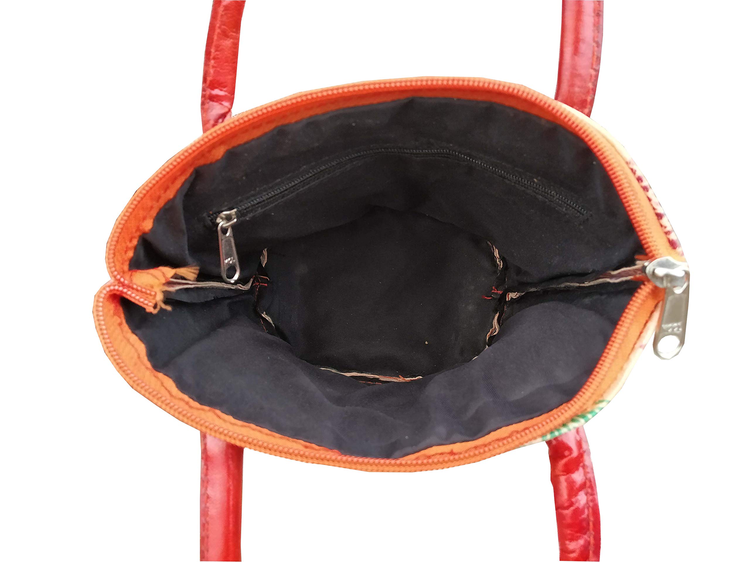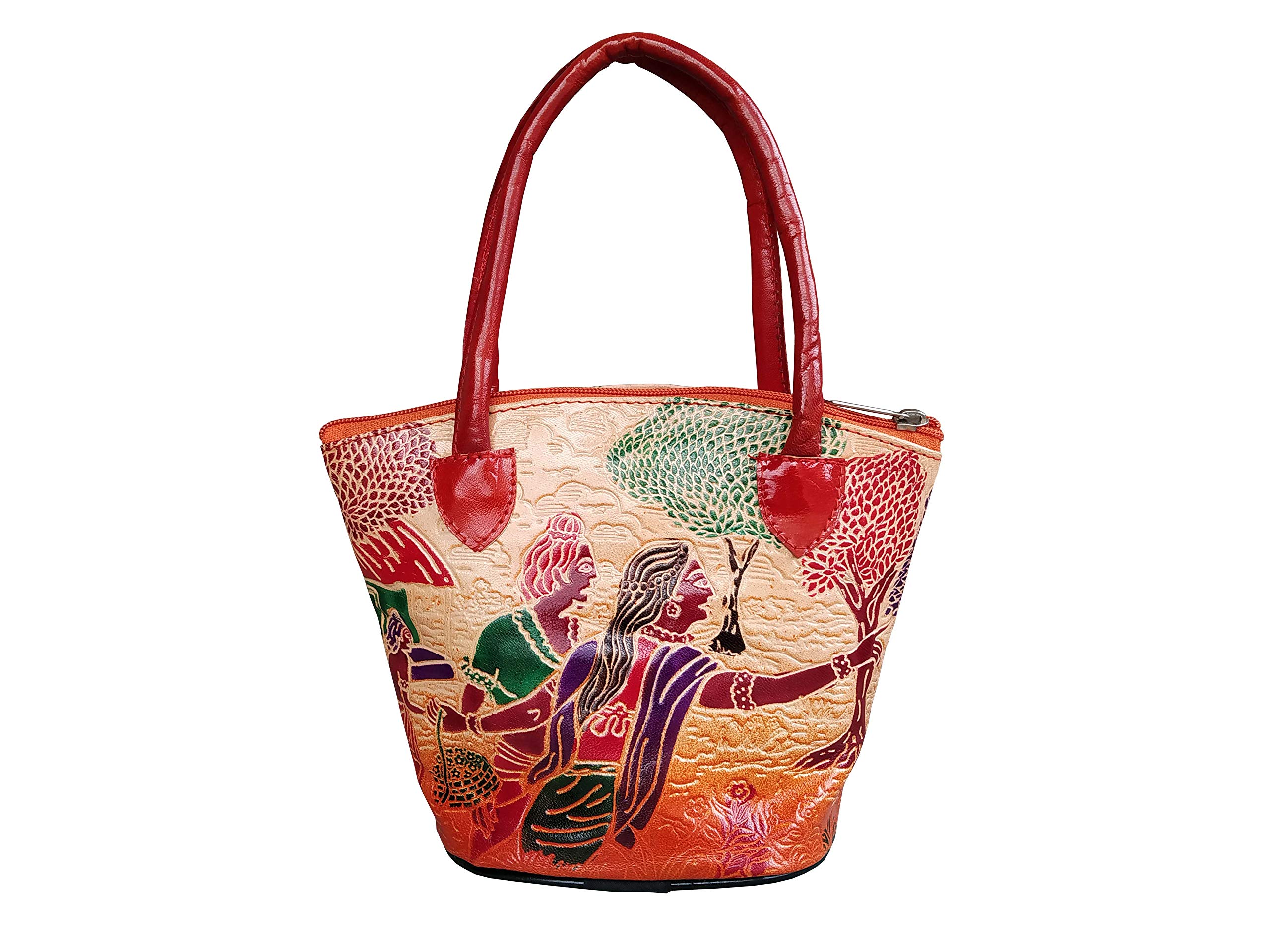 Handcrafted from 100% Genuine Leather a Beautiful Ethnic Art of West Bengal. Design on Both Sides Double Handle One Main compartment and One Cell phone compartment Inside. Closes fully with zip. Traditional Block print. This purse is a classic example of age old Shantiniketan craft which was introduced in West Bengal India during the 1940s. The traditional motifs used for these Shantiniketan bags depict the rich cultural heritage of India. It derives its name from the place where it was first introduced - Shantiniketan and was patronized by Nobel Laureate Rabindra Nath Tagore who revived a number of crafts that were nearing redundancy in Shantiniketan. The Shantiniketan style evolved as a result of the Art Movement and these products have now become world famous for their appliqu batik and embossed craft work. The process of burnishing the leather gives it an elegant sheen and brings out the colors. The major embossing craft is done by hand and is an intricate process. After the final leather made it is then stitched into the desired product coated with a lacquer finish for making the product shiny and long lasting.