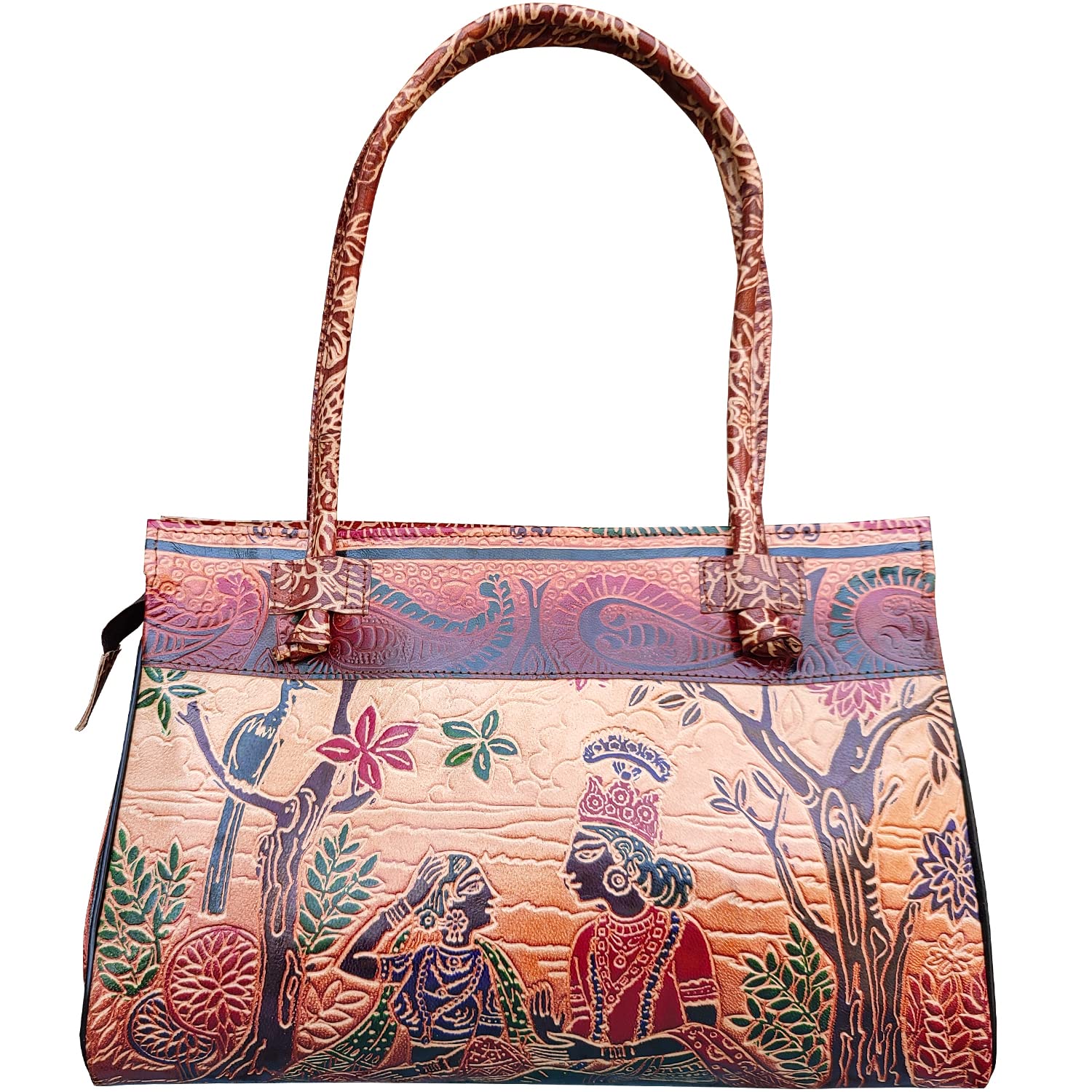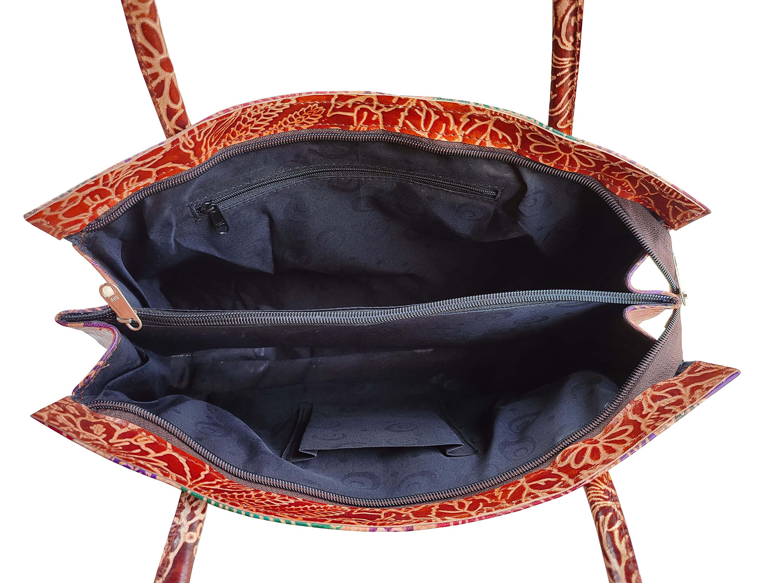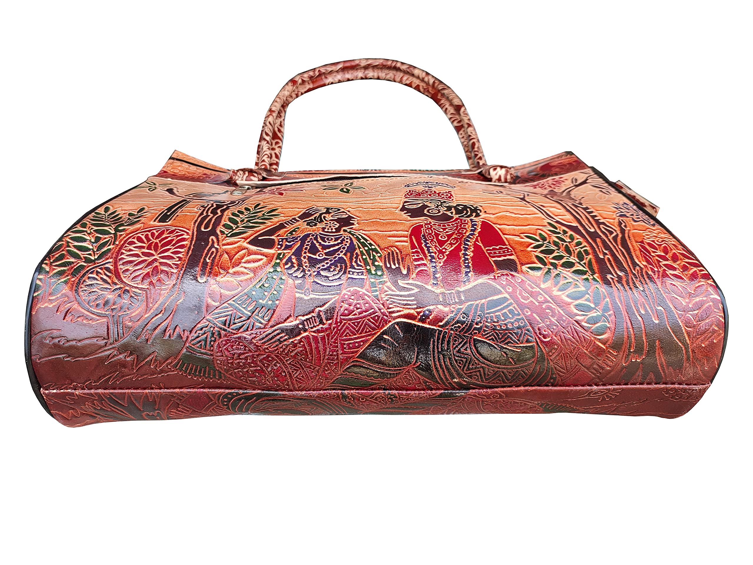 Handcrafted from Genuine Leather a Beautiful Ethnic Art of West Bengal. Design on Both Sides Double Shoulder Tote Handle One Main Zipper compartment One Zipper pocket in Back and Three Compartments inside Two zipper and One open cell phone compartment. Closes fully with zip. Traditional Batik print. This purse is a classic example of age old Shantiniketan craft which was introduced in West Bengal India during the 1940s. The traditional motifs used for these Shantiniketan bags depict the rich cultural heritage of India. The Shantiniketan style evolved as a result of the Art Movement and these products have now become world famous for their appliqu batik and embossed craft work. The process of burnishing the leather gives it an elegant sheen and brings out the colors. The major embossing craft is done by hand and is an intricate process. After the final leather made it is then stitched into the desired product coated with a lacquer finish for making the product shiny and long lasting. We are happy for your interest SHANTINIKETAN EMBOSSED LEATHER PRODUCTS and artist of Shantinikan thanks to you.