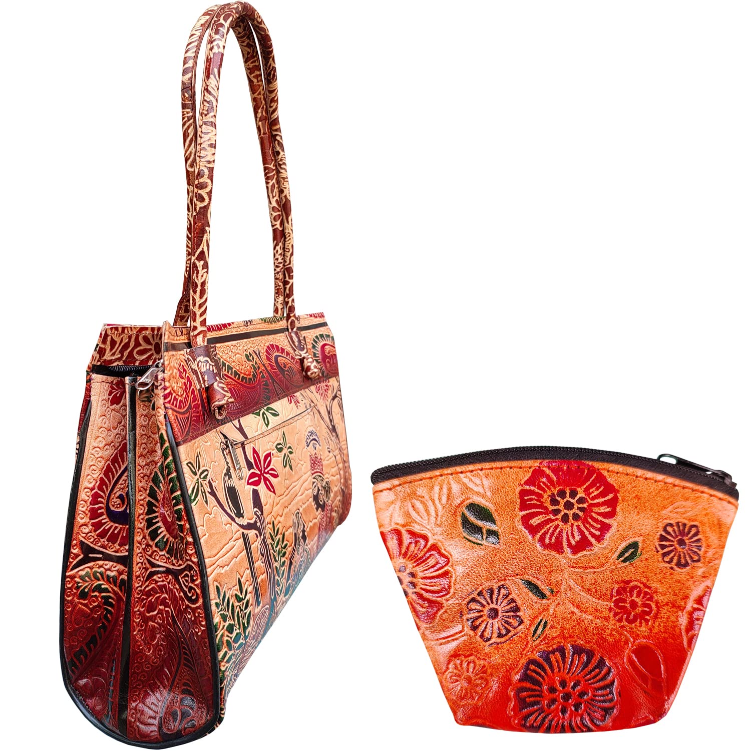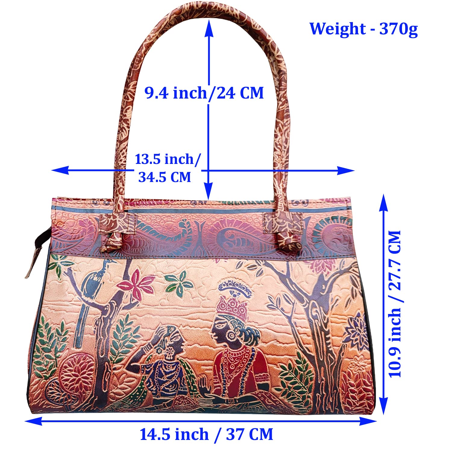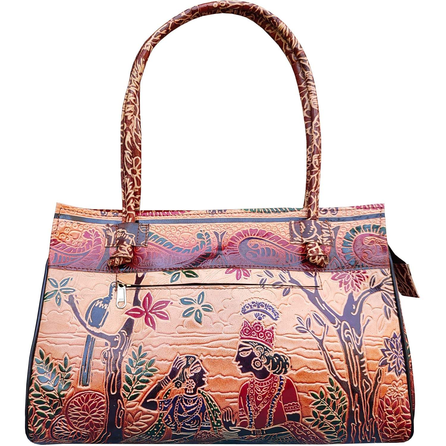 Handcrafted from Genuine Leather a Beautiful Ethnic Art of West Bengal. Design on Both Sides Double Shoulder Tote Handle One Main Zipper compartment One Zipper pocket in Back and Three Compartments inside Two zipper and One open cell phone compartment. Closes fully with zip. Traditional Batik print. This purse is a classic example of age old Shantiniketan craft which was introduced in West Bengal India during the 1940s. The traditional motifs used for these Shantiniketan bags depict the rich cultural heritage of India. The Shantiniketan style evolved as a result of the Art Movement and these products have now become world famous for their appliqu batik and embossed craft work. The process of burnishing the leather gives it an elegant sheen and brings out the colors. The major embossing craft is done by hand and is an intricate process. After the final leather made it is then stitched into the desired product coated with a lacquer finish for making the product shiny and long lasting. We are happy for your interest SHANTINIKETAN EMBOSSED LEATHER PRODUCTS and artist of Shantinikan thanks to you.