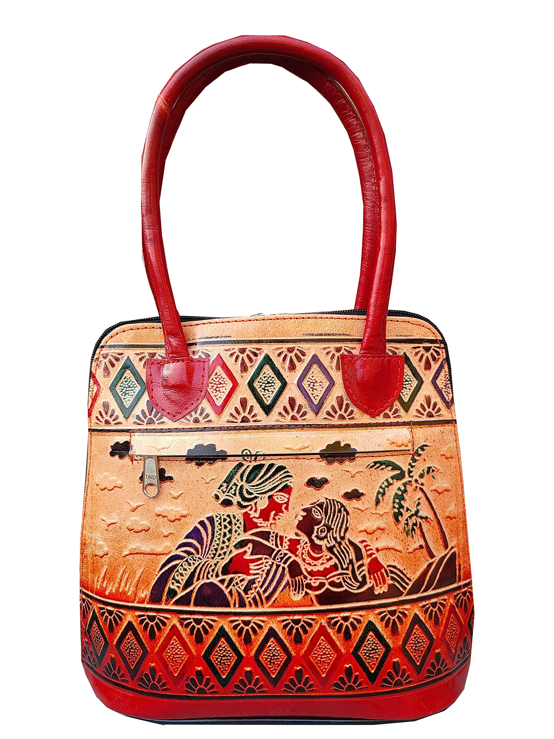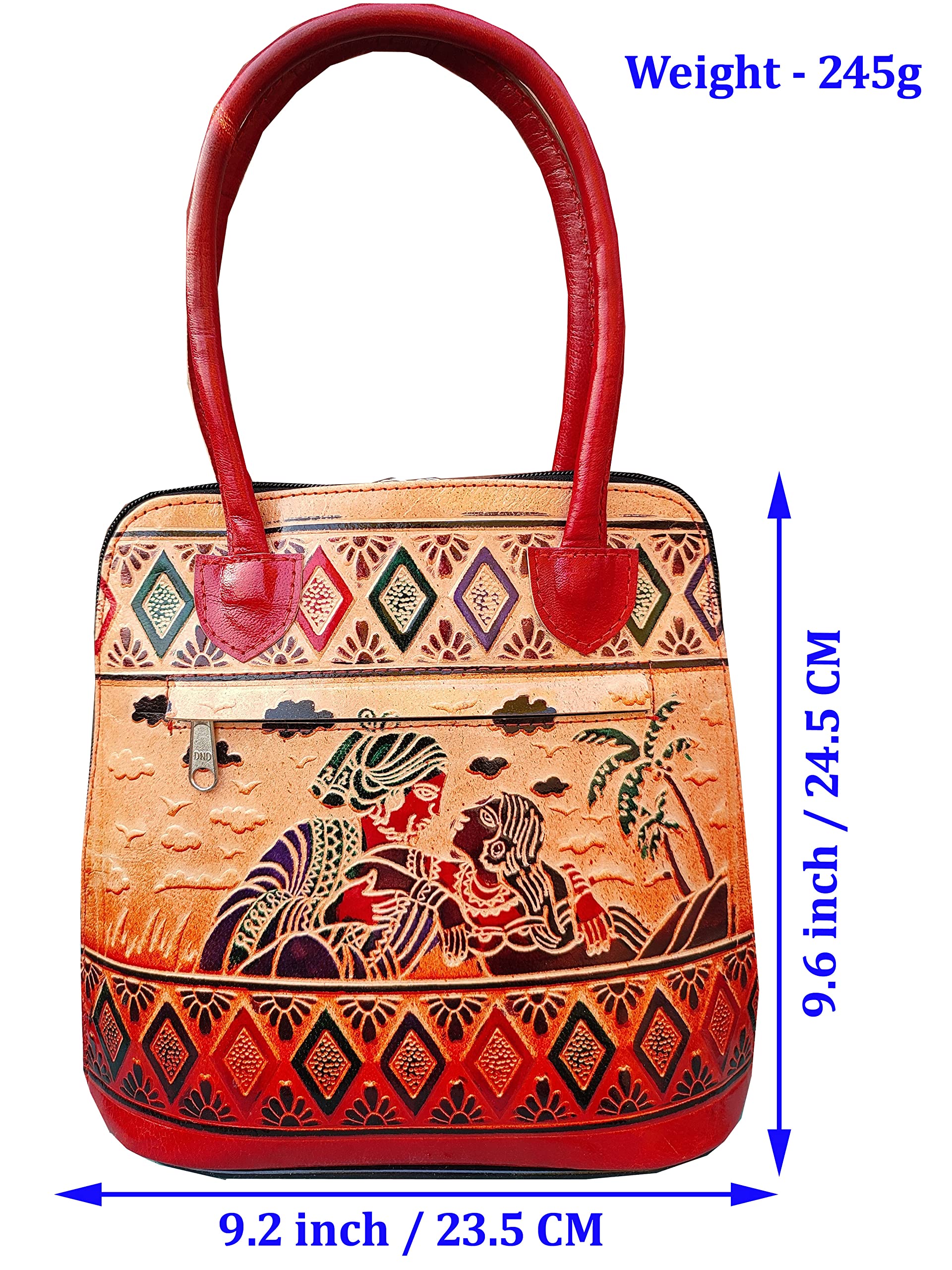 Handcrafted from Genuine Leather a Beautiful Ethnic Art of West Bengal. Design on Both Sides Double Handle One Main Zipper compartment One Zipper pocket in Back and Two zipper Compartments inside Closes fully with zip. This purse is a classic example of age old Shantiniketan craft which was introduced in West Bengal India during the 1940s. The Shantiniketan style evolved as a result of the Art Movement and these products have now become world famous for their applique batik and embossed craft work. The process of burnishing the leather gives it an elegant sheen and brings out the colors. The major embossing craft is done by hand and is an intricate process. After the final leather made it is then stitched into the desired product coated with a lacquer finish for making the product shiny and long lasting. We are happy for your interest SHANTINIKETAN EMBOSSED LEATHER PRODUCTS and artist of Shantinikan thanks to you.