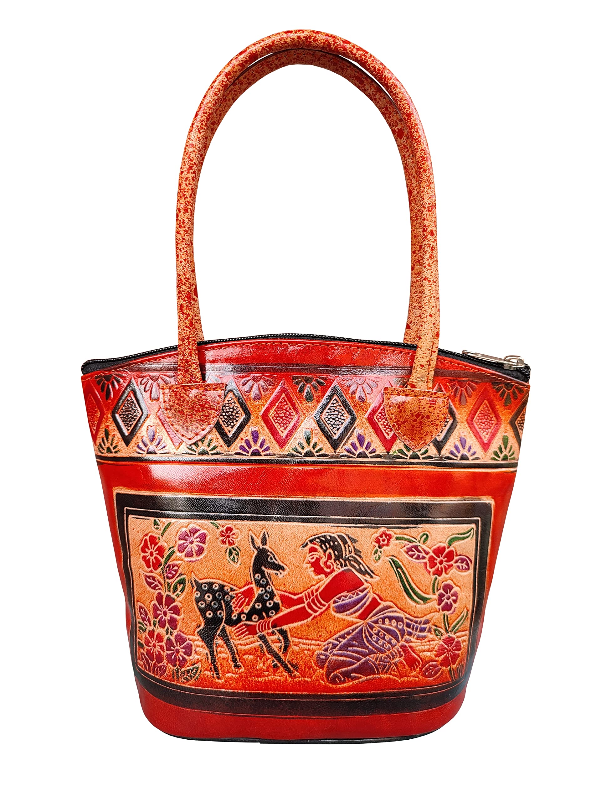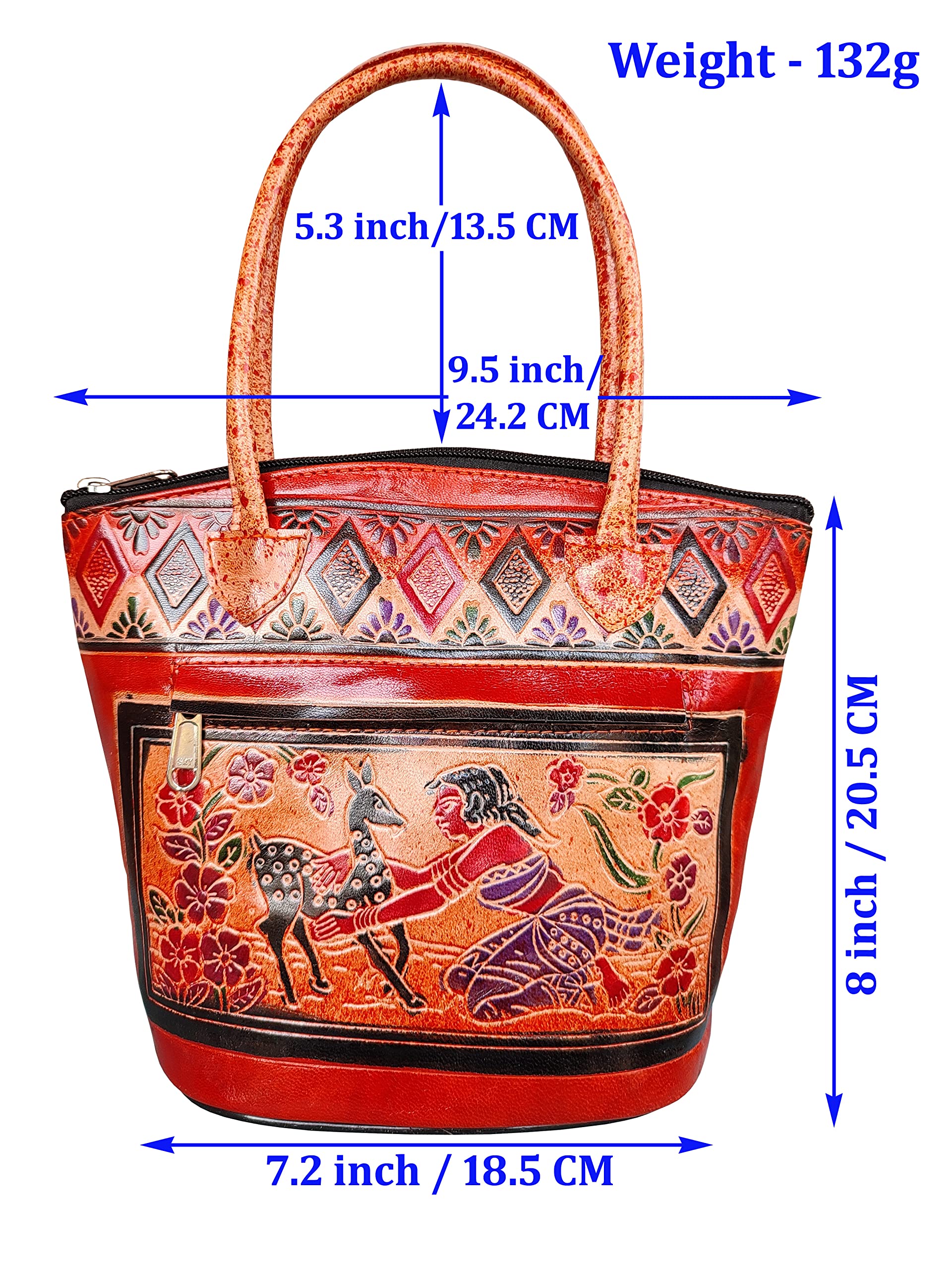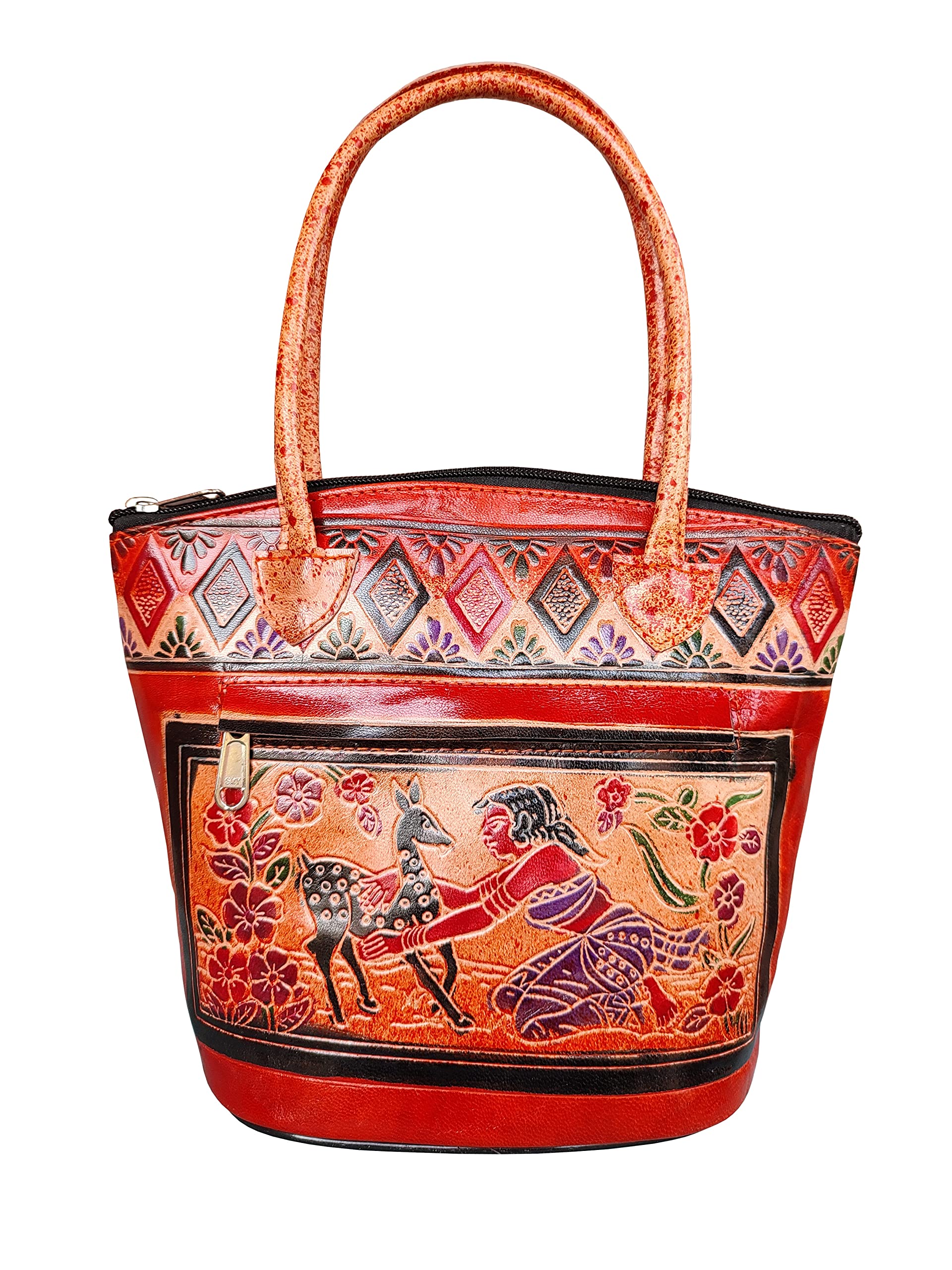 Handcrafted from Genuine Leather a Beautiful Ethnic Art of West Bengal. Design on Both Sides Double Handle One Main Zipper compartment and One zipper Cell phone compartment inside One Zipper pocket in Back. Closes fully with zip. This purse is a classic example of age old Shantiniketan craft which was introduced in West Bengal India during the 1940s. The Shantiniketan style evolved as a result of the Art Movement and these products have now become world famous for their applique batik and embossed craft work. The process of burnishing the leather gives it an elegant sheen and brings out the colors. The major embossing craft is done by hand and is an intricate process. After the final leather made it is then stitched into the desired product coated with a lacquer finish for making the product shiny and long lasting. We are happy for your interest SHANTINIKETAN EMBOSSED LEATHER PRODUCTS and artist of Shantinikan thanks to you.