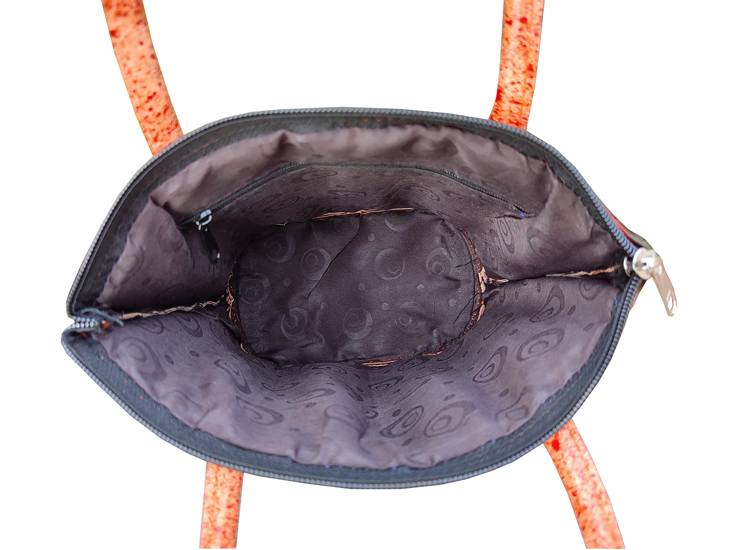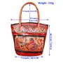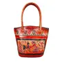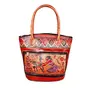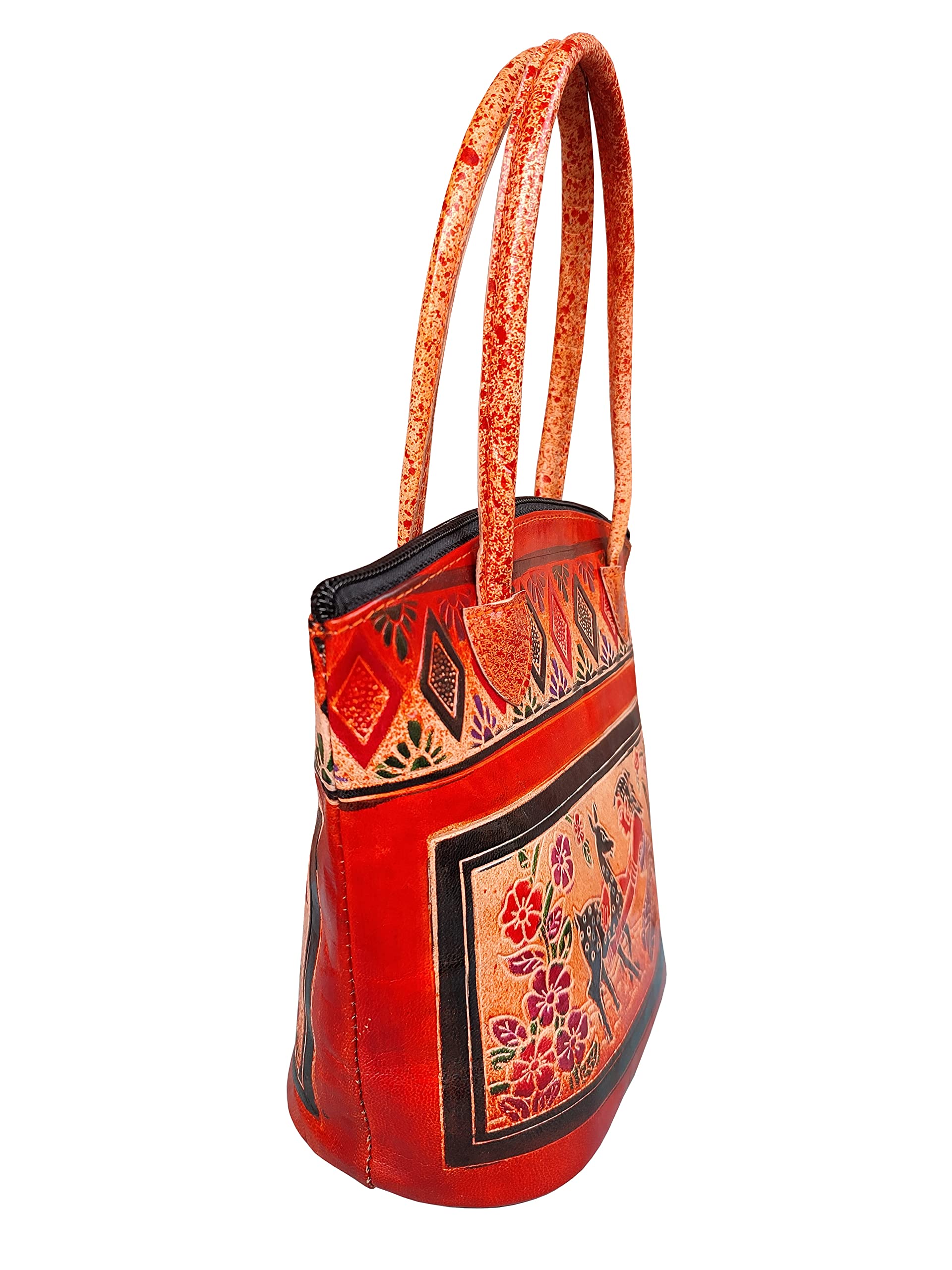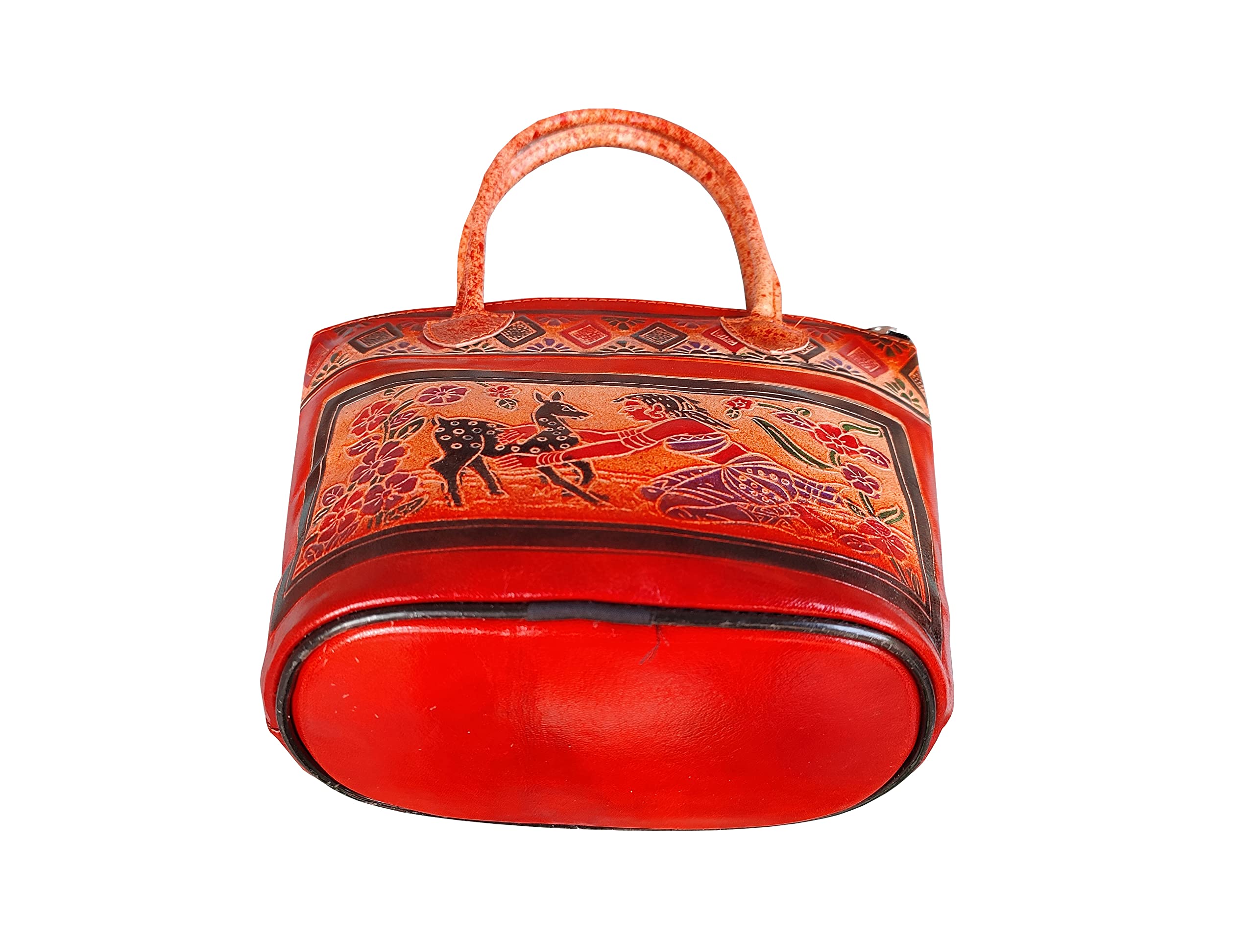 Handcrafted from Genuine Leather a Beautiful Ethnic Art of West Bengal. Design on Both Sides Double Handle One Main Zipper compartment and One zipper Cell phone compartment inside One Zipper pocket in Back. Closes fully with zip. This purse is a classic example of age old Shantiniketan craft which was introduced in West Bengal India during the 1940s. The Shantiniketan style evolved as a result of the Art Movement and these products have now become world famous for their applique batik and embossed craft work. The process of burnishing the leather gives it an elegant sheen and brings out the colors. The major embossing craft is done by hand and is an intricate process. After the final leather made it is then stitched into the desired product coated with a lacquer finish for making the product shiny and long lasting. We are happy for your interest SHANTINIKETAN EMBOSSED LEATHER PRODUCTS and artist of Shantinikan thanks to you.