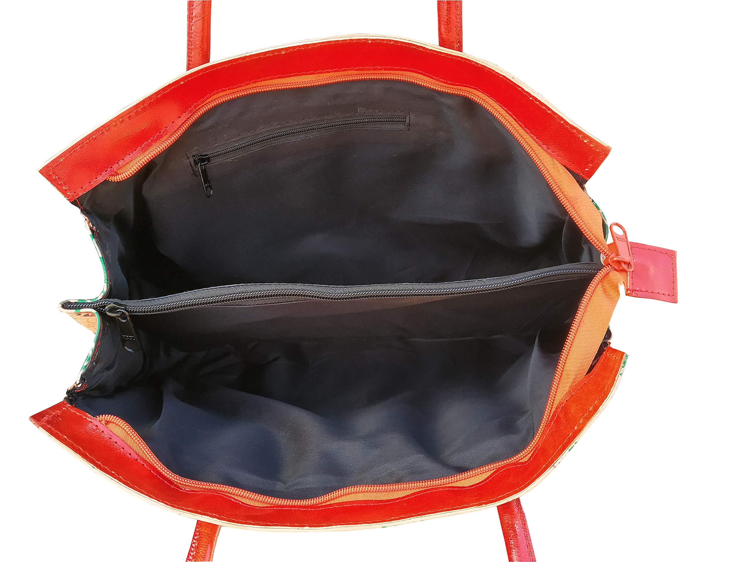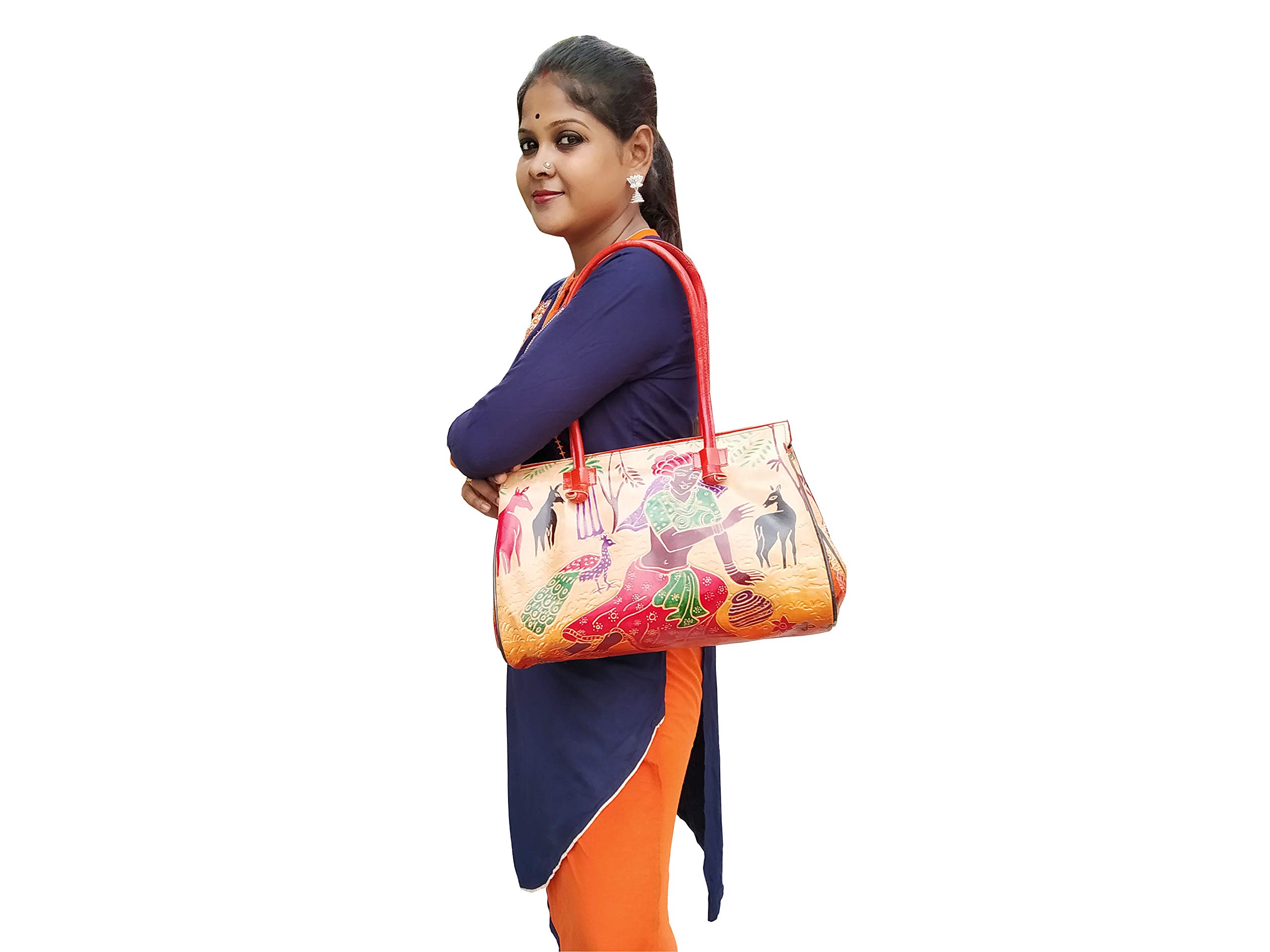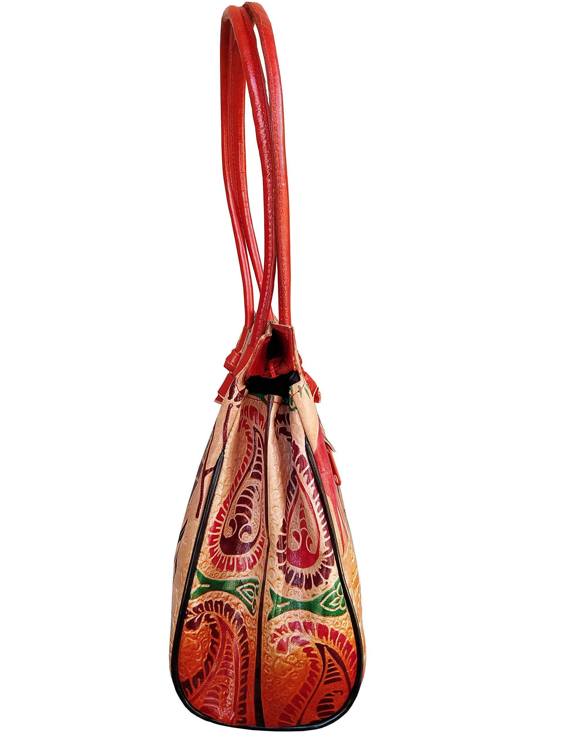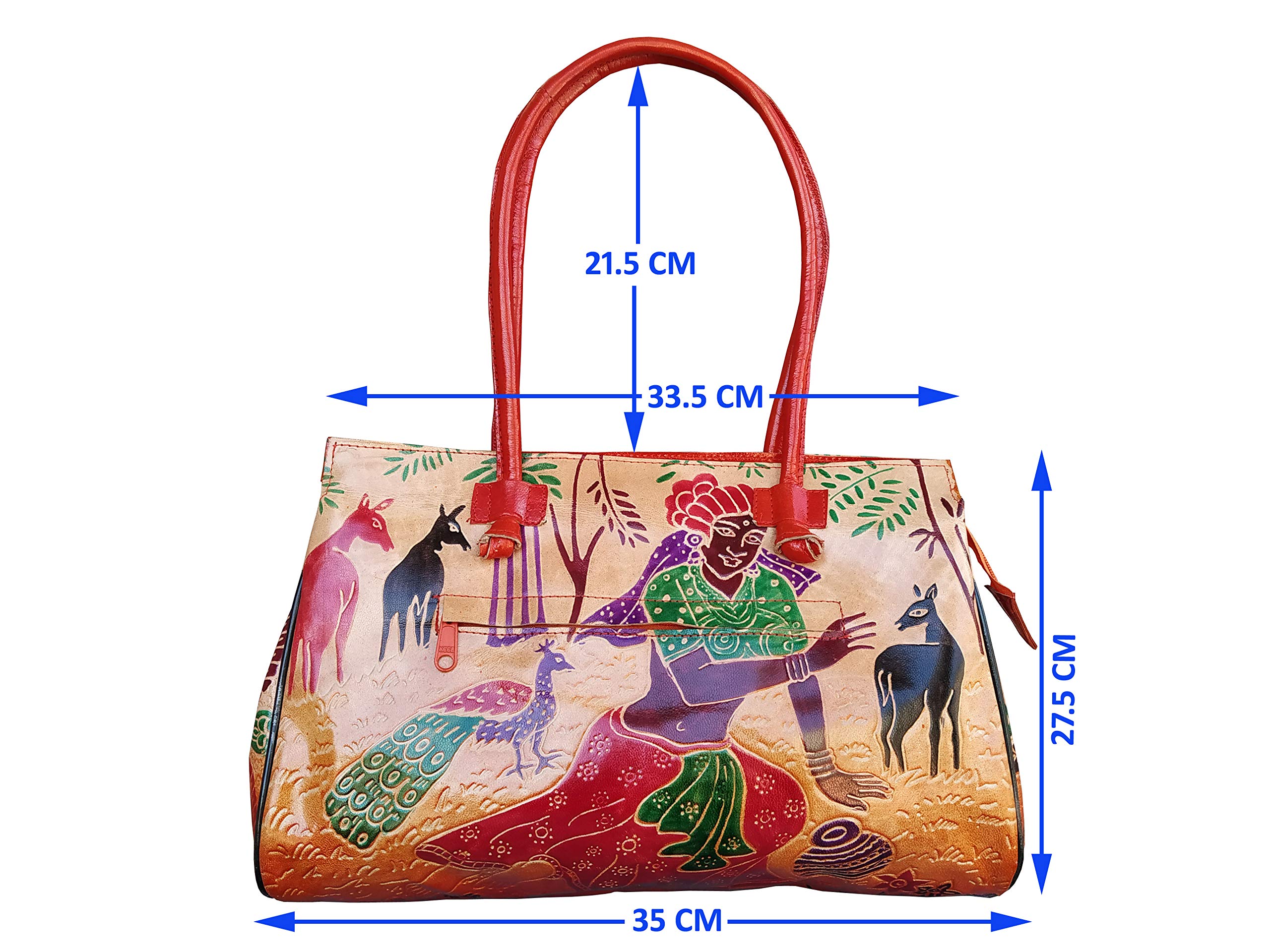 Handcrafted from 100% Genuine Leather a Beautiful Ethnic Art of West Bengal.Design on Both Sides Double Shoulder Tote Handle One Main Zipper compartment One Zipper pocket in Back and Three Compartments inside Two zipper and One open cell phone compartment.Closes fully with zip. Traditional Block print. This purse is a classic example of age old Shantiniketan craft which was introduced in West Bengal India during the 1940s. The traditional motifs used for these Shantiniketan bags depict the rich cultural heritage of India. It derives its name from the place where it was first introduced - Shantiniketan and was patronized by Nobel Laureate Rabindra Nath Tagore who revived a number of crafts that were nearing redundancy in Shantiniketan.The Shantiniketan style evolved as a result of the Art Movement and these products have now become world famous for their applique batik and embossed craft work. The process of burnishing the leather gives it an elegant sheen and brings out the colors. The major embossing craft is done by hand and is an intricate process. After the final leather made it is then stitched into the desired product coated with a lacquer finish for making the product shiny and long lasting.