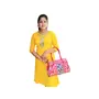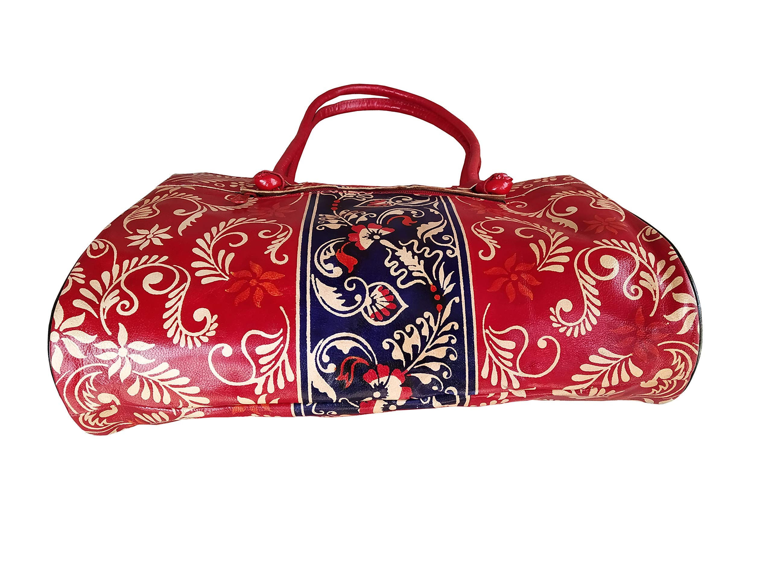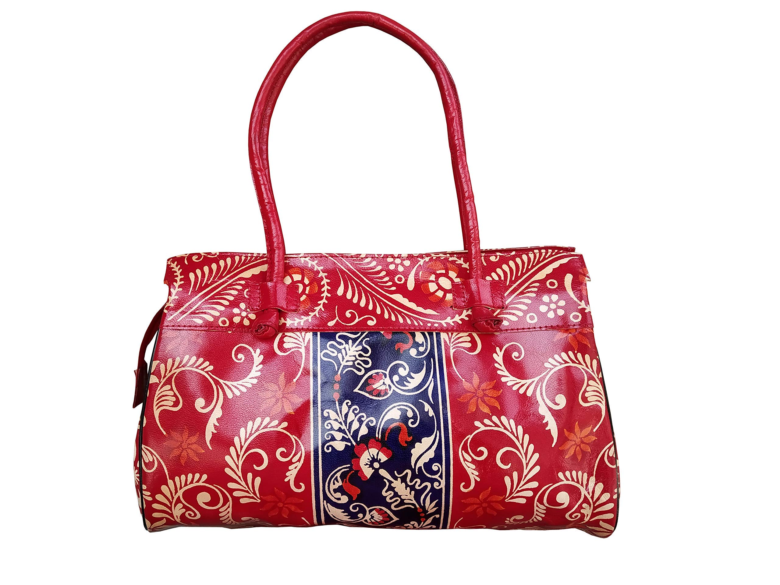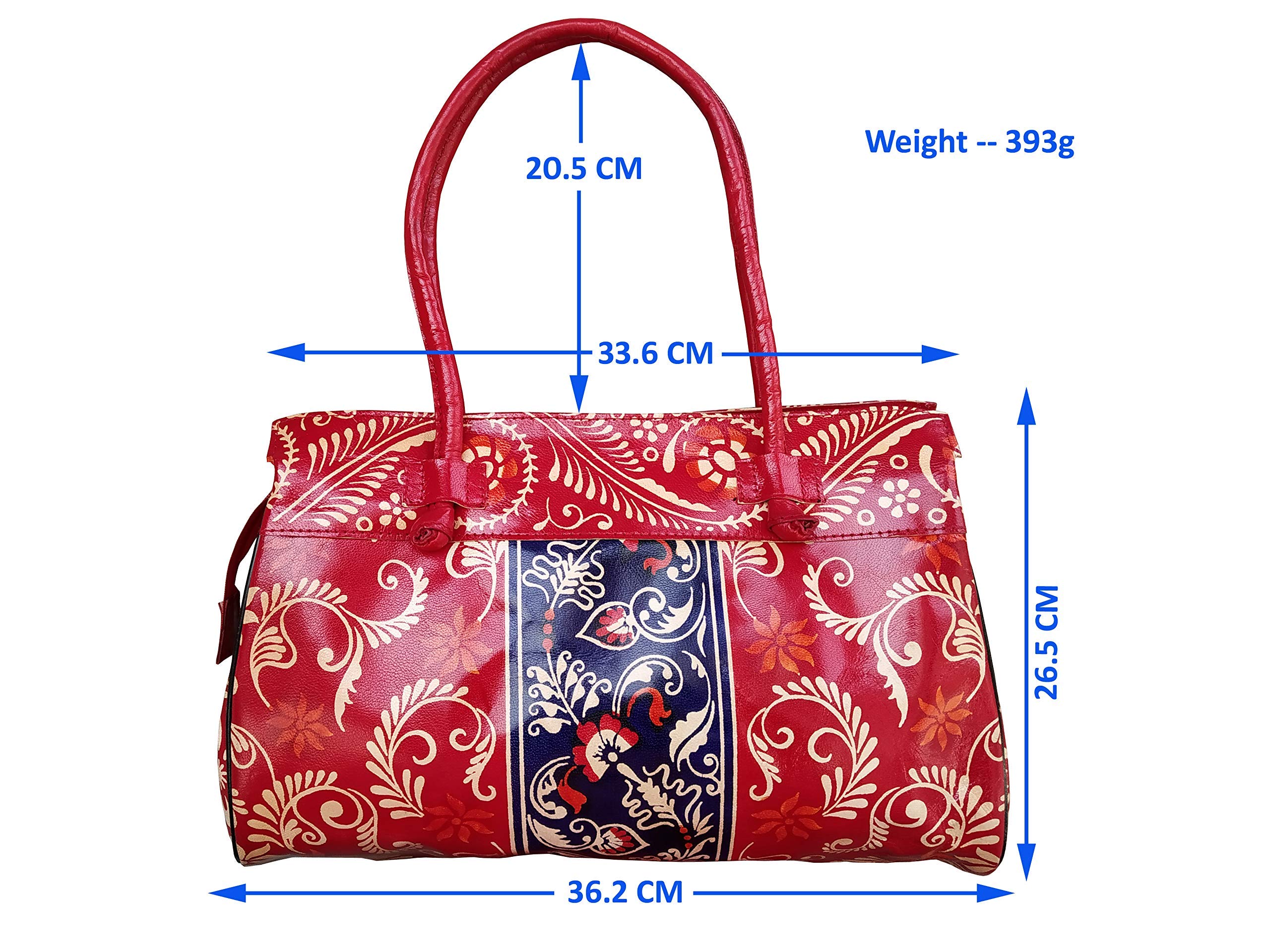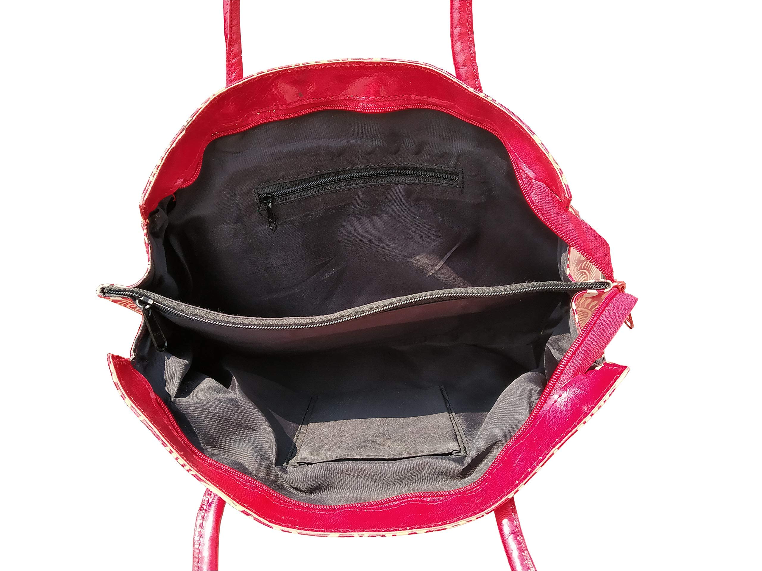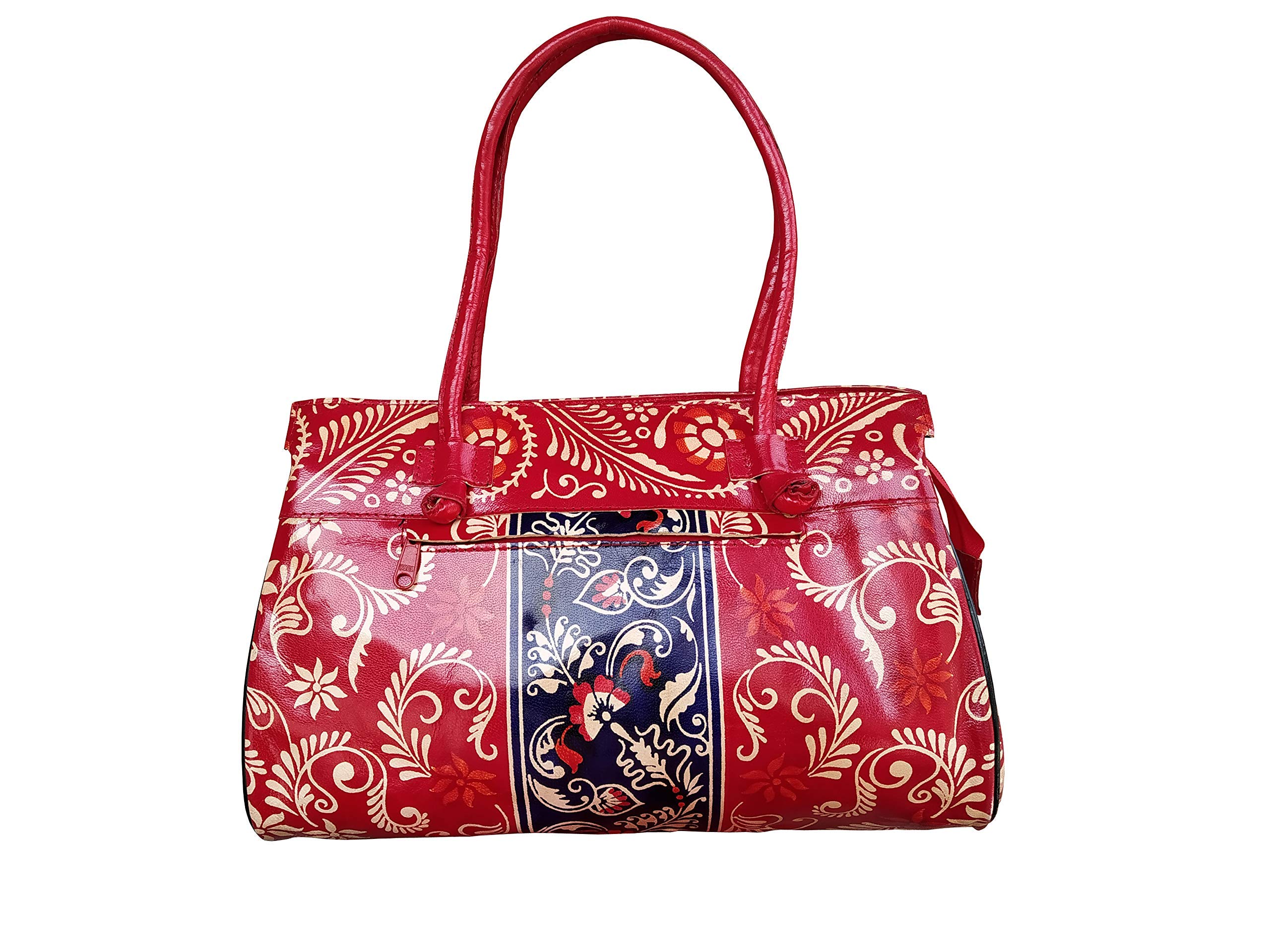 Handcrafted from 100% Genuine Leather a Beautiful Ethnic Art of West Bengal. Design on Both Sides Double Shoulder Tote Handle One Main Zipper compartment One Zipper pocket in Back and Three Compartments inside Two zipper and One open cell phone compartment. Closure: Zip and magnetic button. Traditional Batik print. This purse is a classic example of age old Shantiniketan craft which was introduced in West Bengal India during the 1940s. The traditional motifs used for these Shantiniketan bags depict the rich cultural heritage of India. It derives its name from the place where it was first introduced - Shantiniketan and was patronized by Nobel Laureate Rabindra Nath Tagore who revived a number of crafts that were nearing redundancy in Shantiniketan.The Shantiniketan style evolved as a result of the Art Movement and these products have now become world famous for their appliqu batik and embossed craft work. The process of burnishing the leather gives it an elegant sheen and brings out the colors. The major embossing craft is done by hand and is an intricate process. After the final leather made it is then stitched into the desired product coated with a lacquer finish for making the product shiny and long lasting.