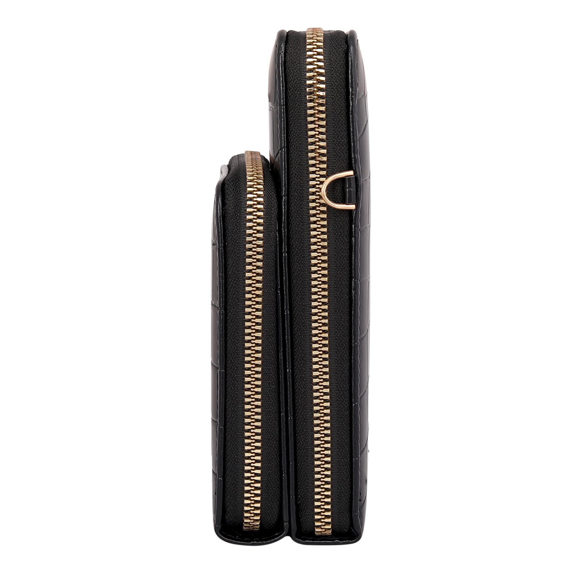 Made of high quality croc embossed PU this Lino Perros black women sling bag is stylish durable and light weight. It has 2 zippered compartments with adjustable sling strap. The main compartment has adequate space for keeping mobile phone lipstick and sanitizer and so on along with 6 card holder pockets. The gold finished trims add to its elegance. The Lino Perros is known for their excellent quality and design.