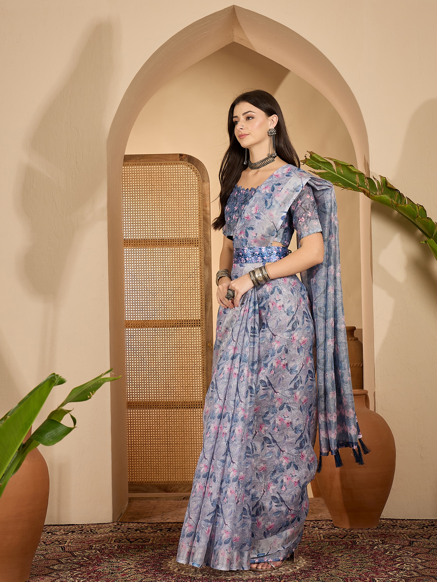 • Saree Fabric-Linen Zari Silver ,Blouse Fabric-Linen Zari Silver