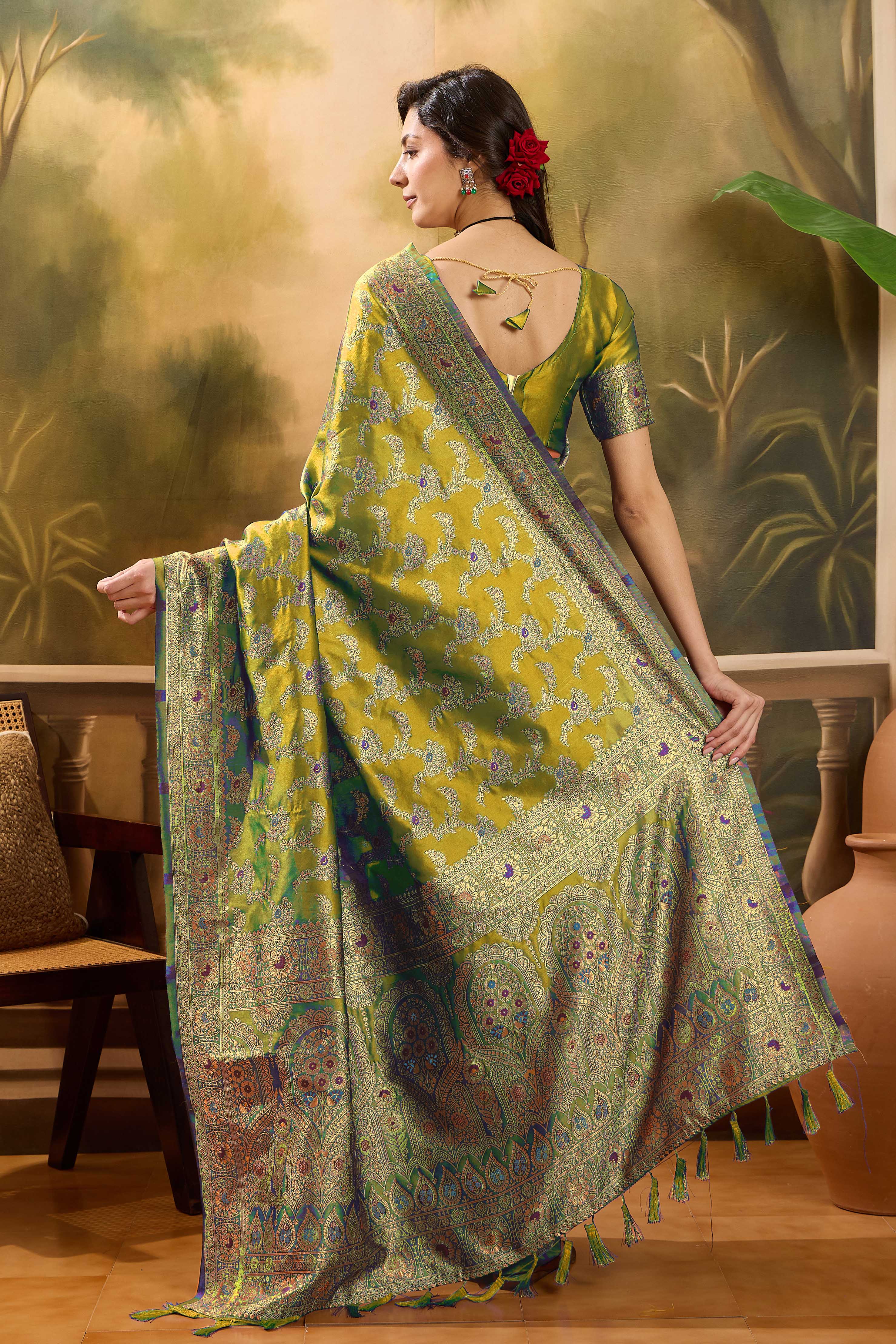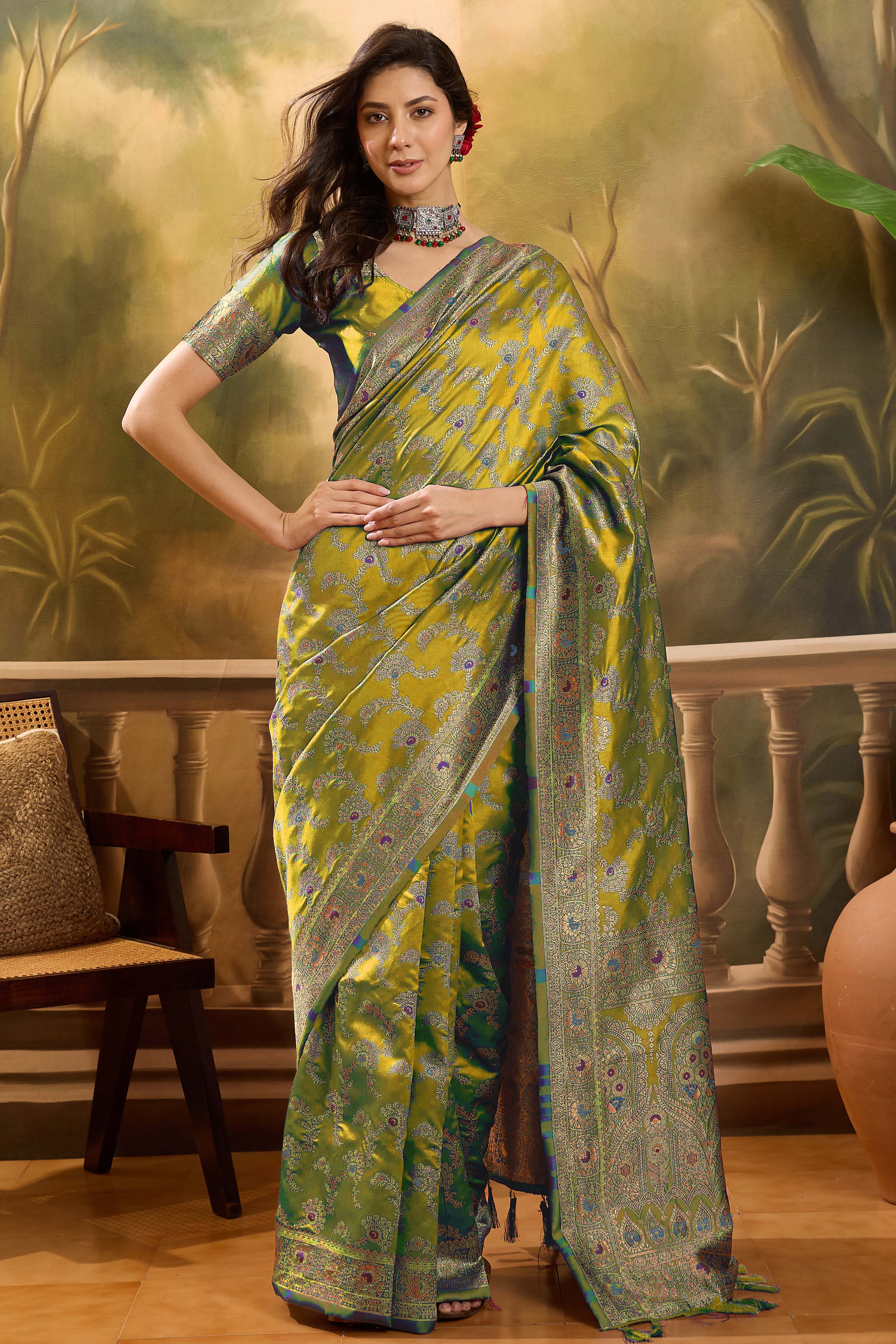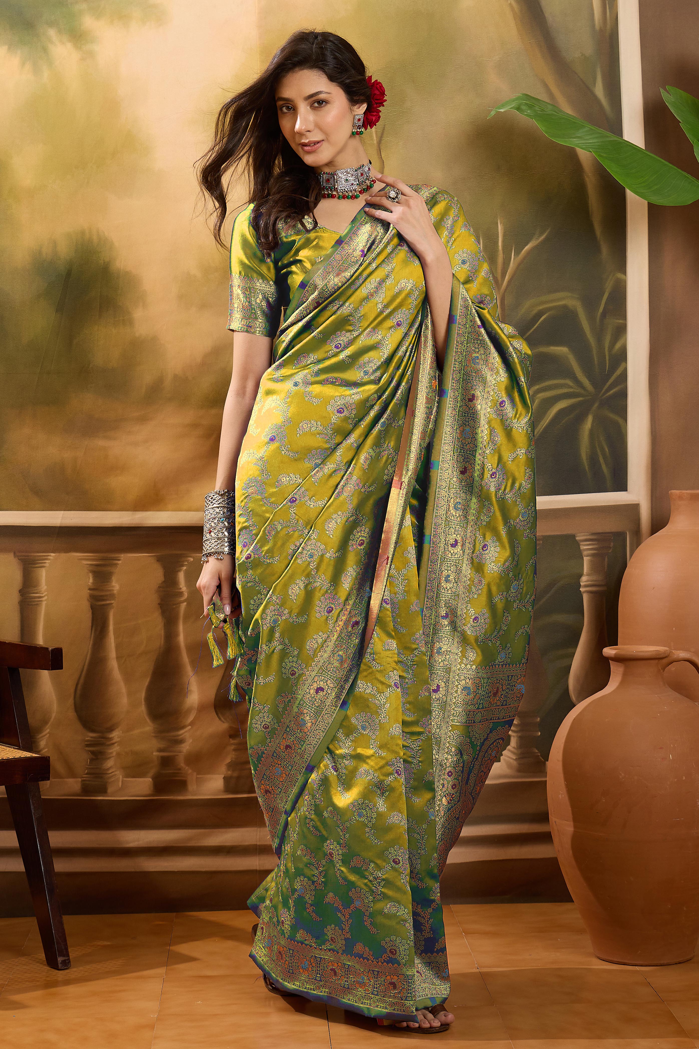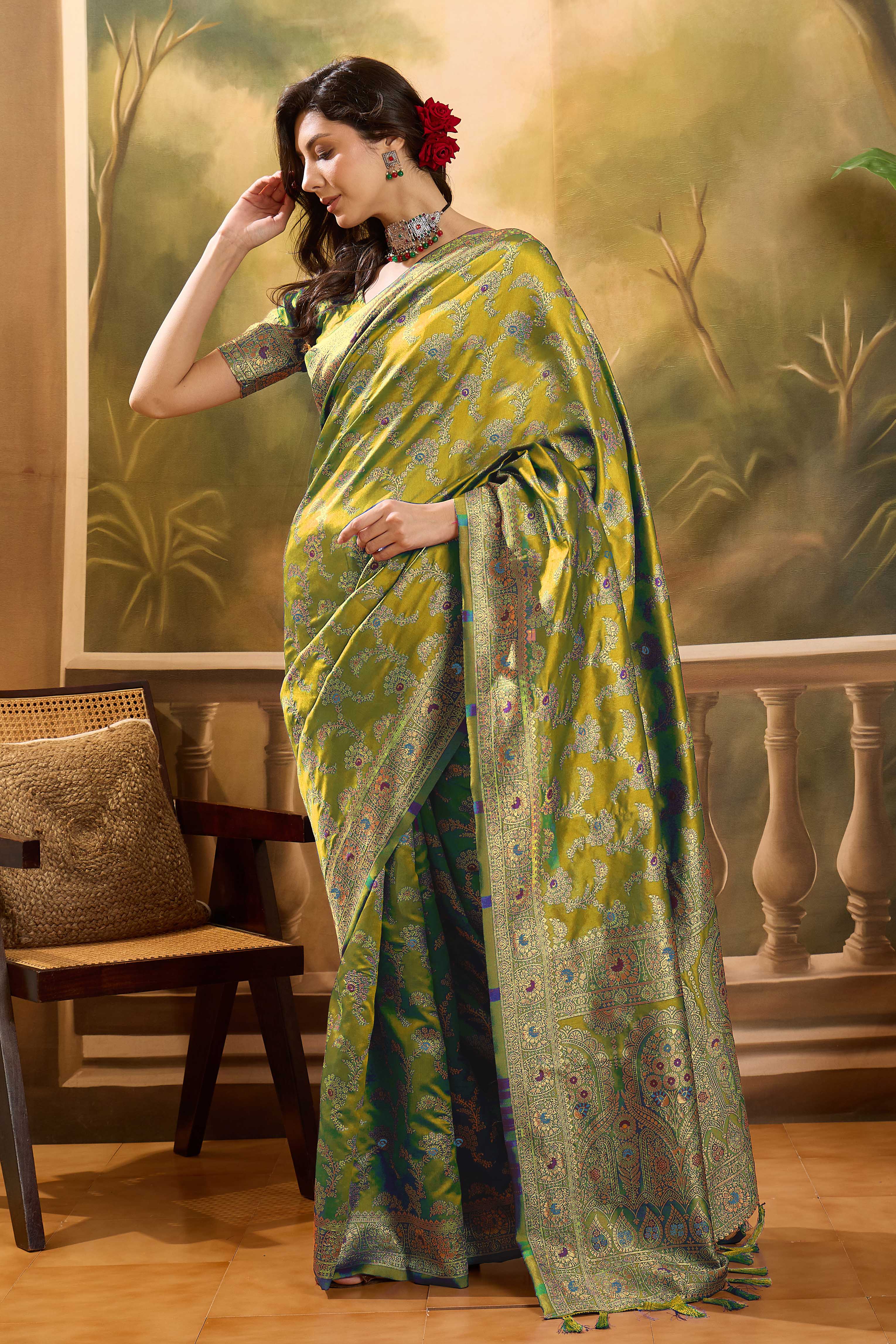 Fashion Dream Womens Lime Green Banarasi Jacquard Saree | Soft & Elegant Traditional Wear