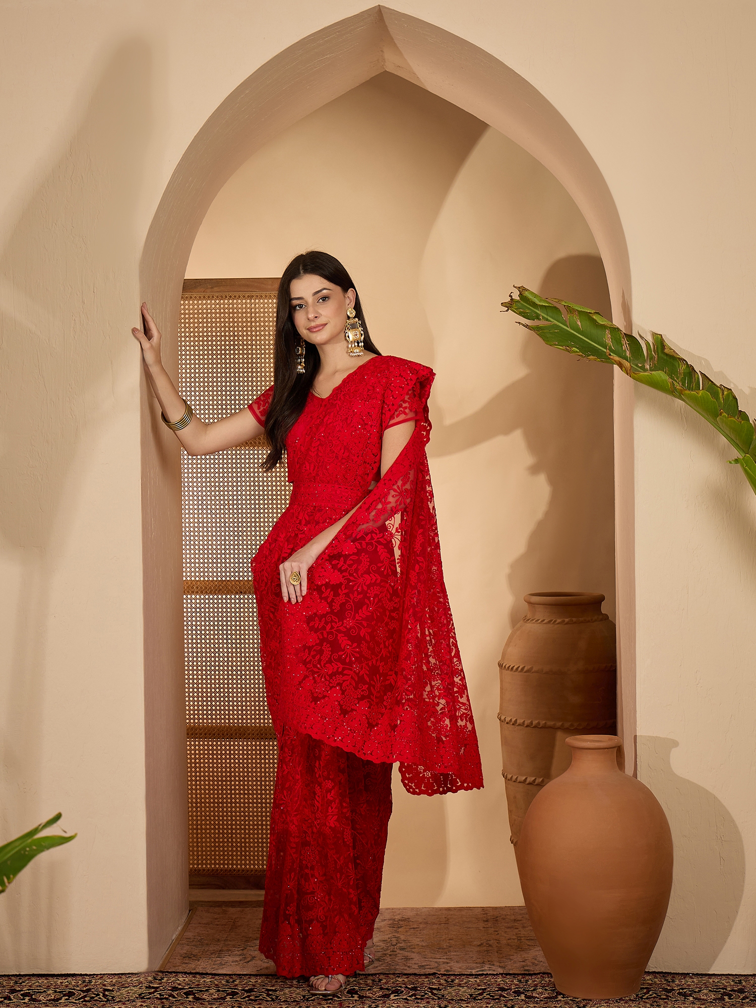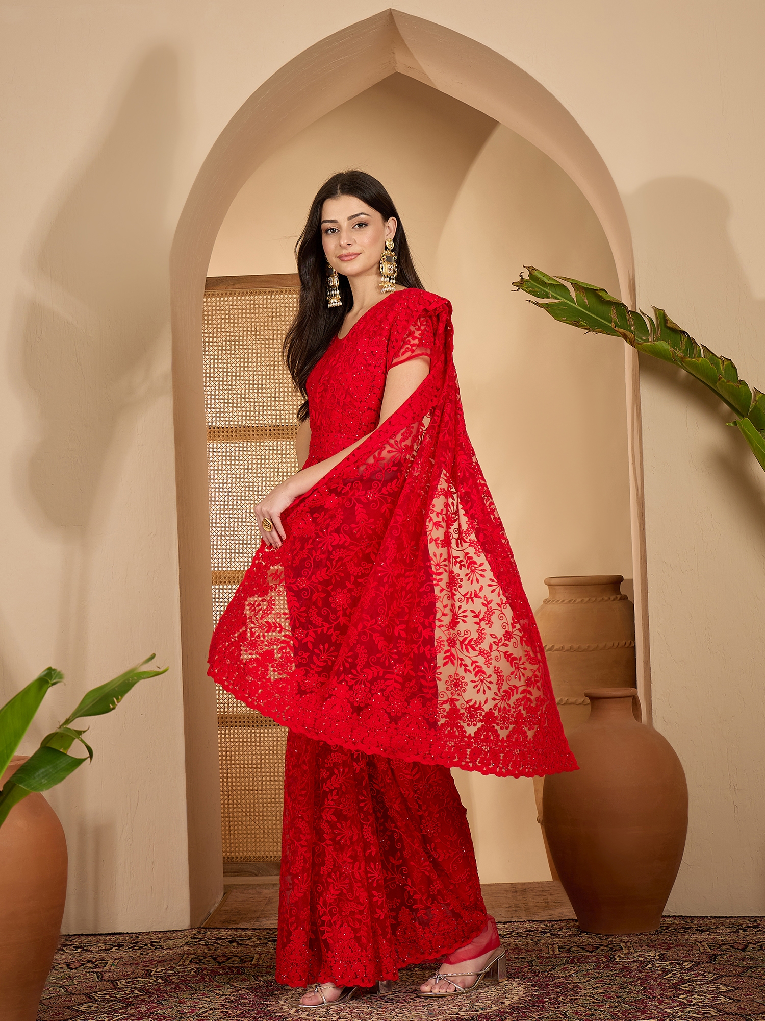 Fashion Dream Womens Red Heavy Net Saree | Soft & Elegant Traditional Wear