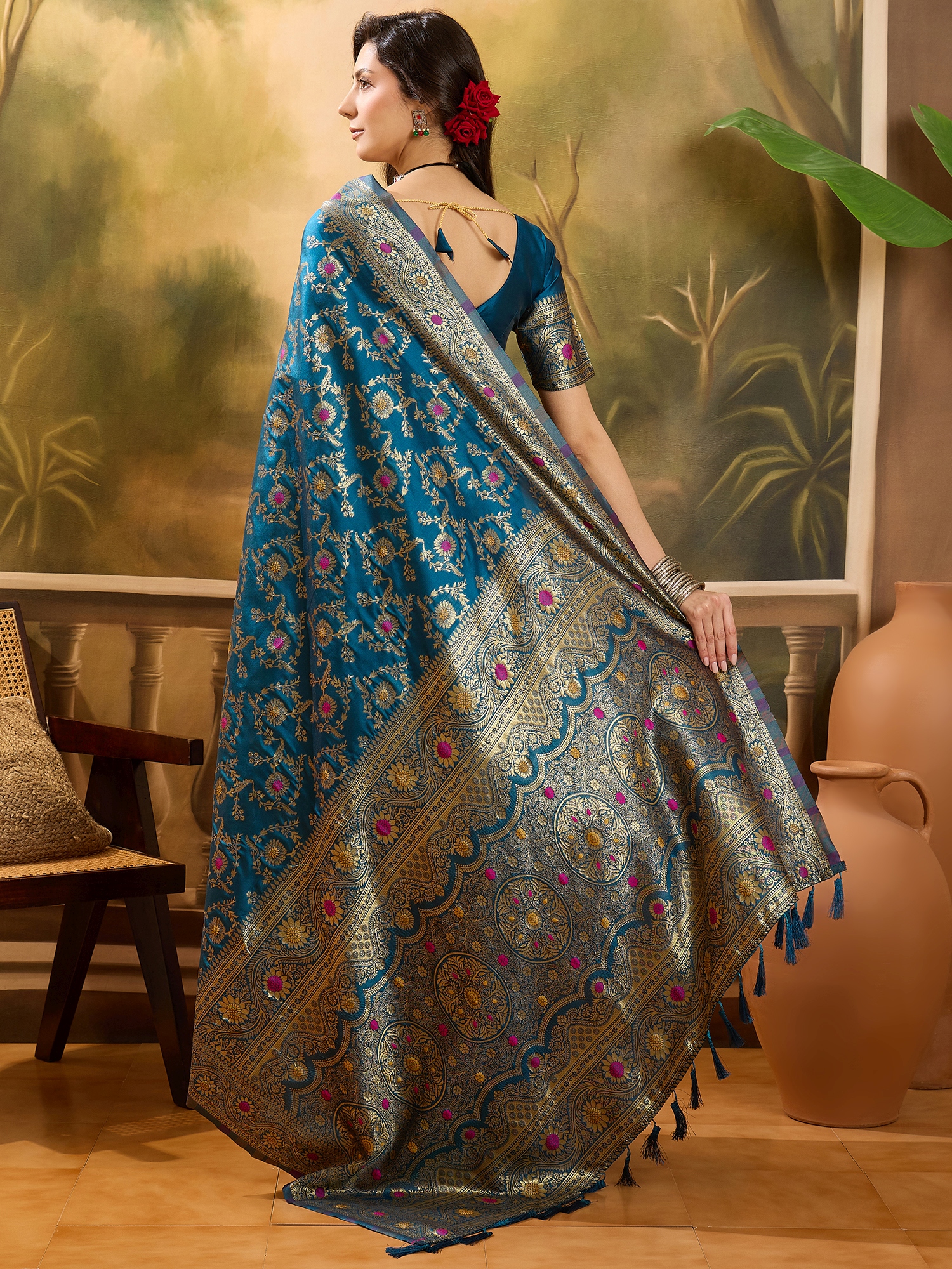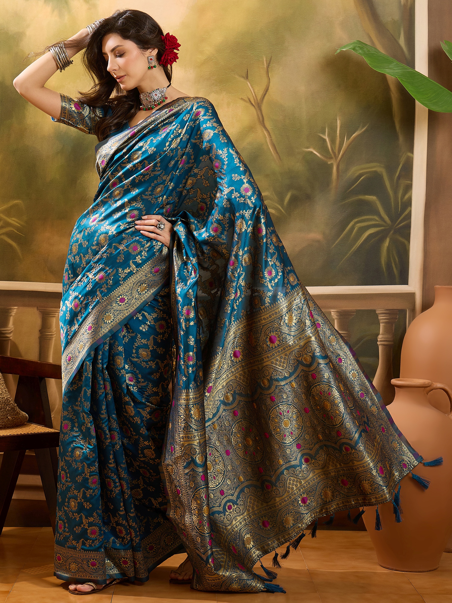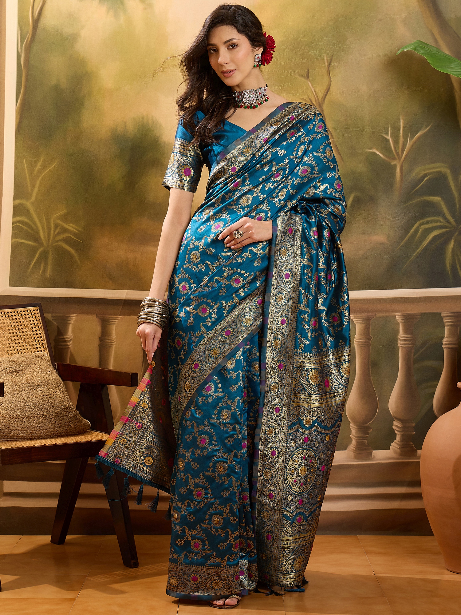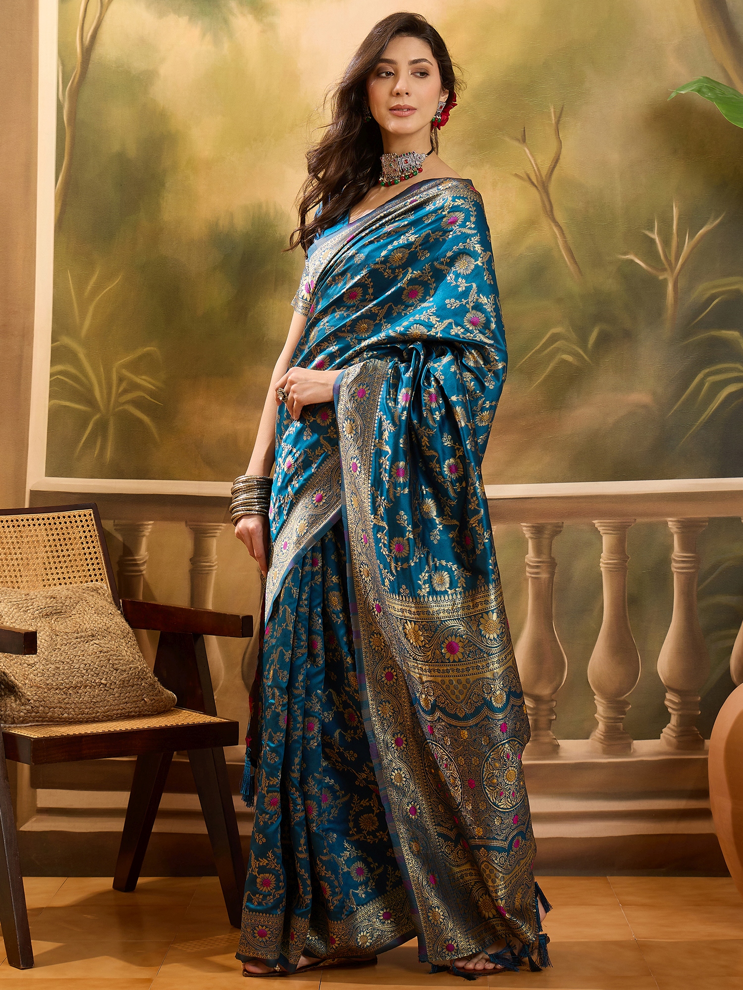 Fashion Dream Womens Teal Blue Banarasi Jacquard Saree | Soft & Elegant Traditional Wear
