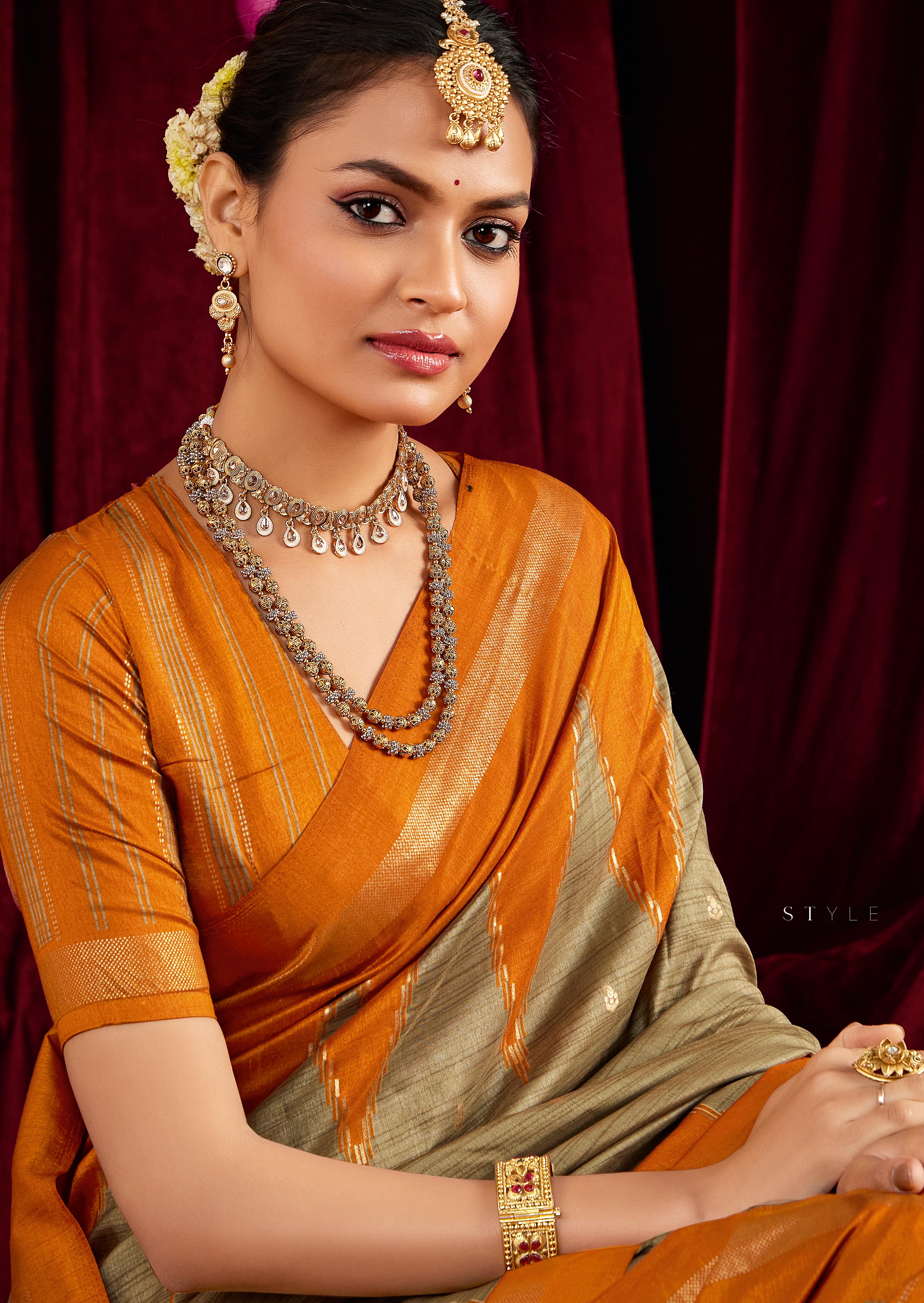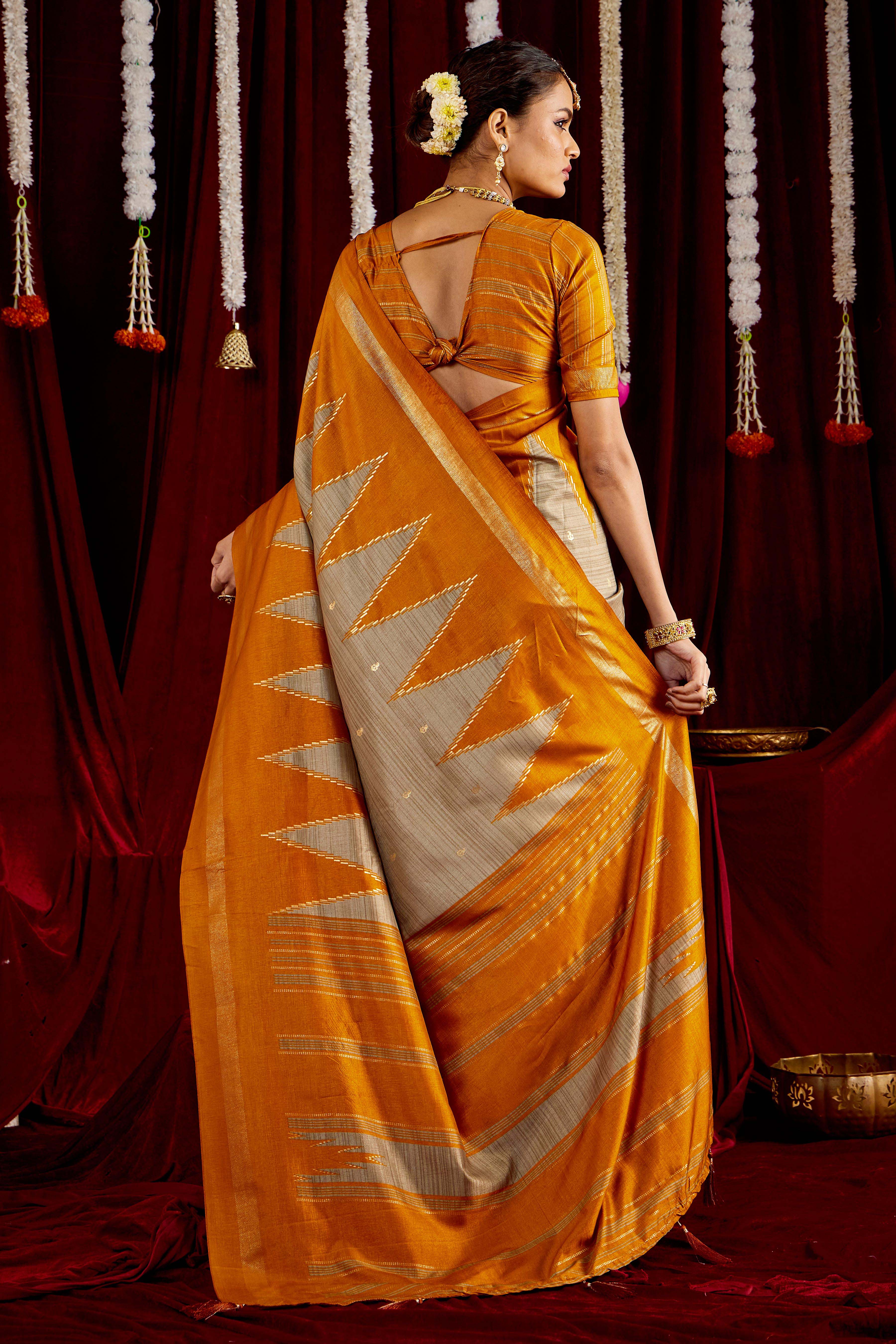 Beige & Orange Color Ikkat Silk Fabric Designer Zig Zag Printed Traditional Party Looks Saree
