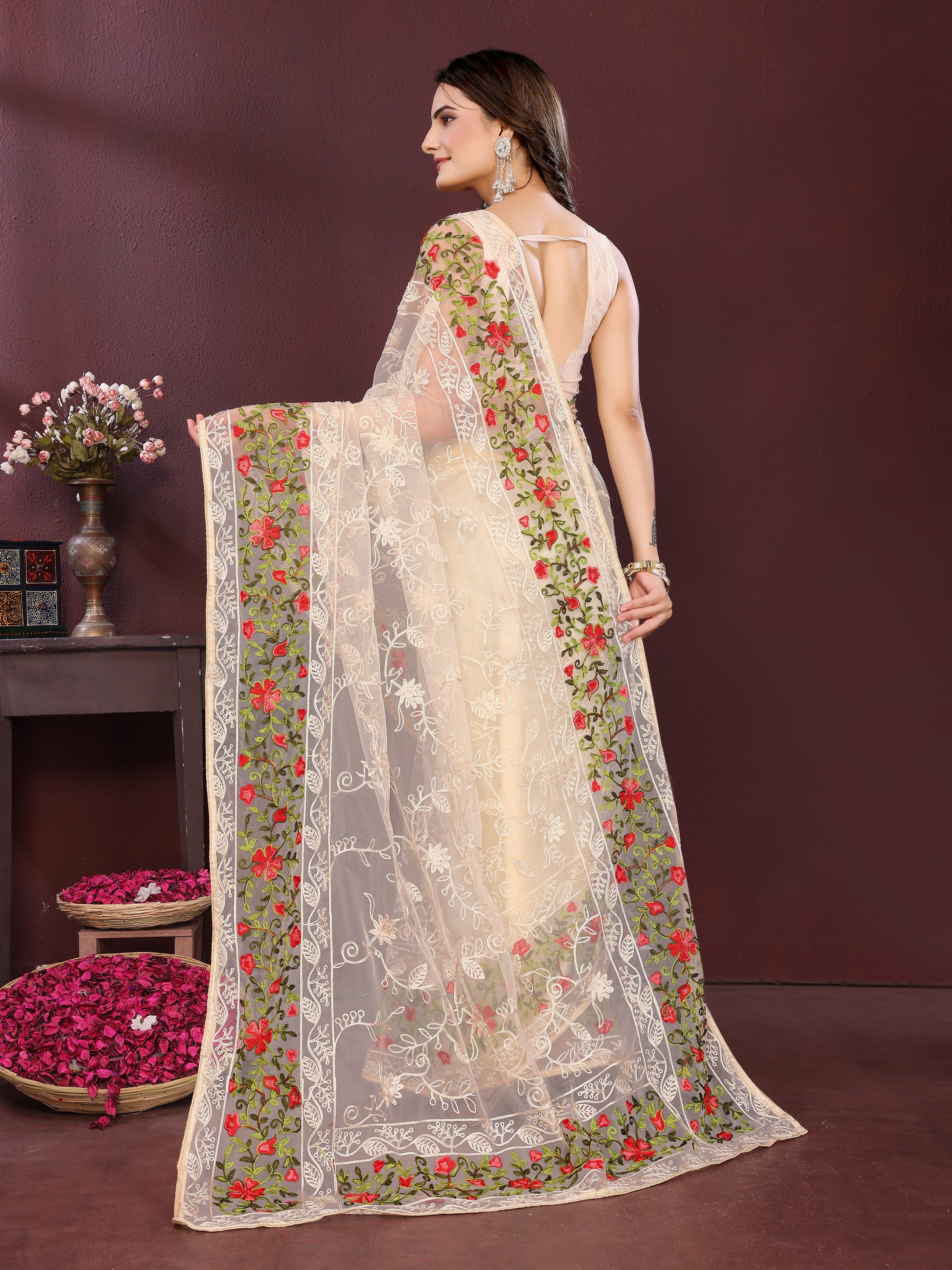 Beige Color Net Fabric Designer Embroidery Work Ethnic Partywear Saree