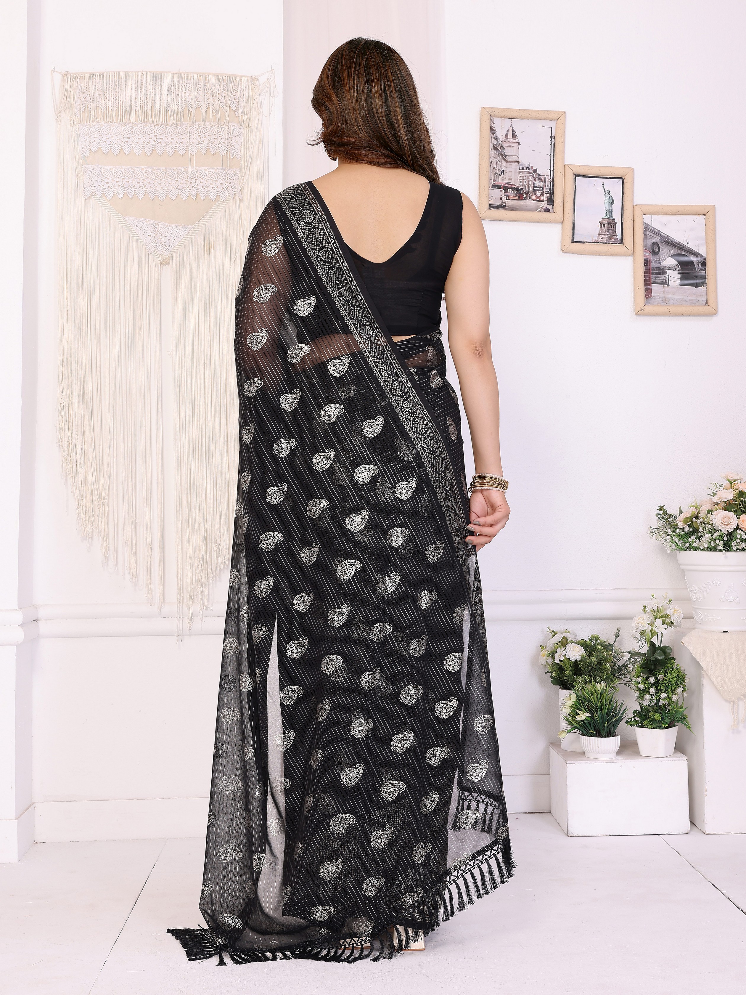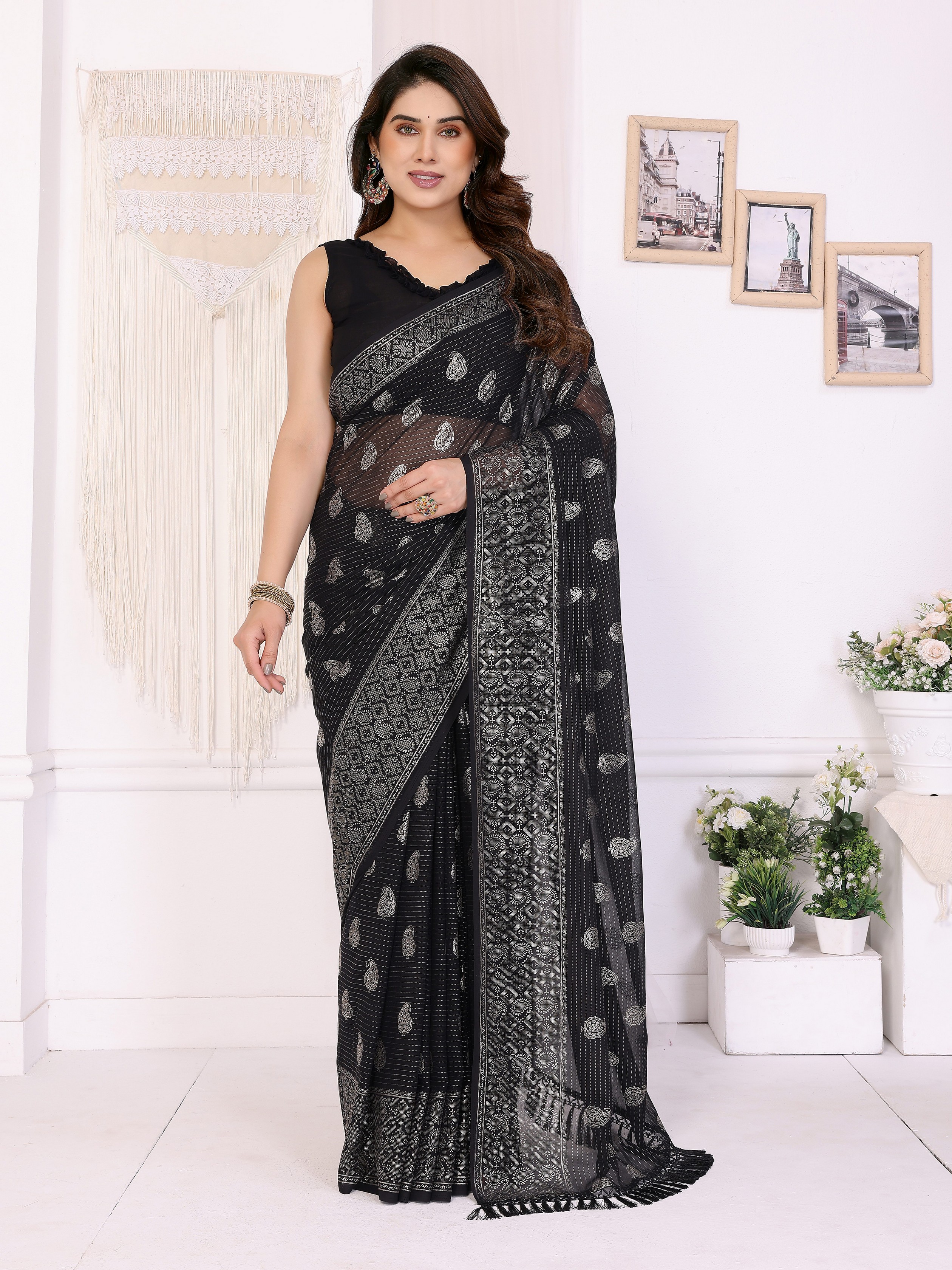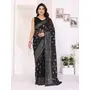 Black Color Georgette Fabric Designer Foil Printed Ceremonial Saree