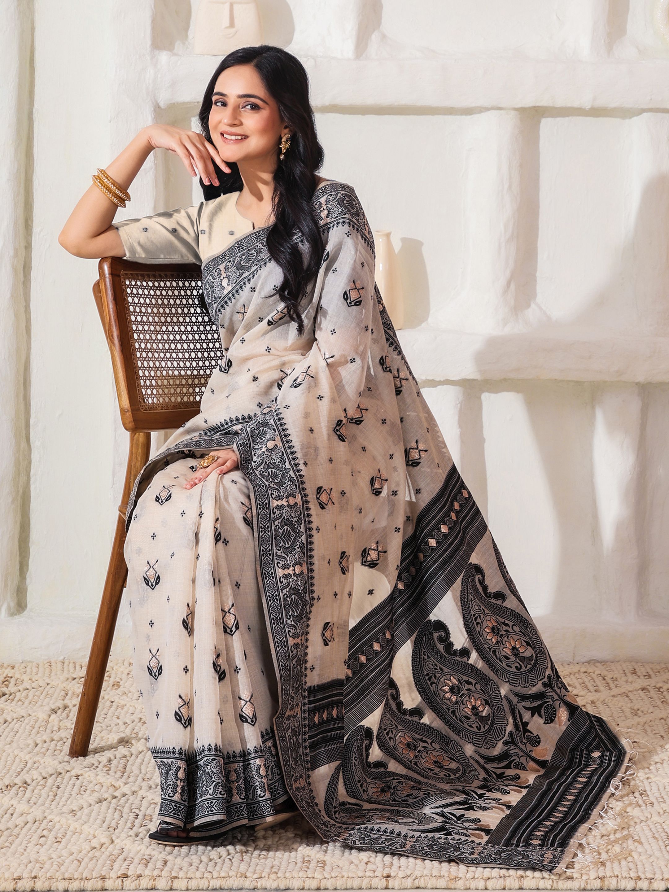 Black Color Linen Cotton Ethnic Festive Wear Traditional Saree