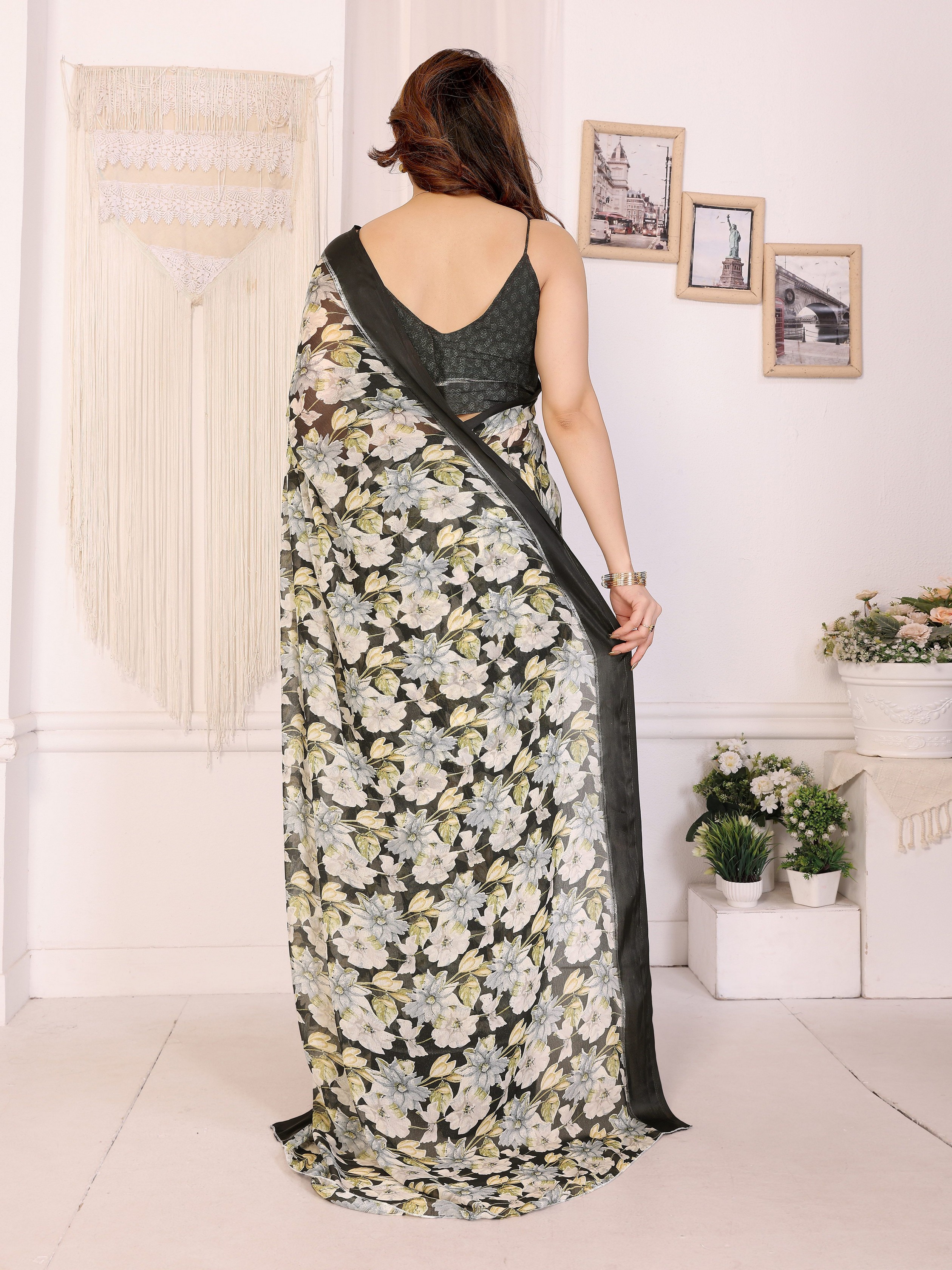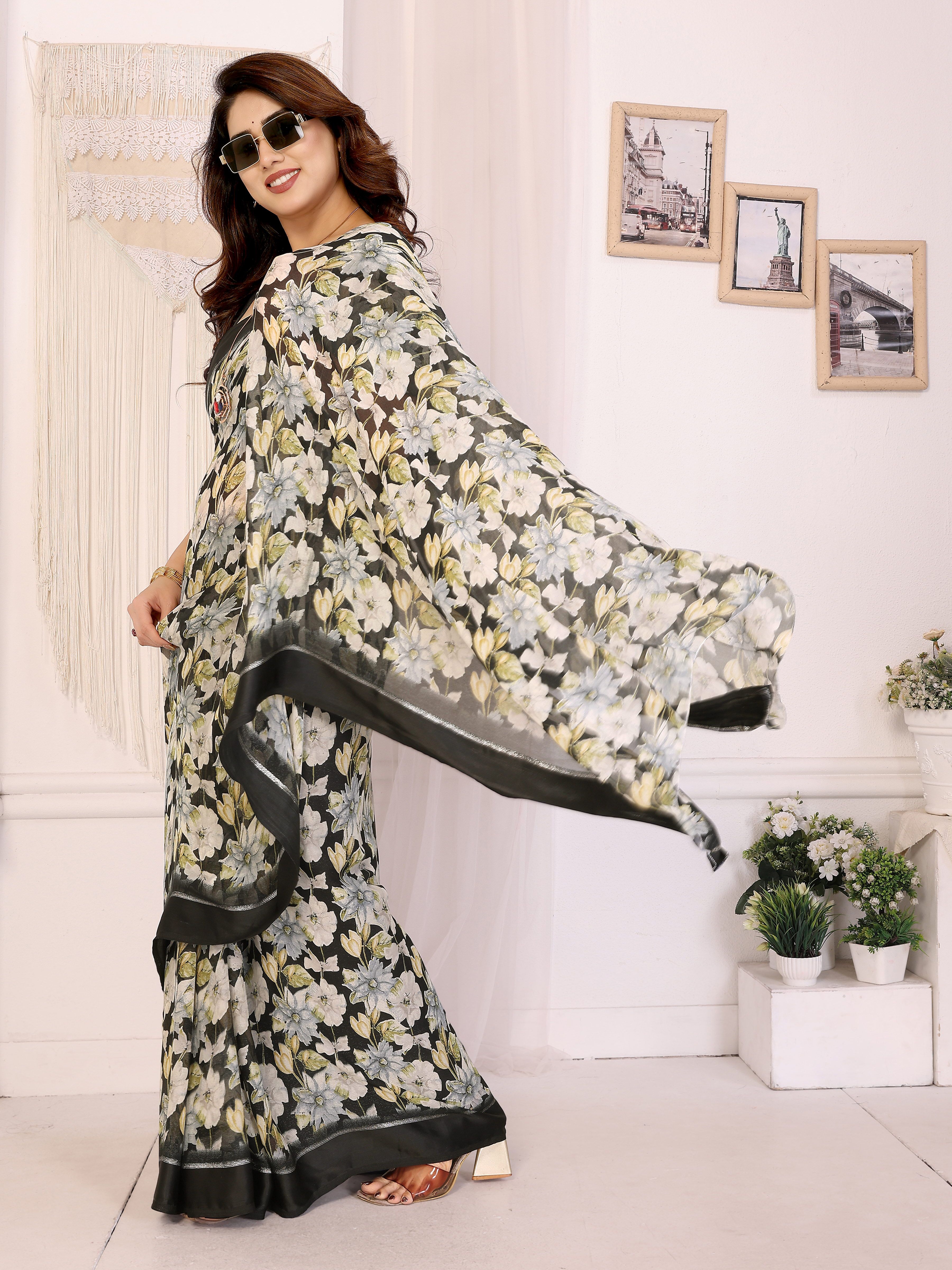 Black Color Moss Satin Patta Designer Flower Printed Ceremonial Saree