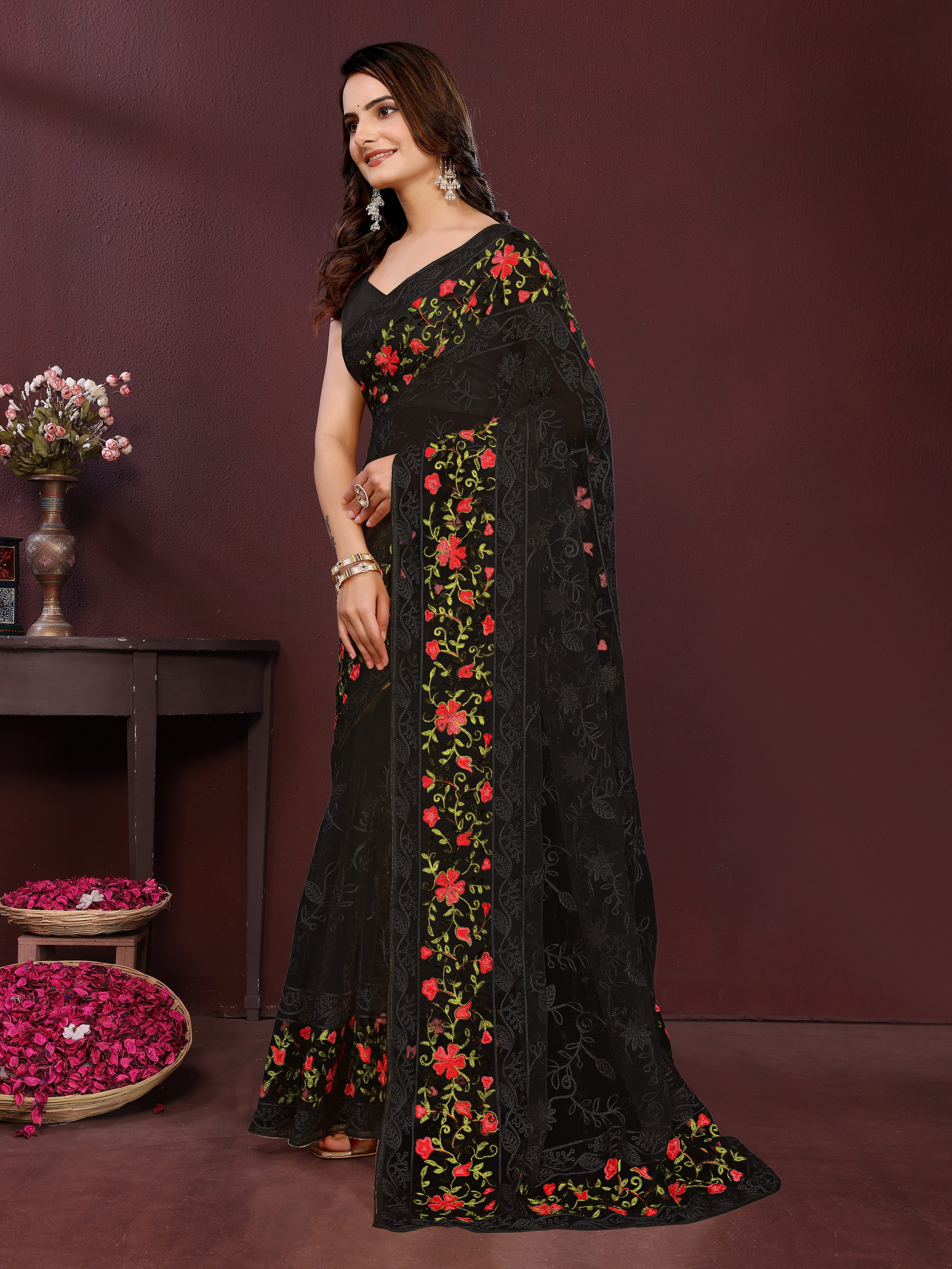 Black Color Net Fabric Designer Embroidery Work Ethnic Partywear Saree