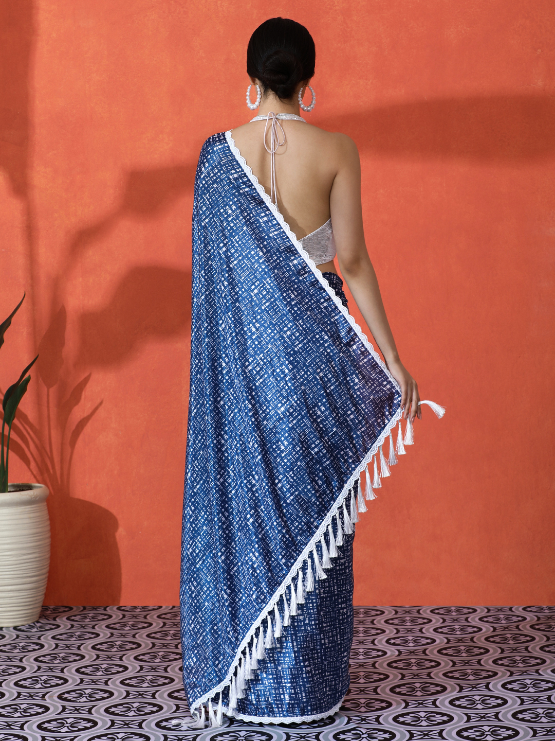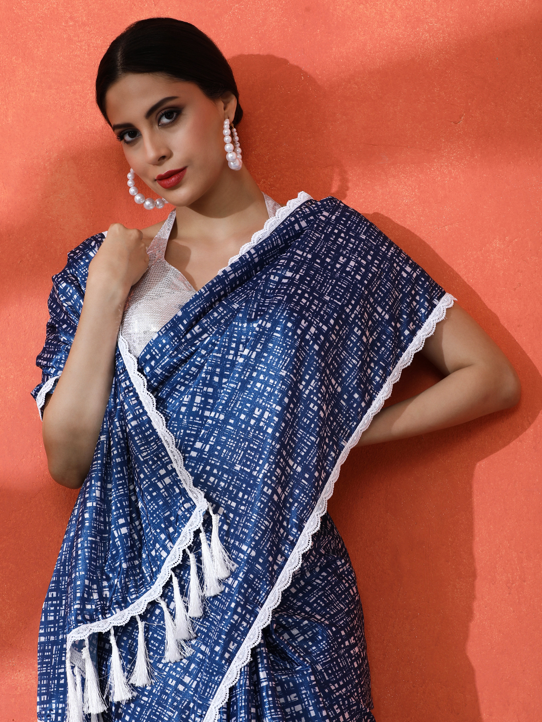Blue Color Chinon Fabric Designer Digital Printed Saree For Ceremonial Looks