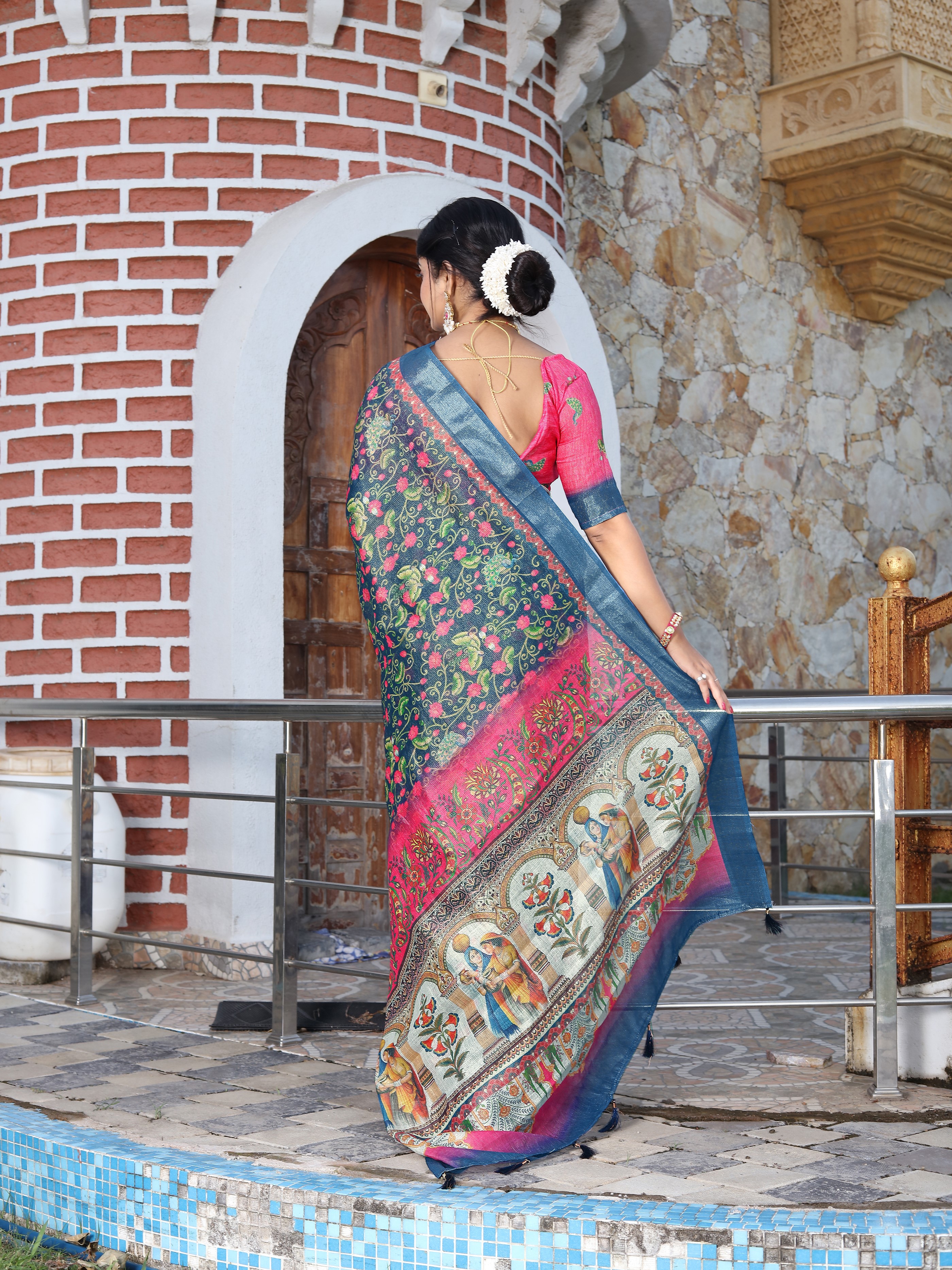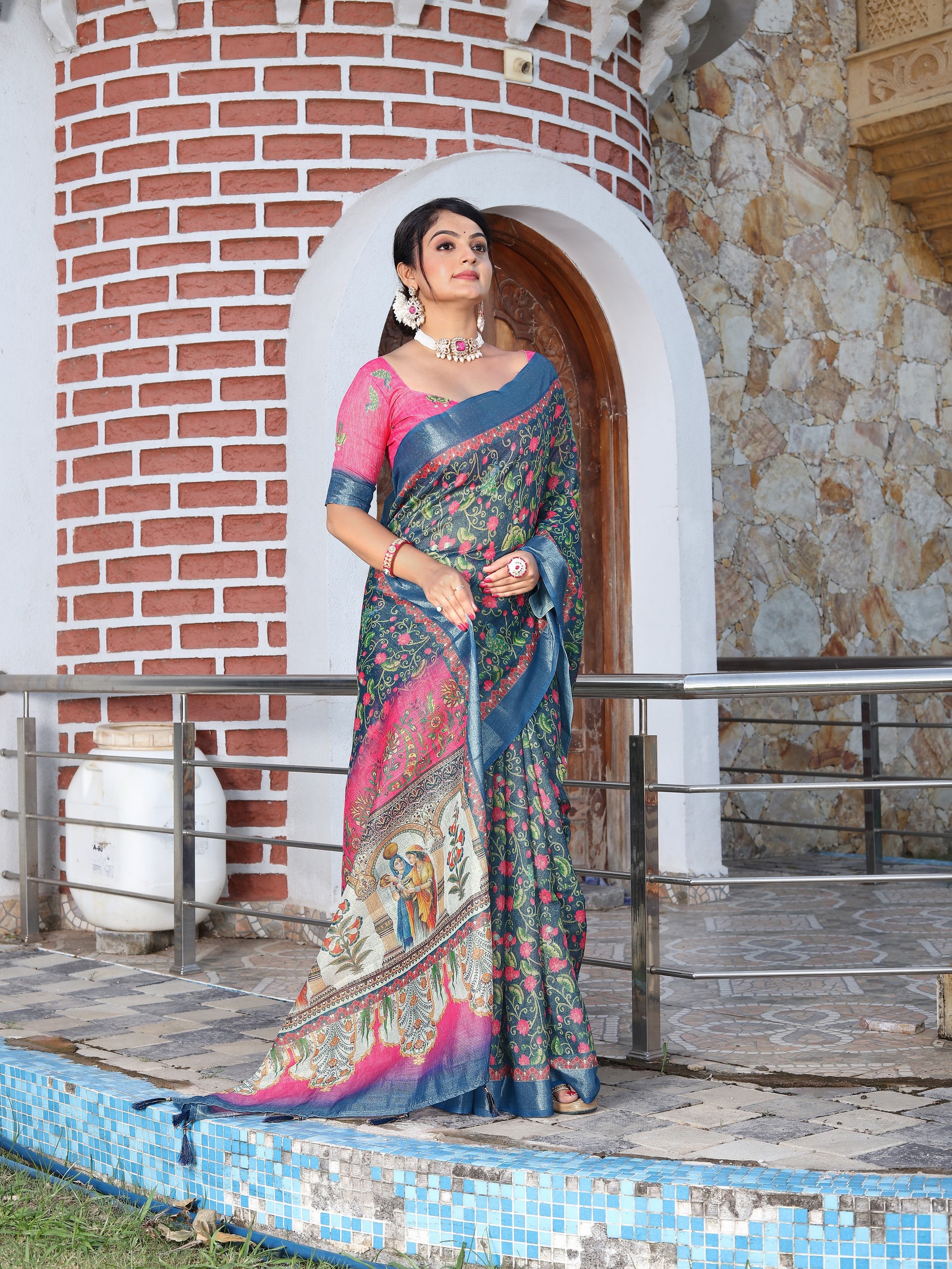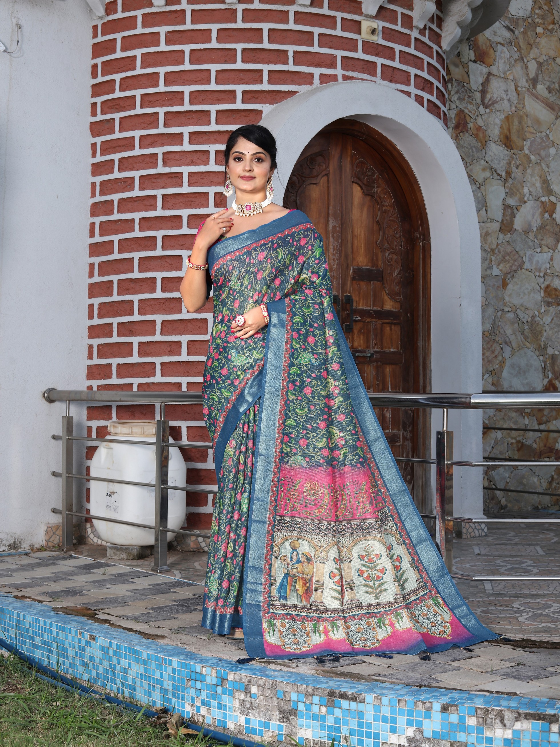 Blue Color Cotton Shimmer Fabric Smart Printed Saree With Woven Border