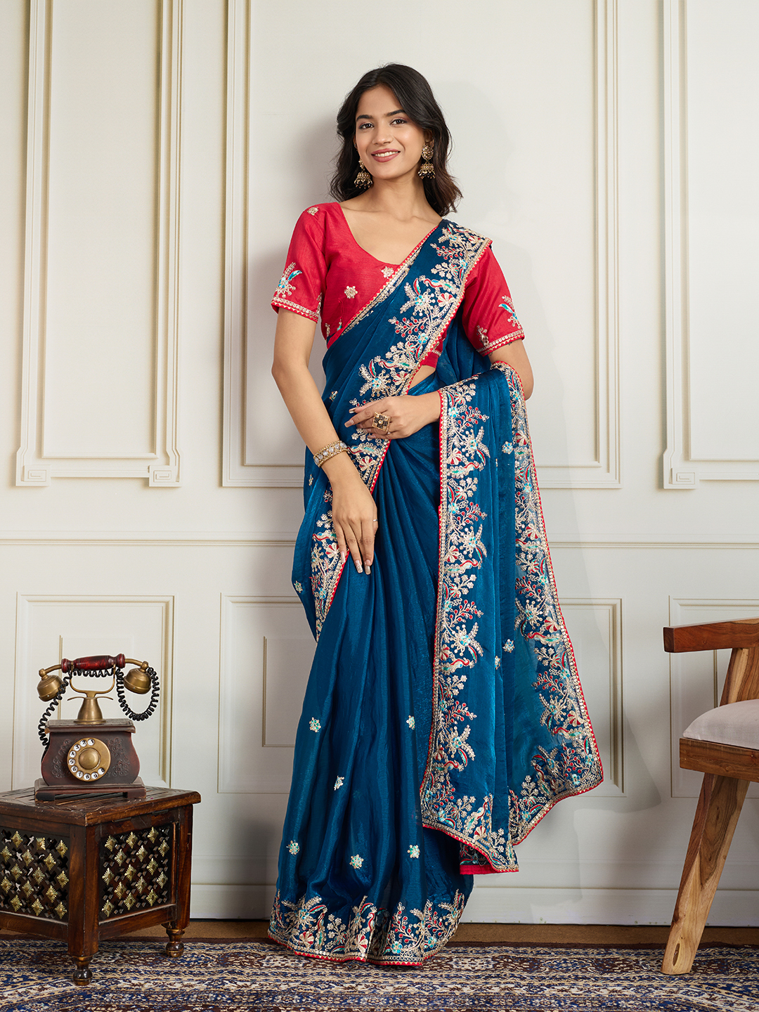 Blue Color Frendy Chiffon Fabric Designer Embroidery Work Heavy Ceremonial Saree