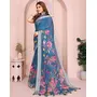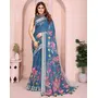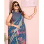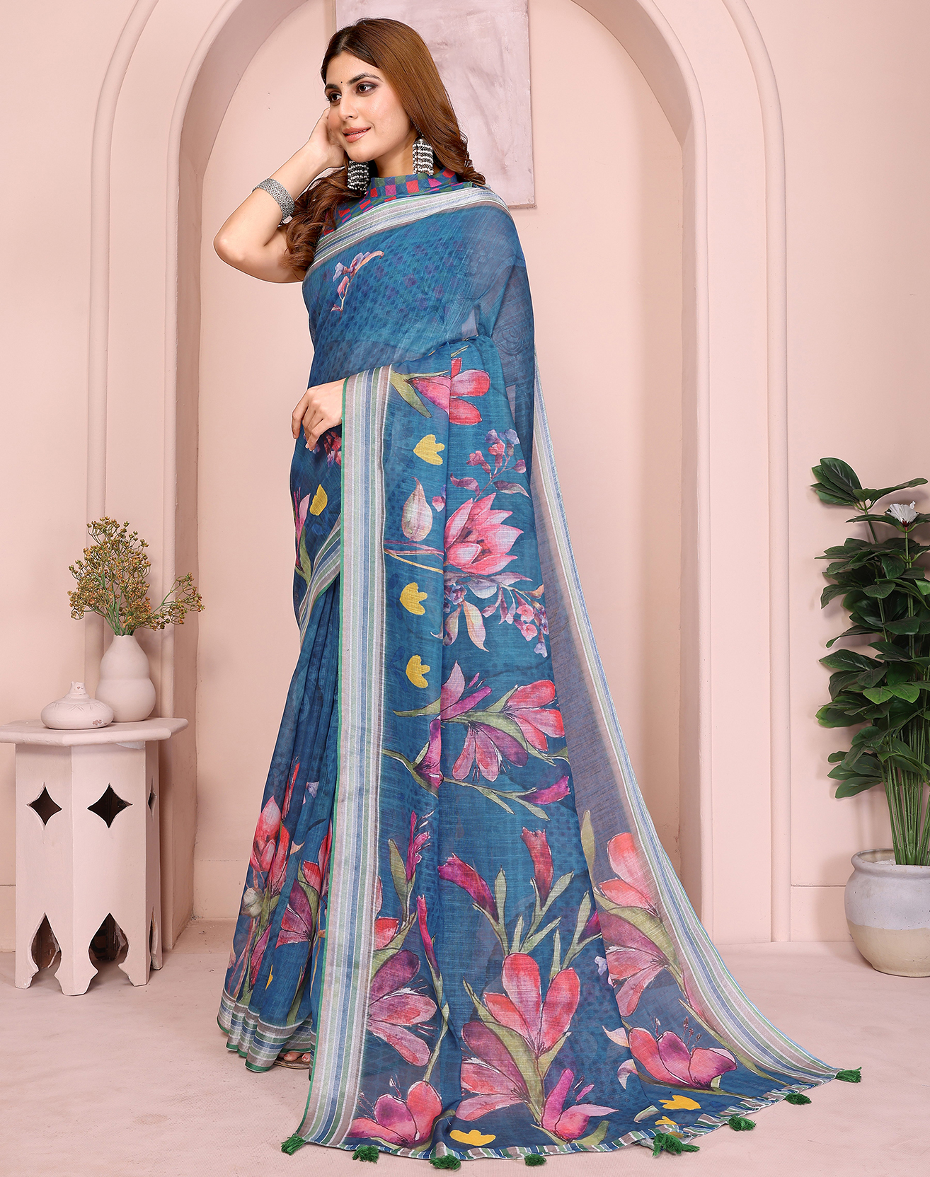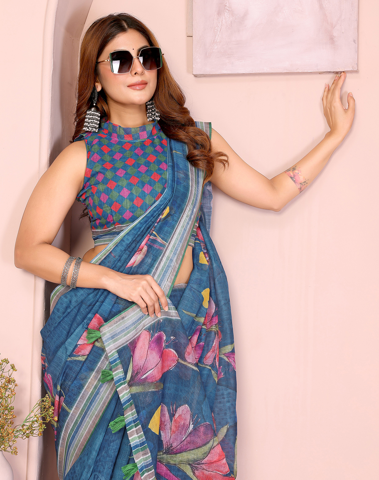 Blue Color Linen Cotton Fabric Designer Printed Formal Looks Sophisticated Saree