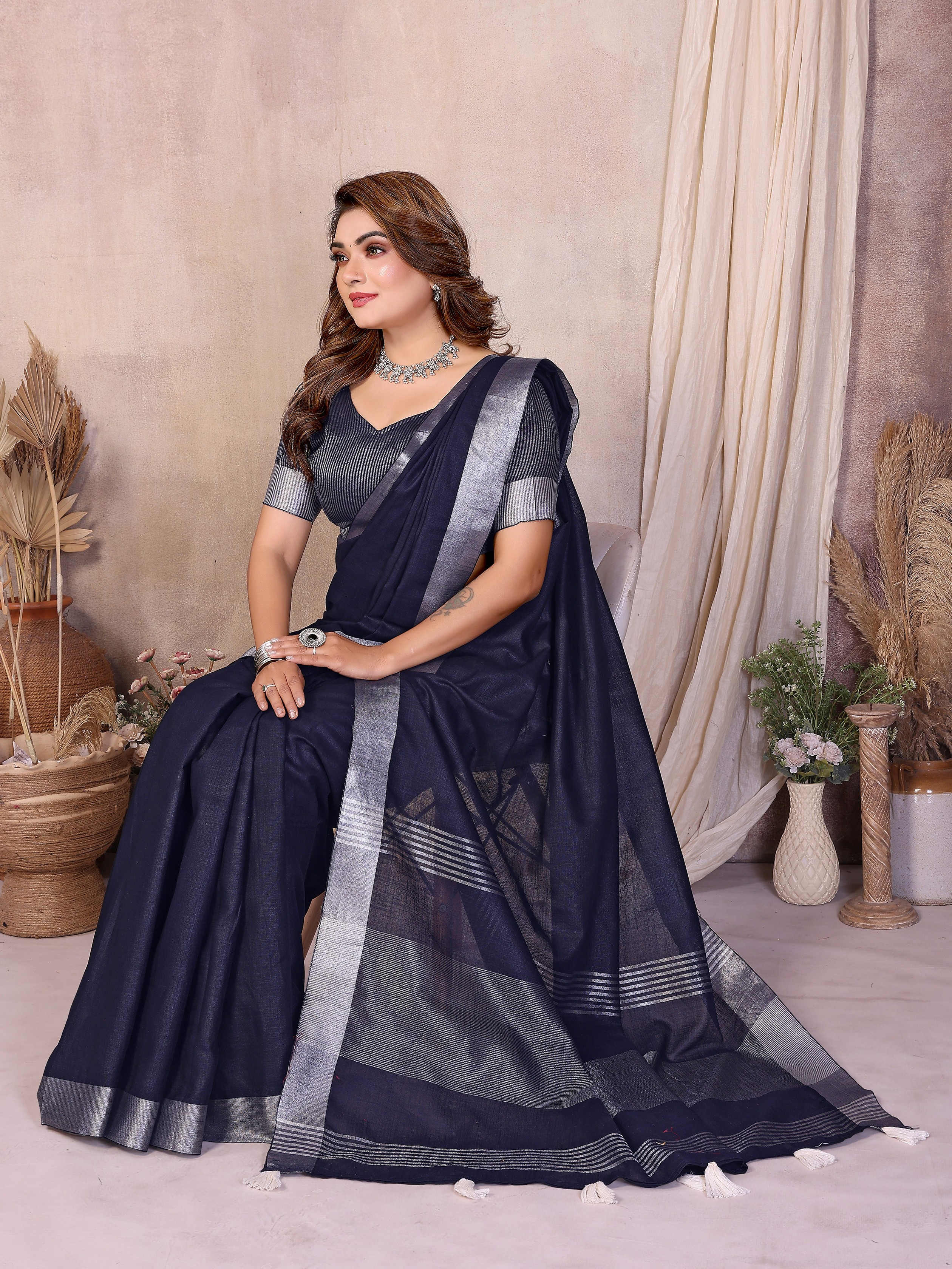 Blue Color Linen Cotton Fabric Woven Silver Jari Designer Ceremonial Saree