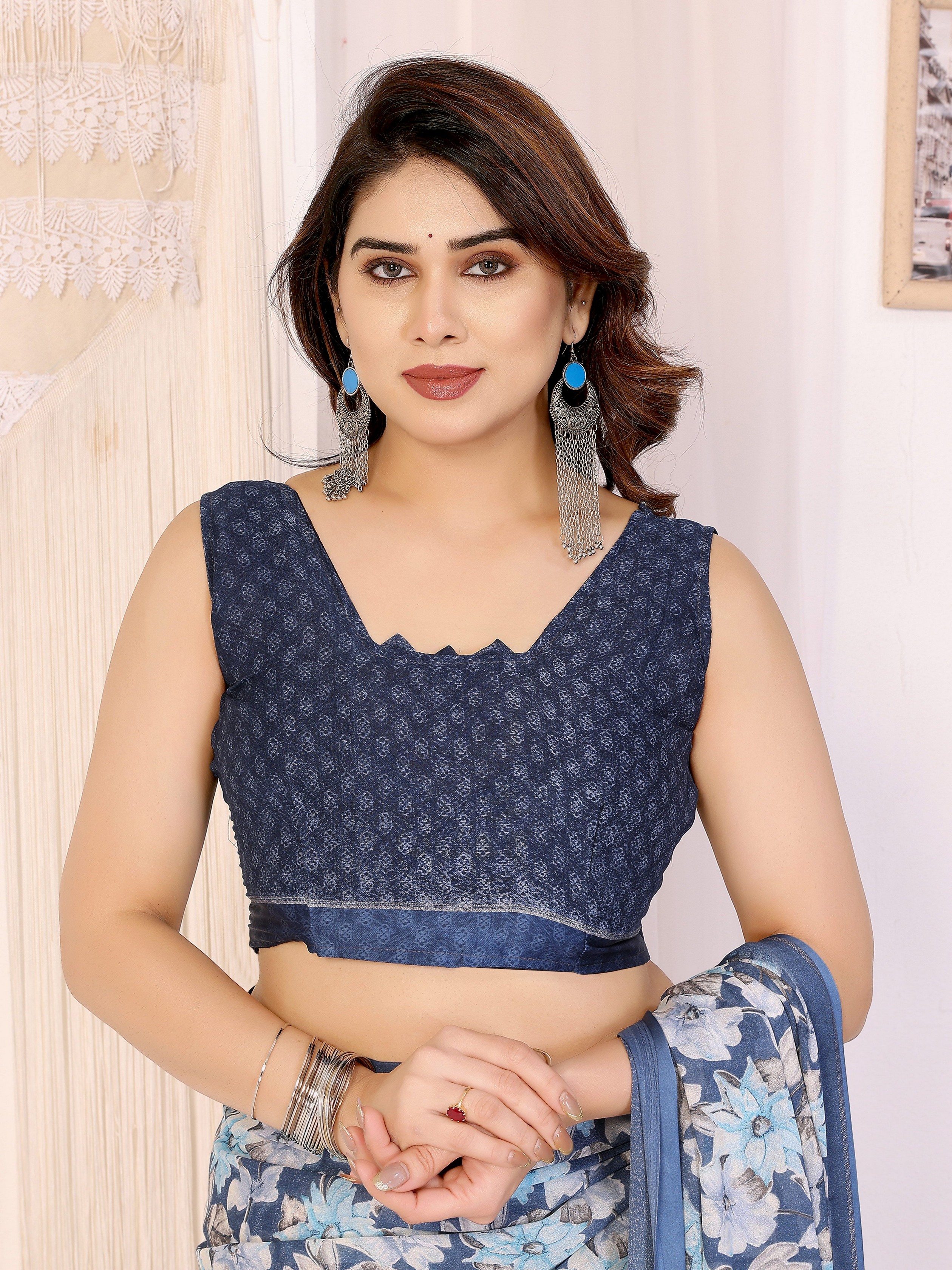 Blue Color Moss Satin Patta Designer Flower Printed Ceremonial Saree