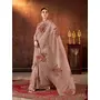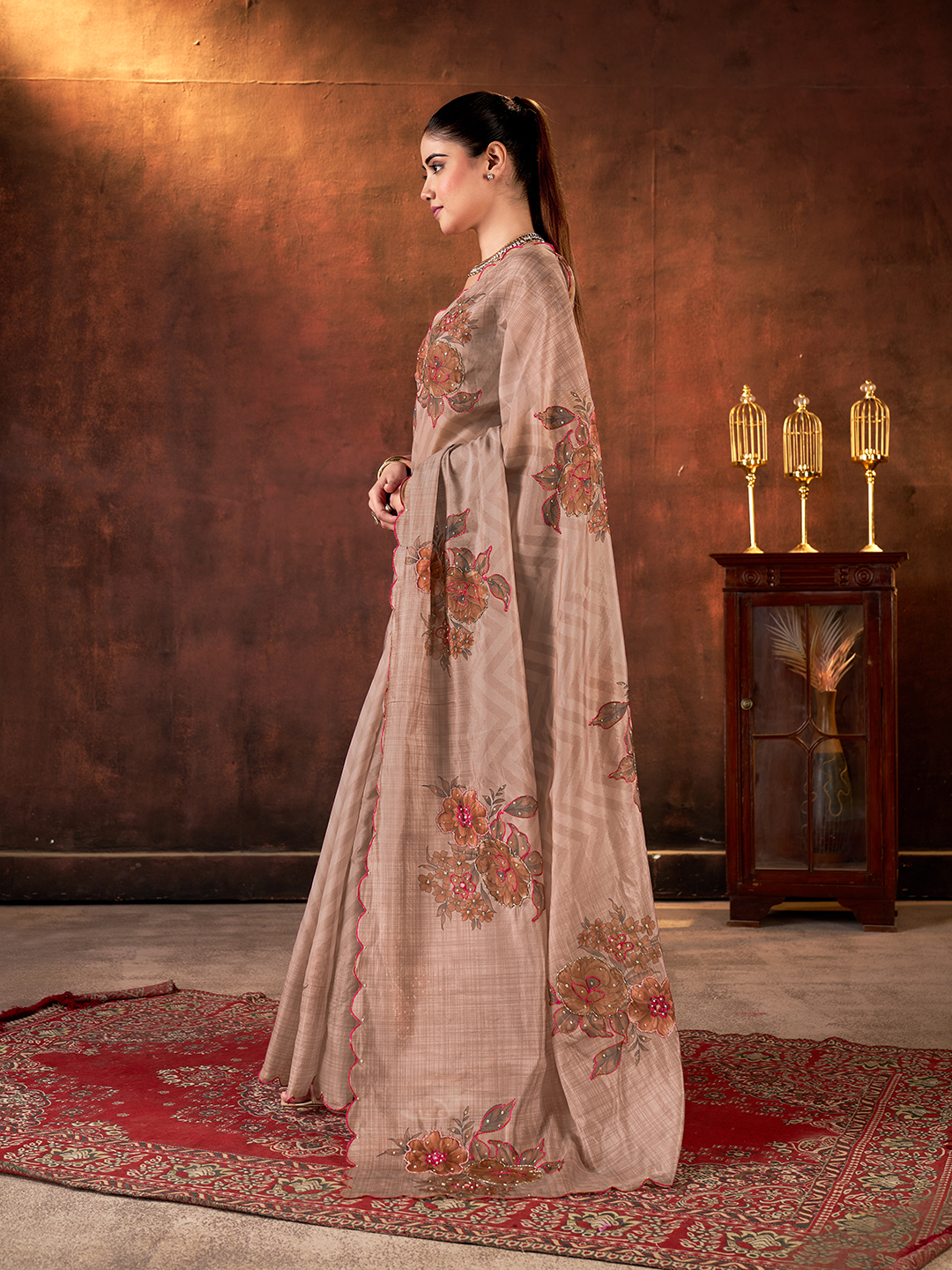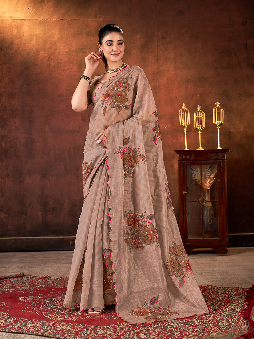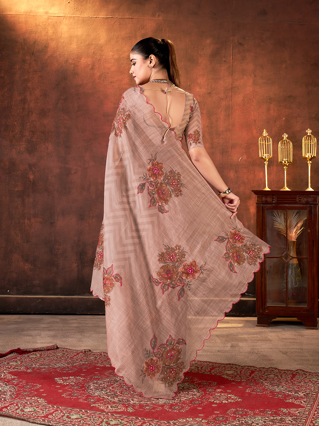Brown Color Designer Tabby Organza Fabric Designer Printed With Khatli Work Saree