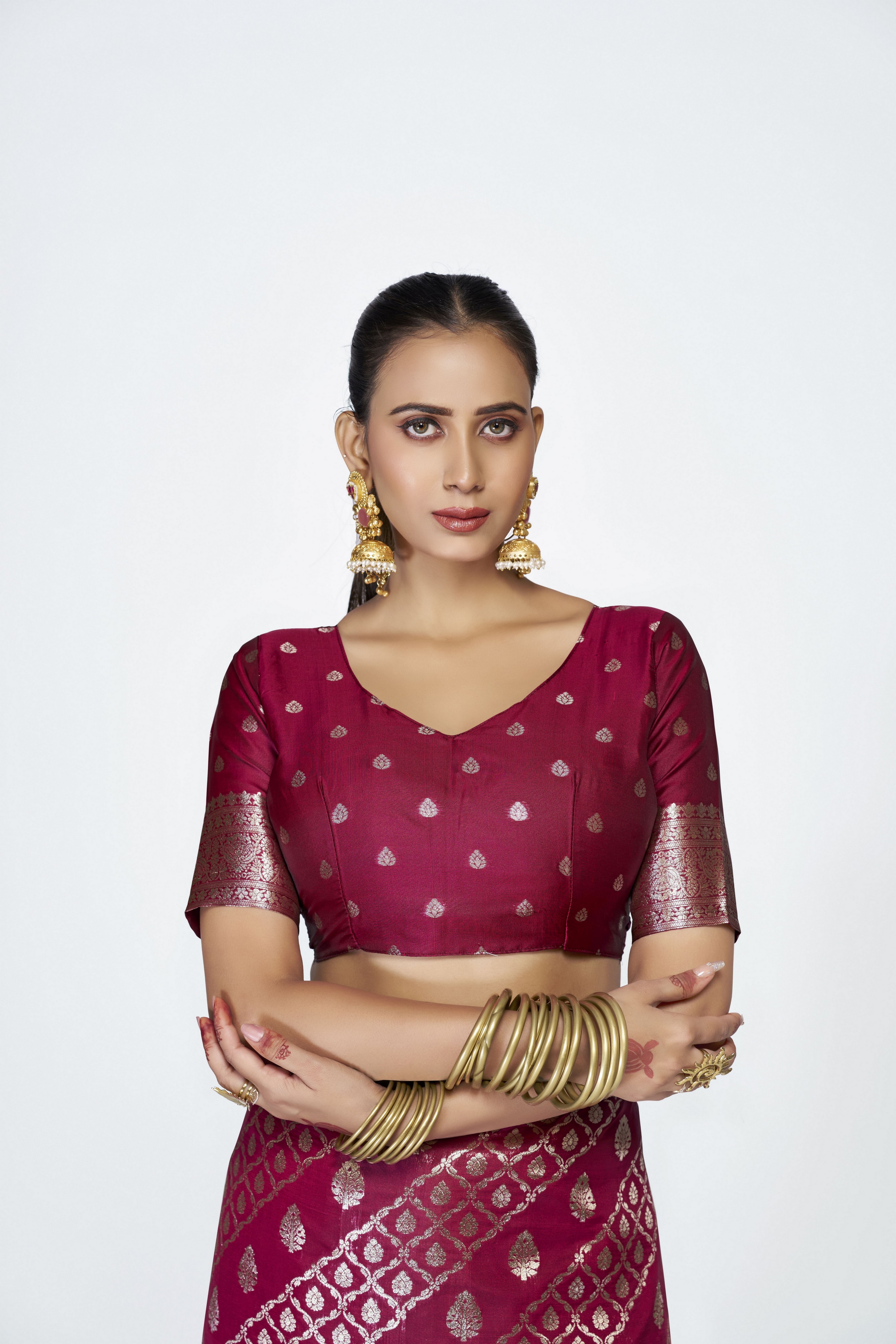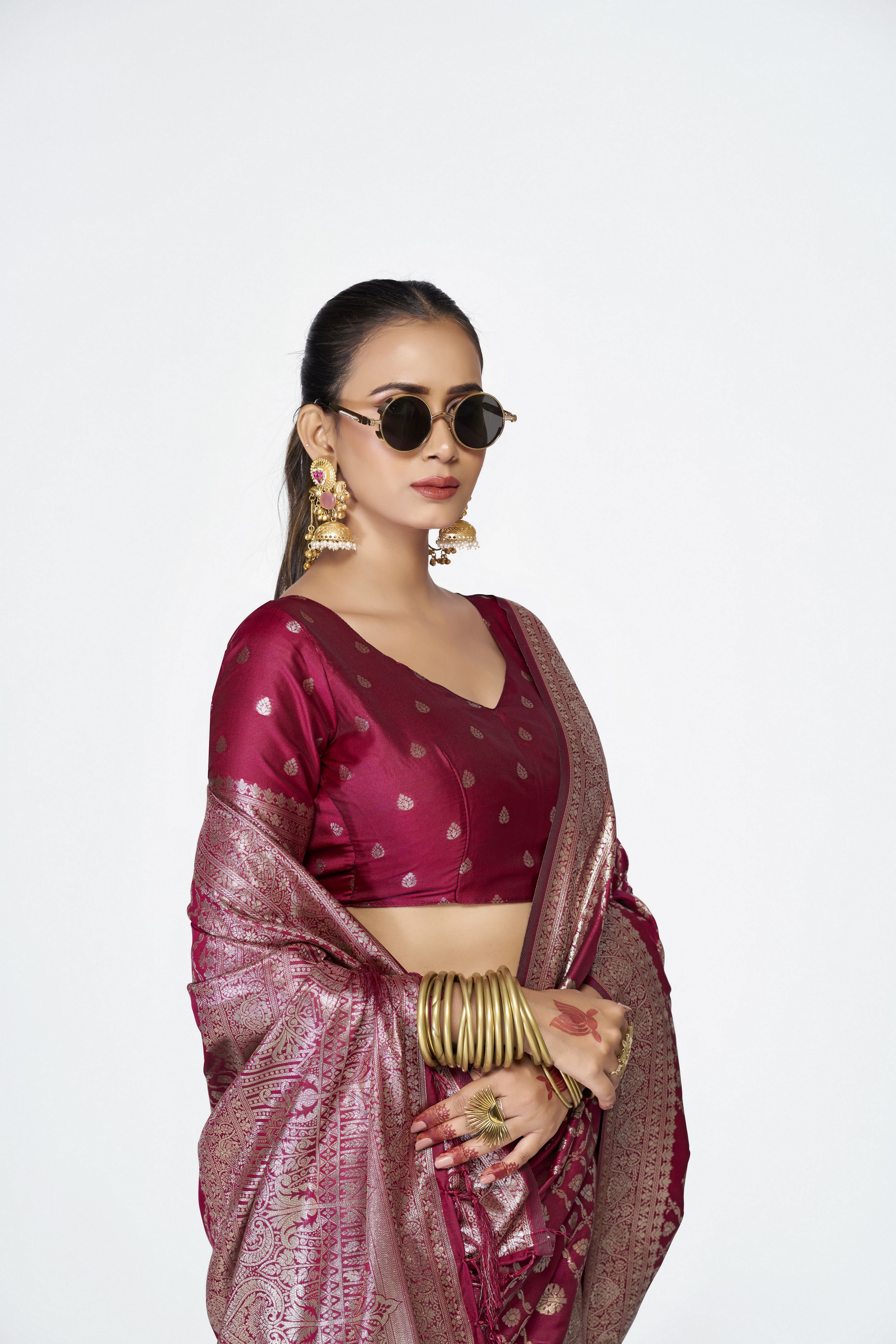 Burgundy color Banarasi Silk fabric Woven Zari Designer Saree