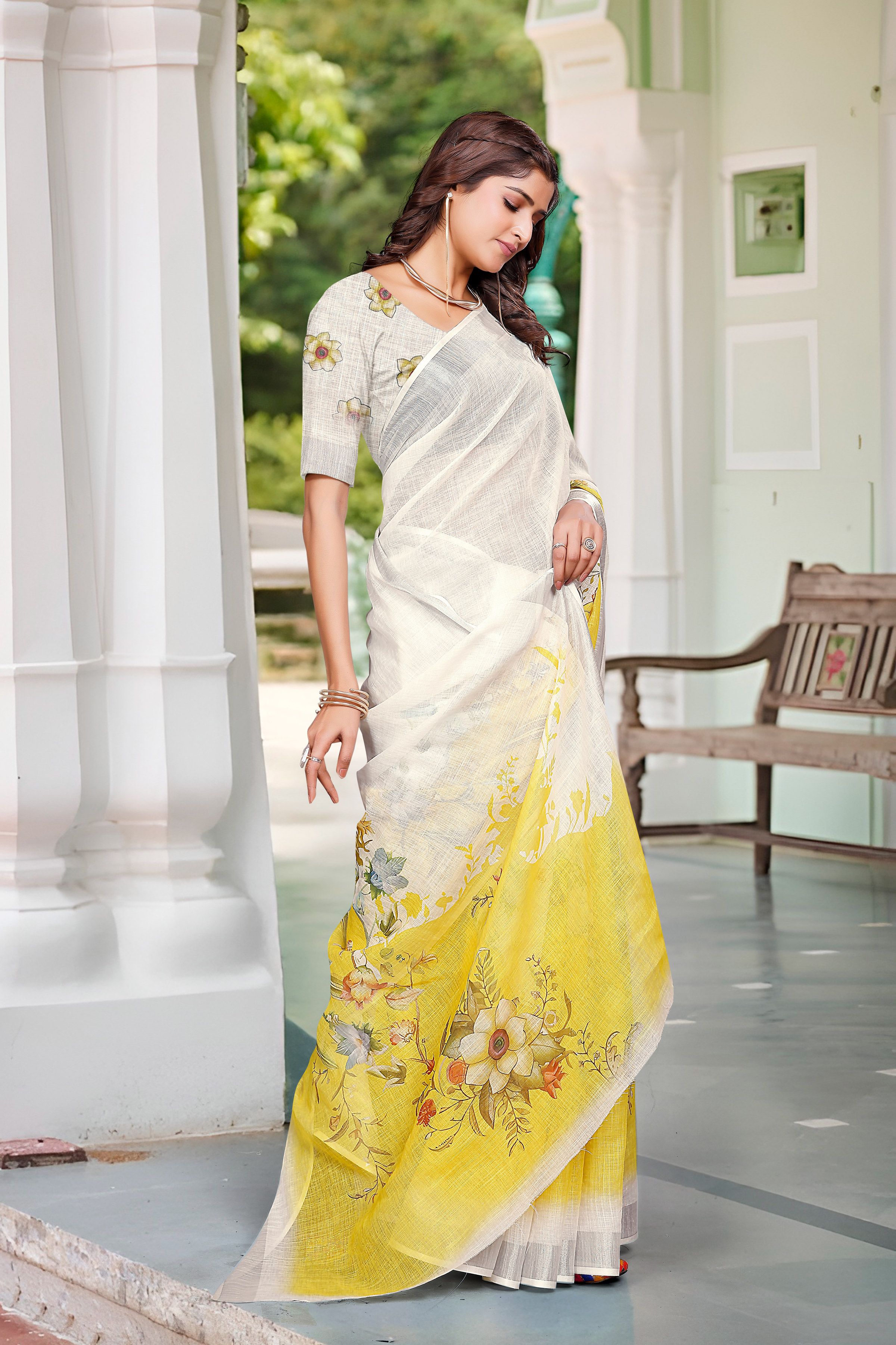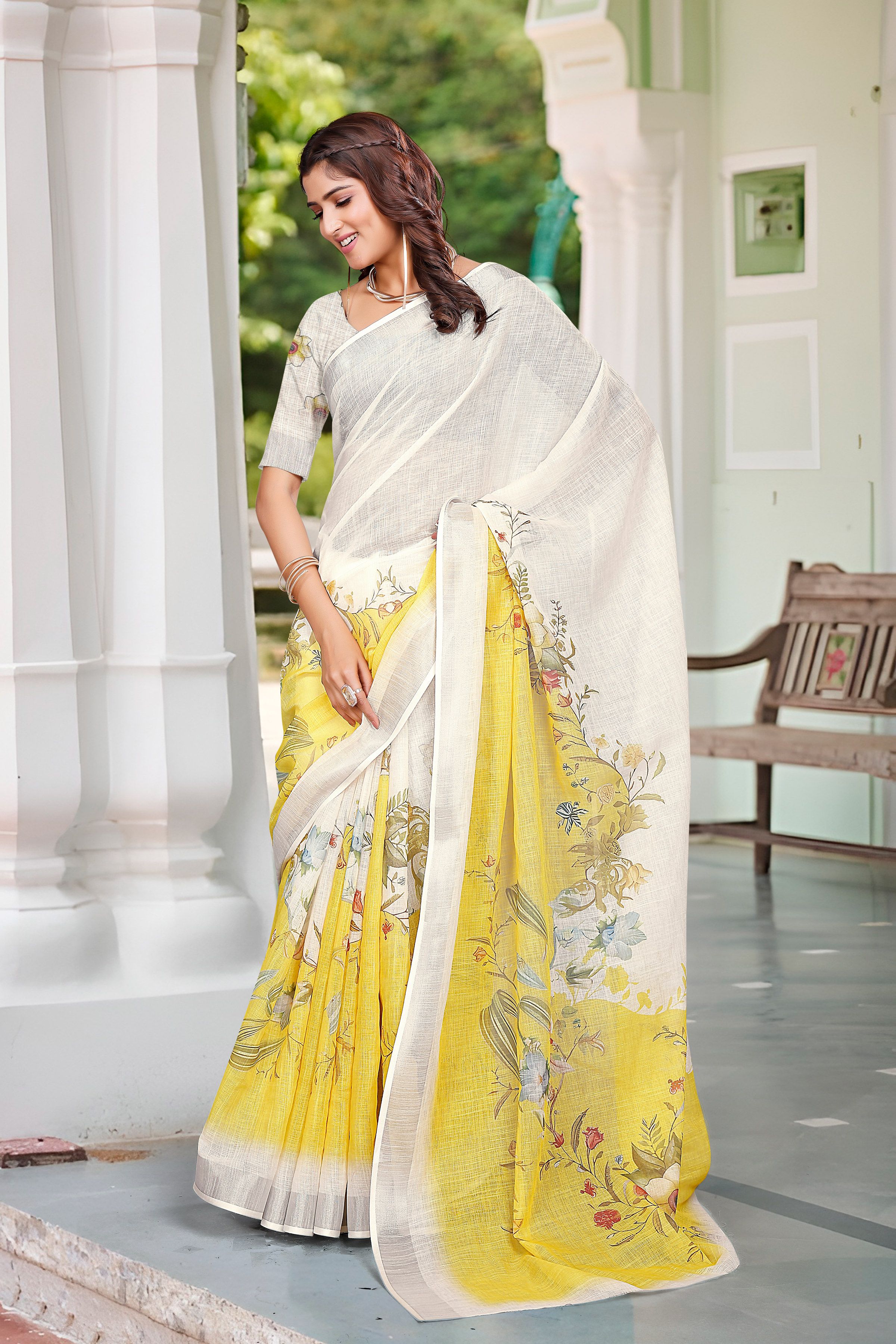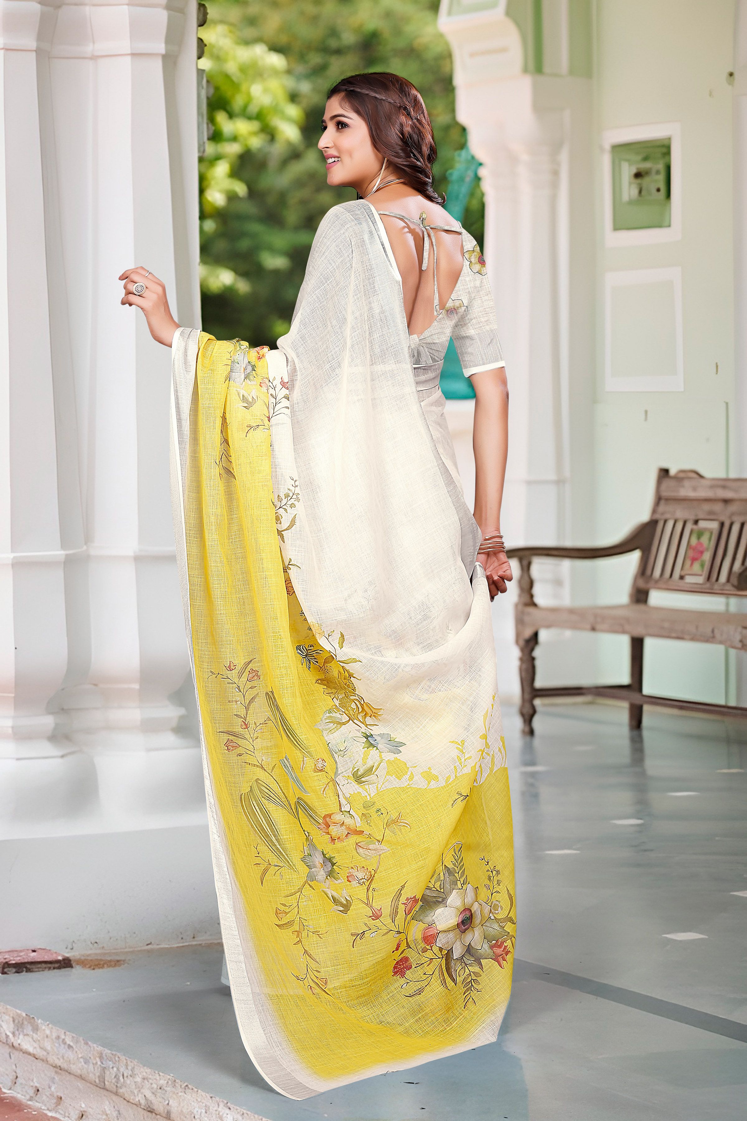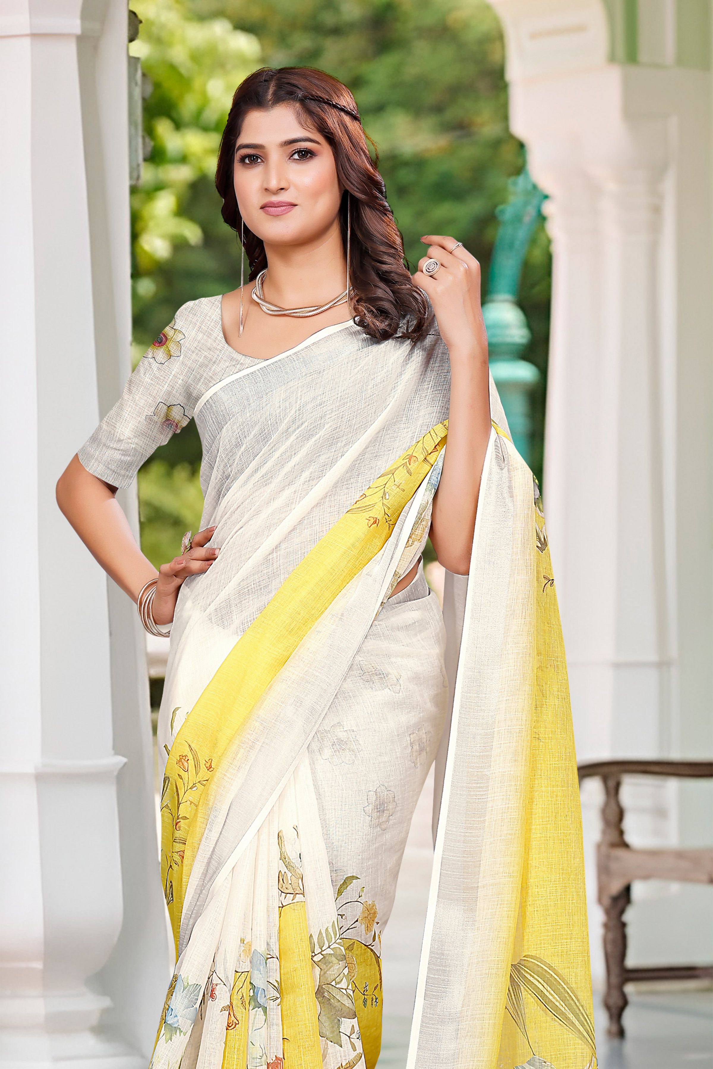Cream Color Linen Cotton Fabric Beautiful Festive Special Saree