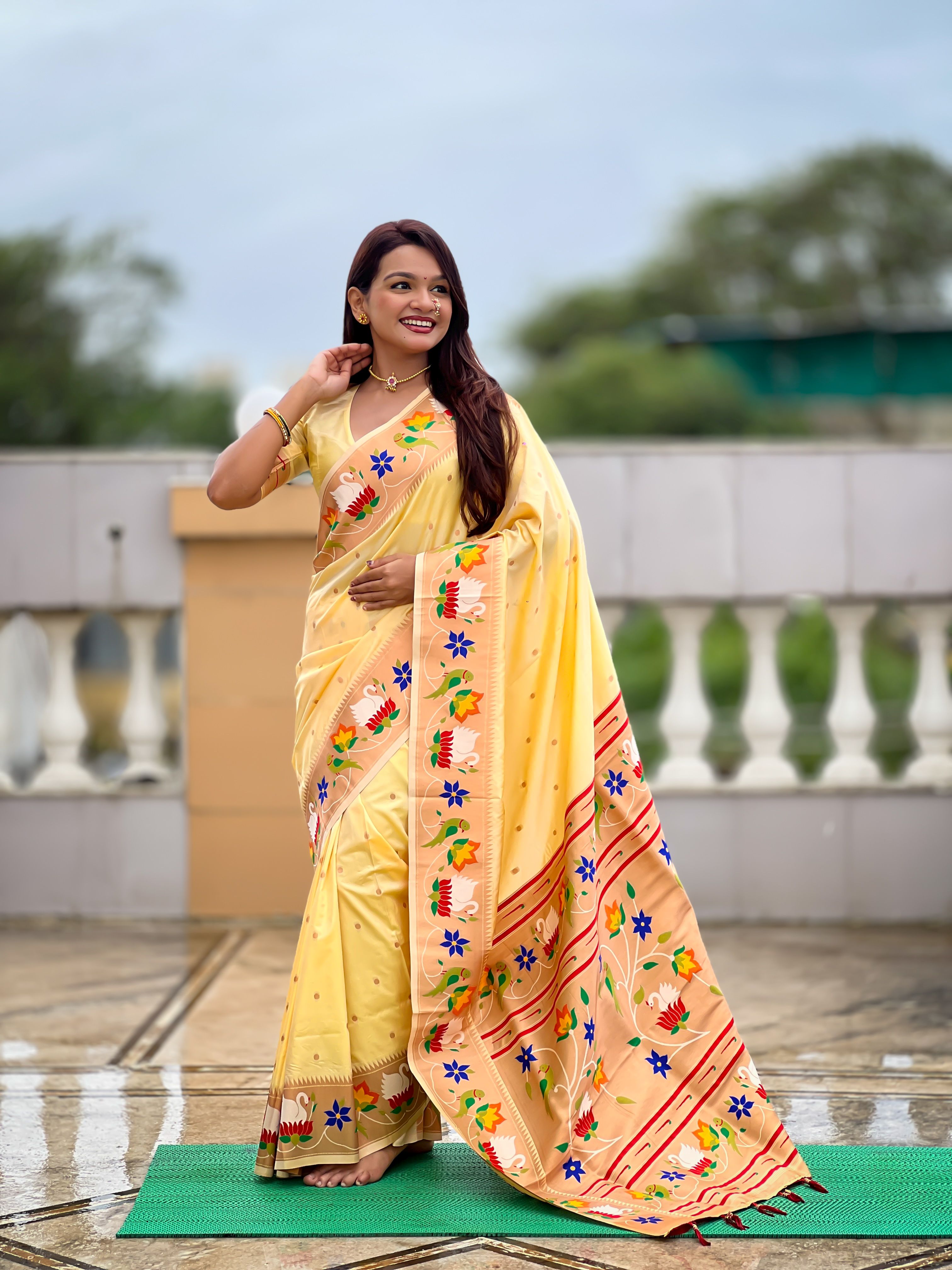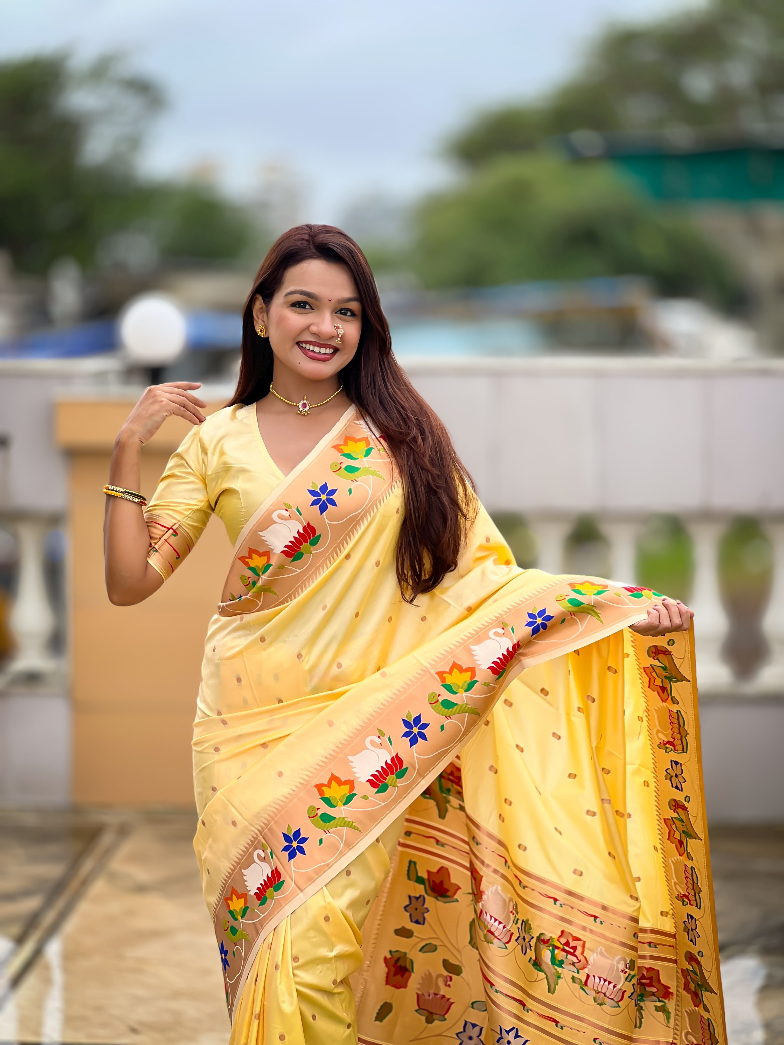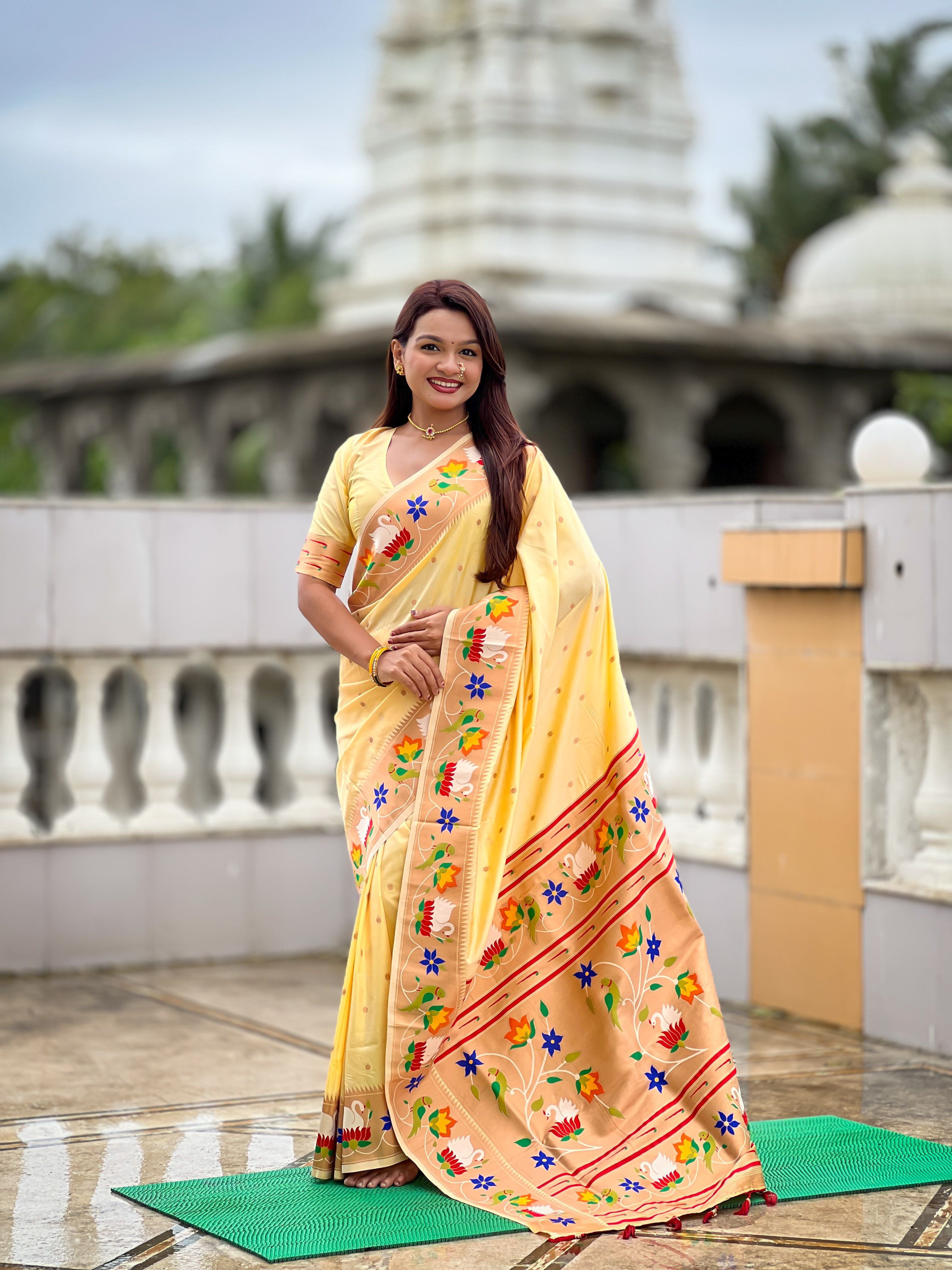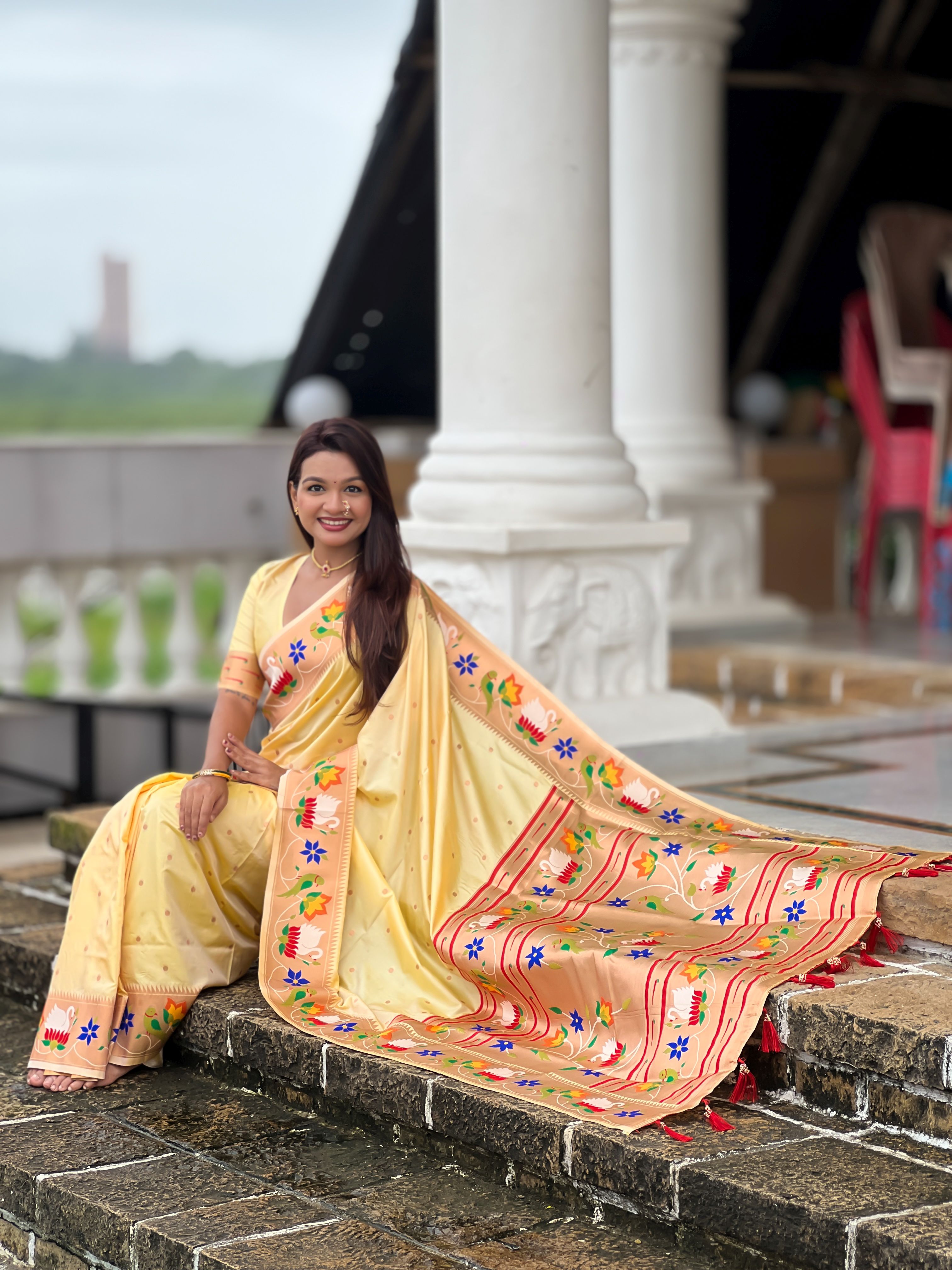 Cream Color Paithani Silk Woven Meenakari Jacquard Designer Heavy Wedding Special Saree