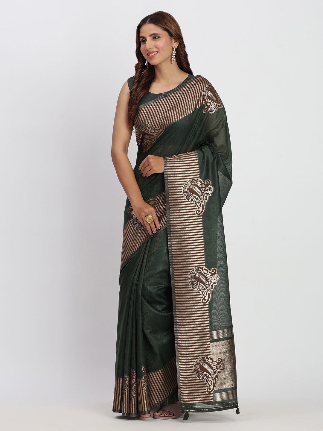 Dark Green Color Linen Cotton Fabric Woven Galla Designer Traditional Partywear Saree