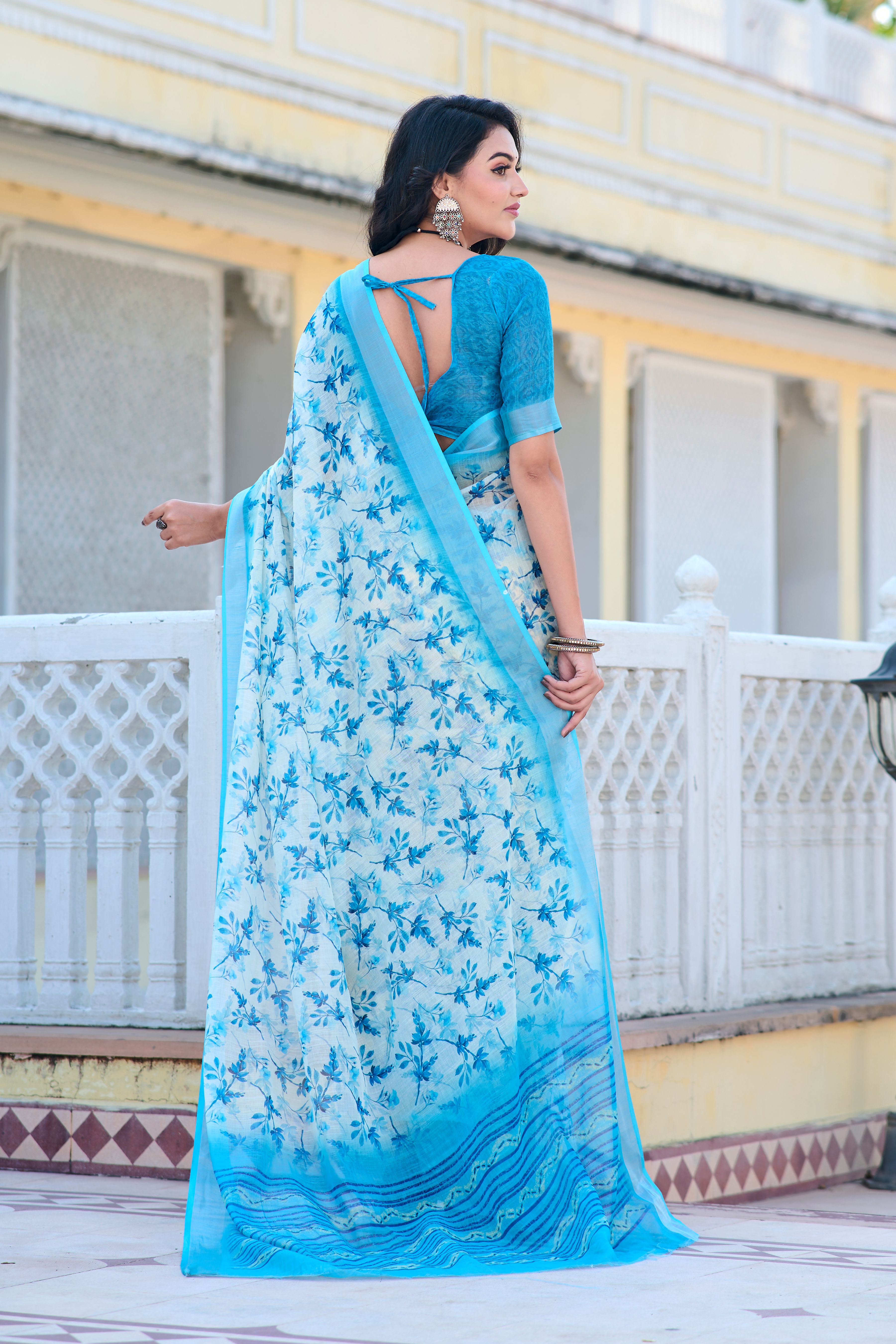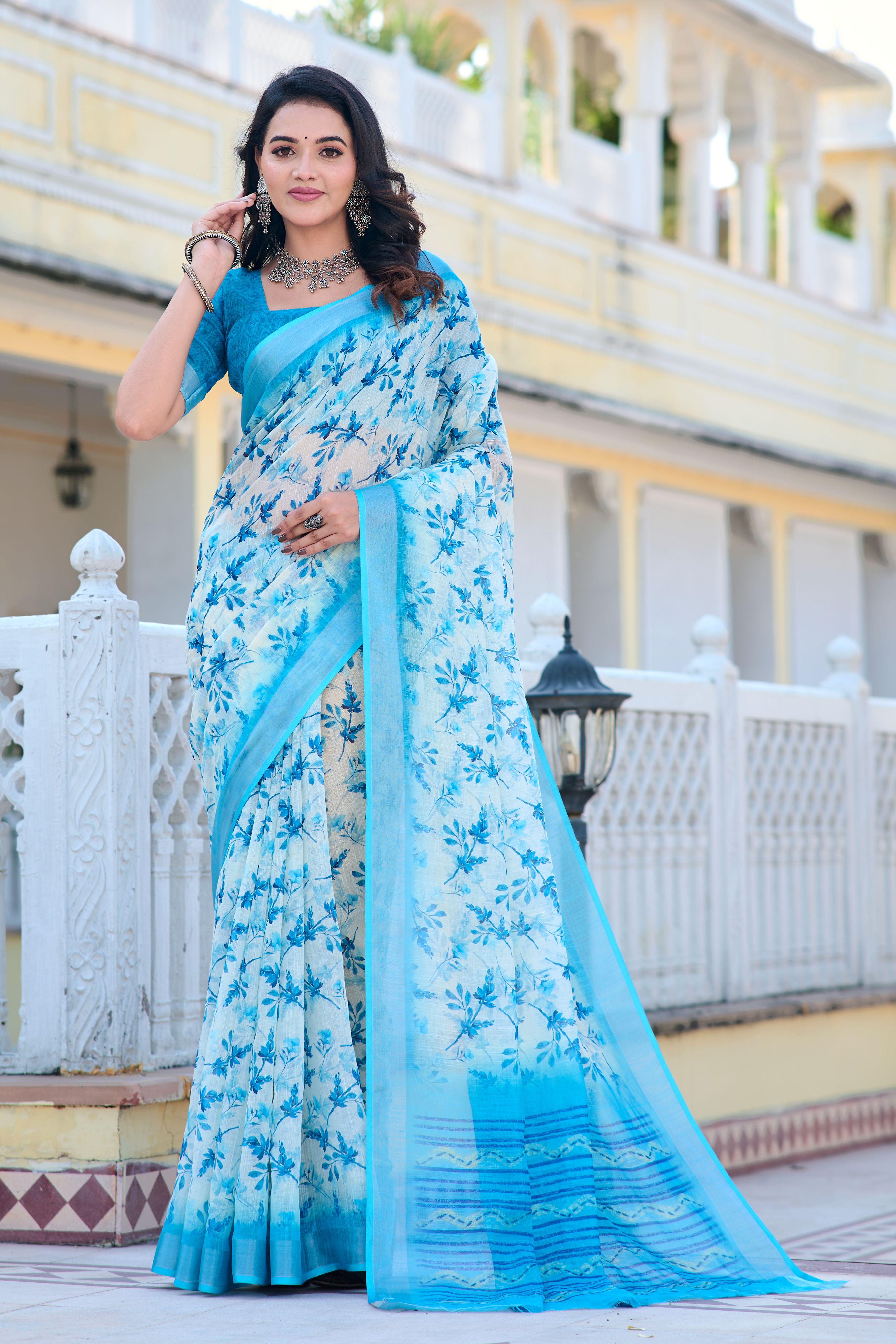 Firozi Color Beautiful Linen Cotton Fabric Designer Festive Wear Saree