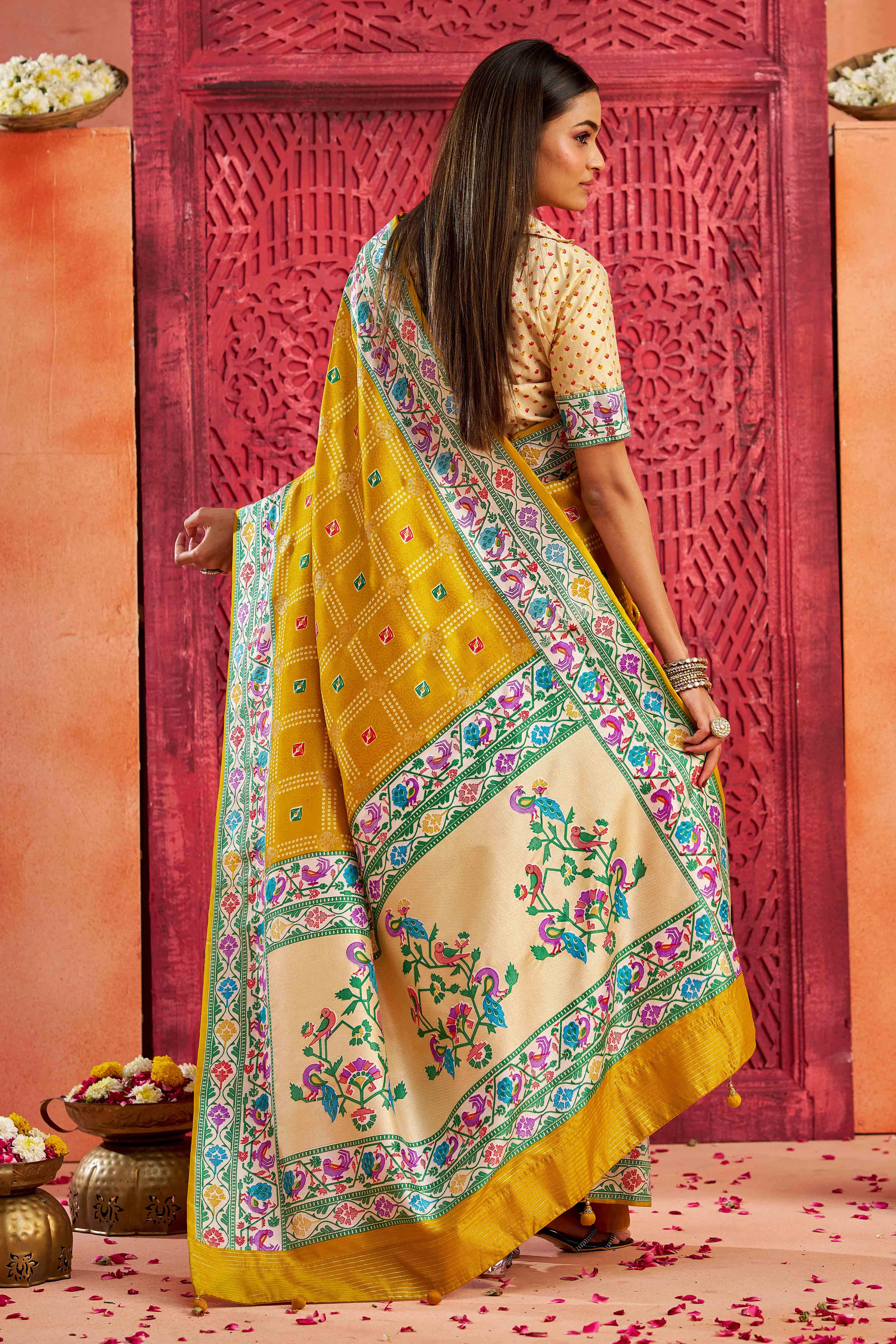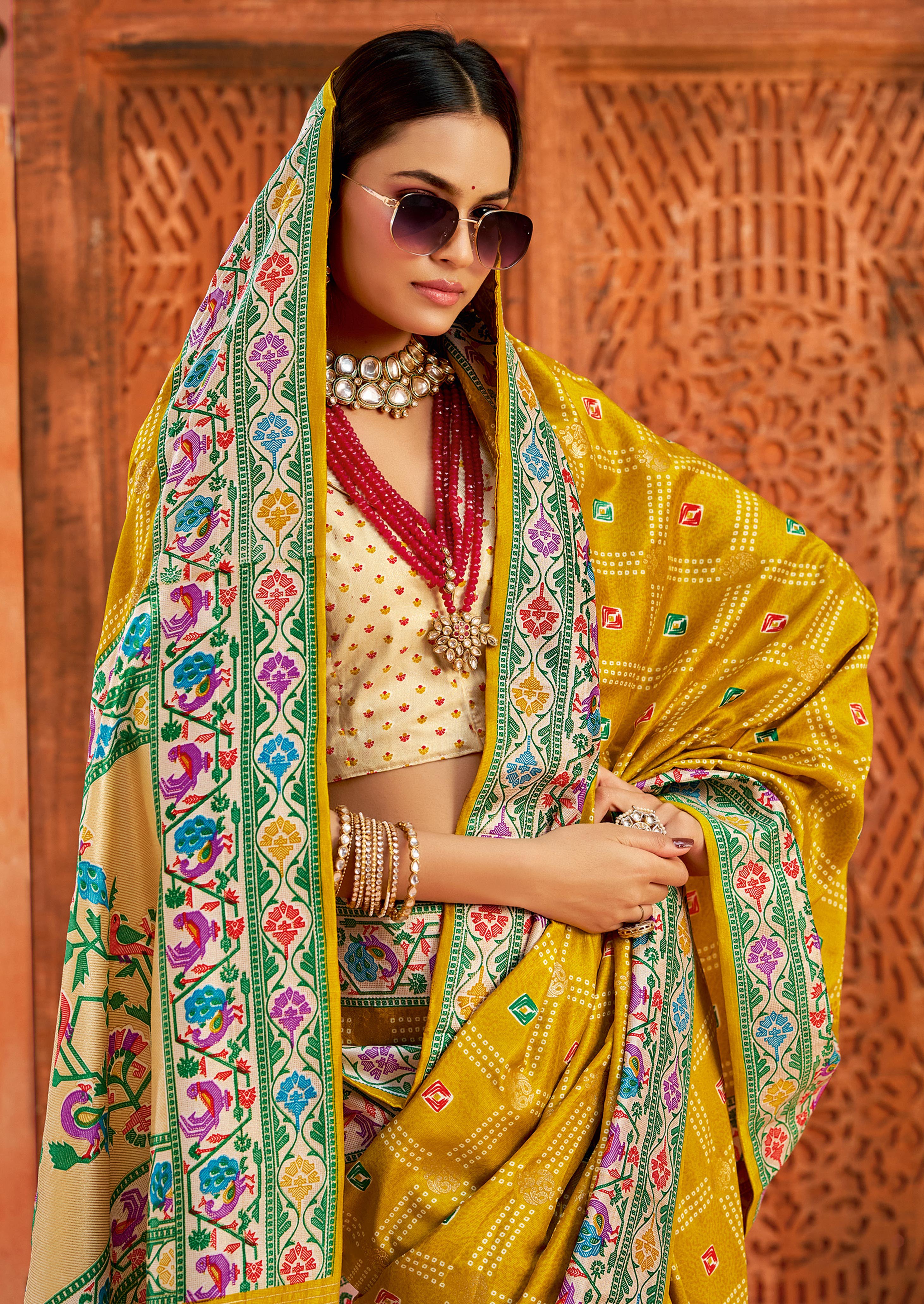 Gold Color Velvet Tussar Silk Fabric Partywear Saree With Paithani Pallu And Traditional Ghatchola Print