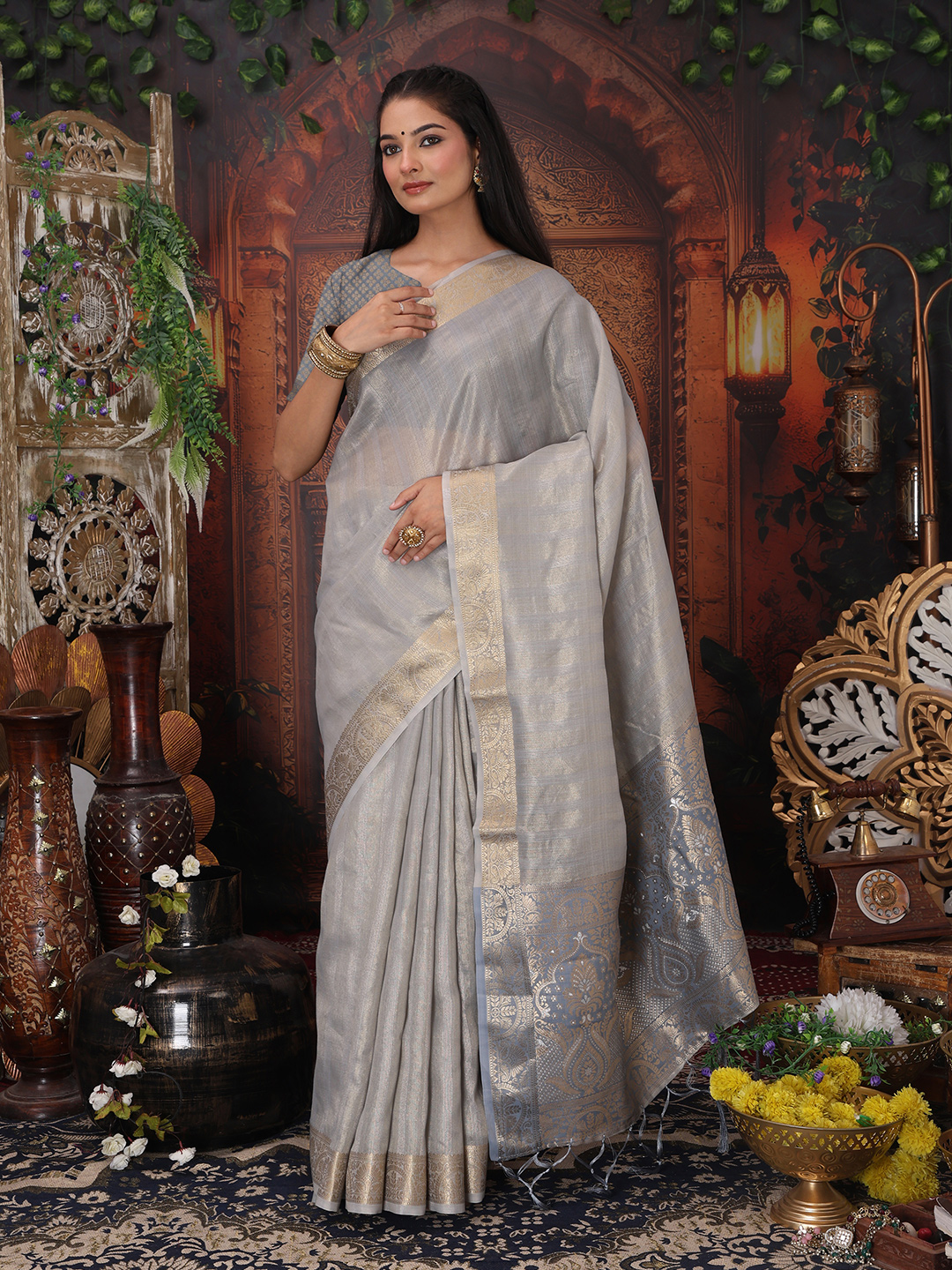Gray Color Organza Fabric Woven Designer Trendy Ethnic Saree