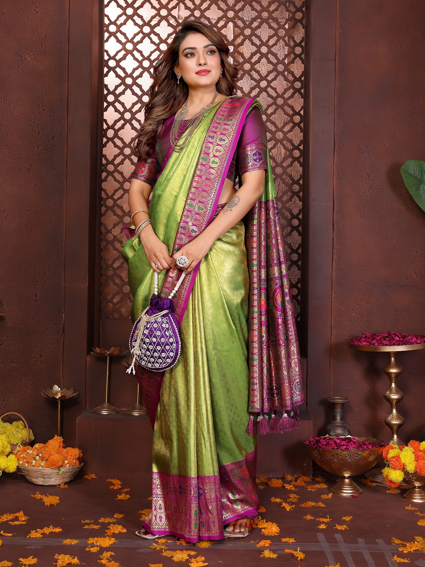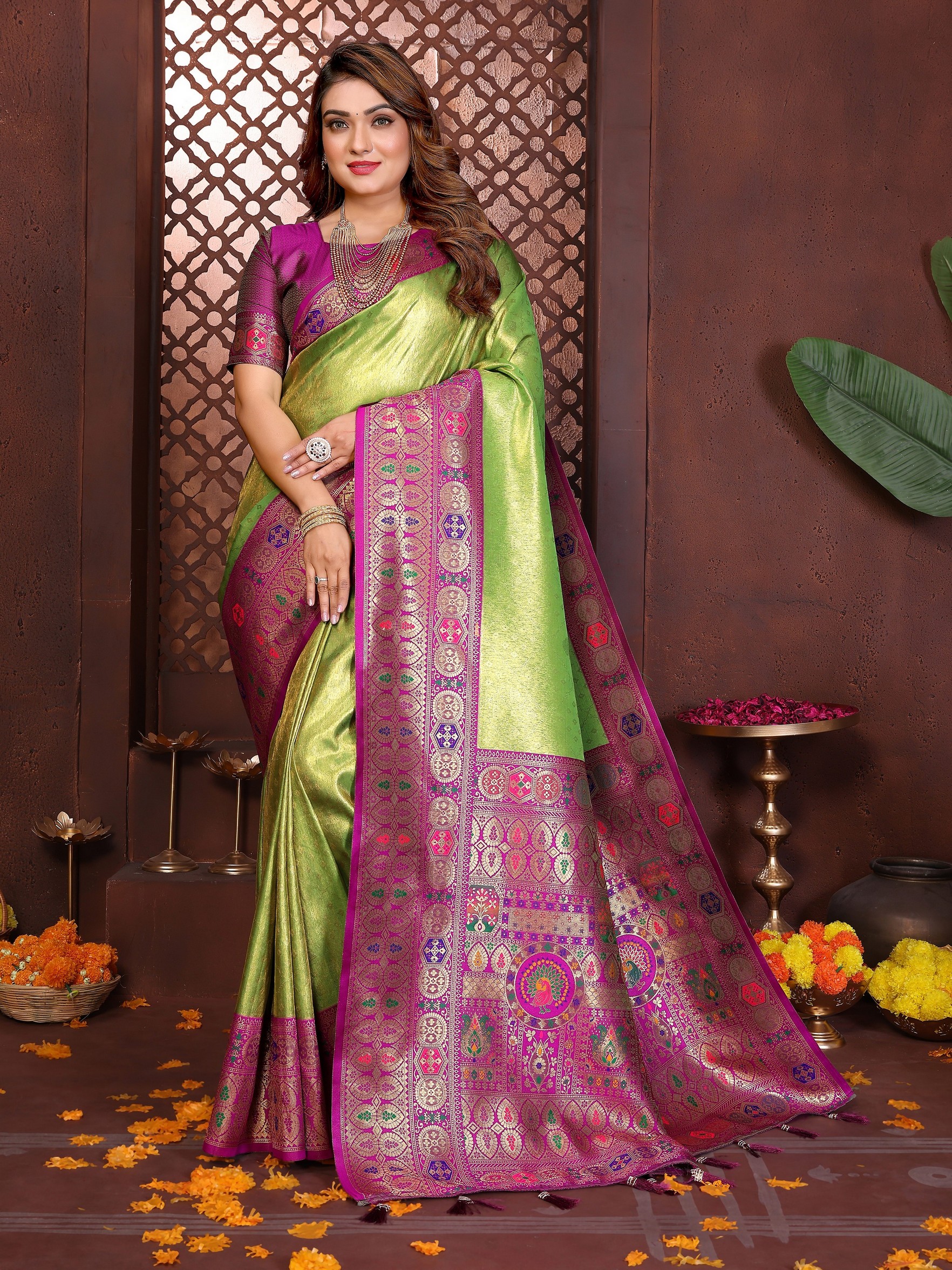 Green Color Banarasi Tissue Silk Fabric Woven Rich Paithani Designer Saree
