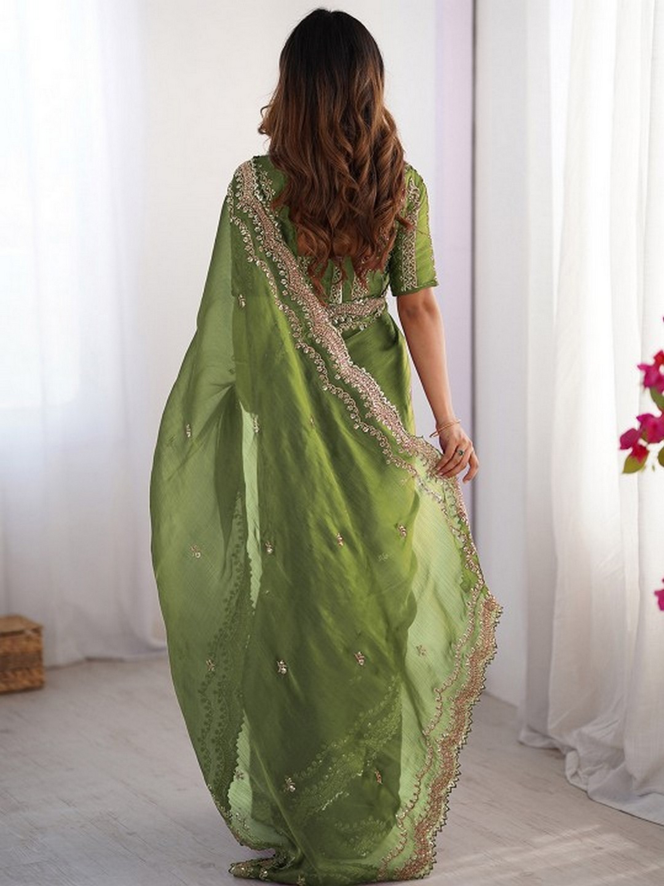 Green Color Burbery Silk Fabric Designer Embroidered Saree For Ceremonial Looks