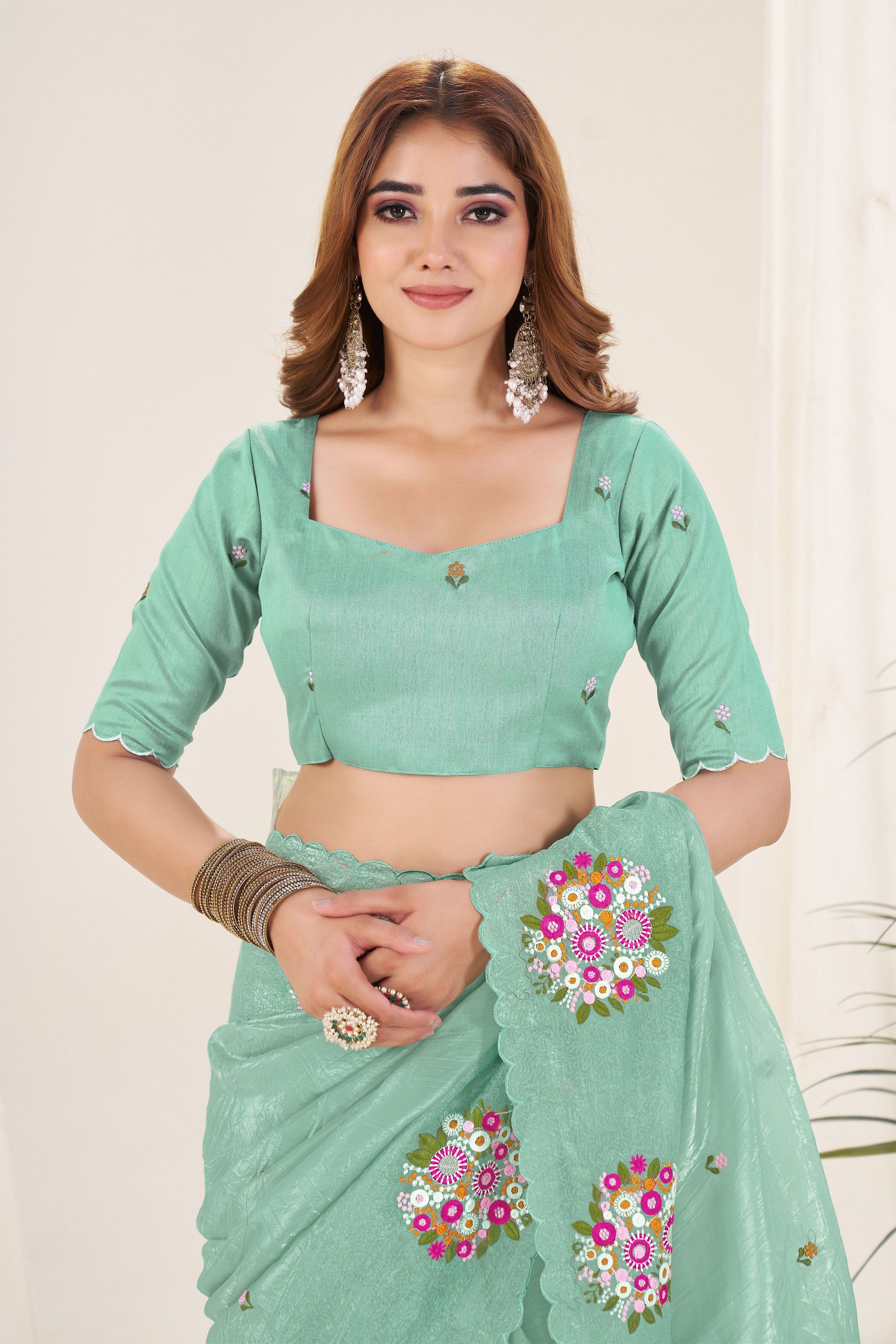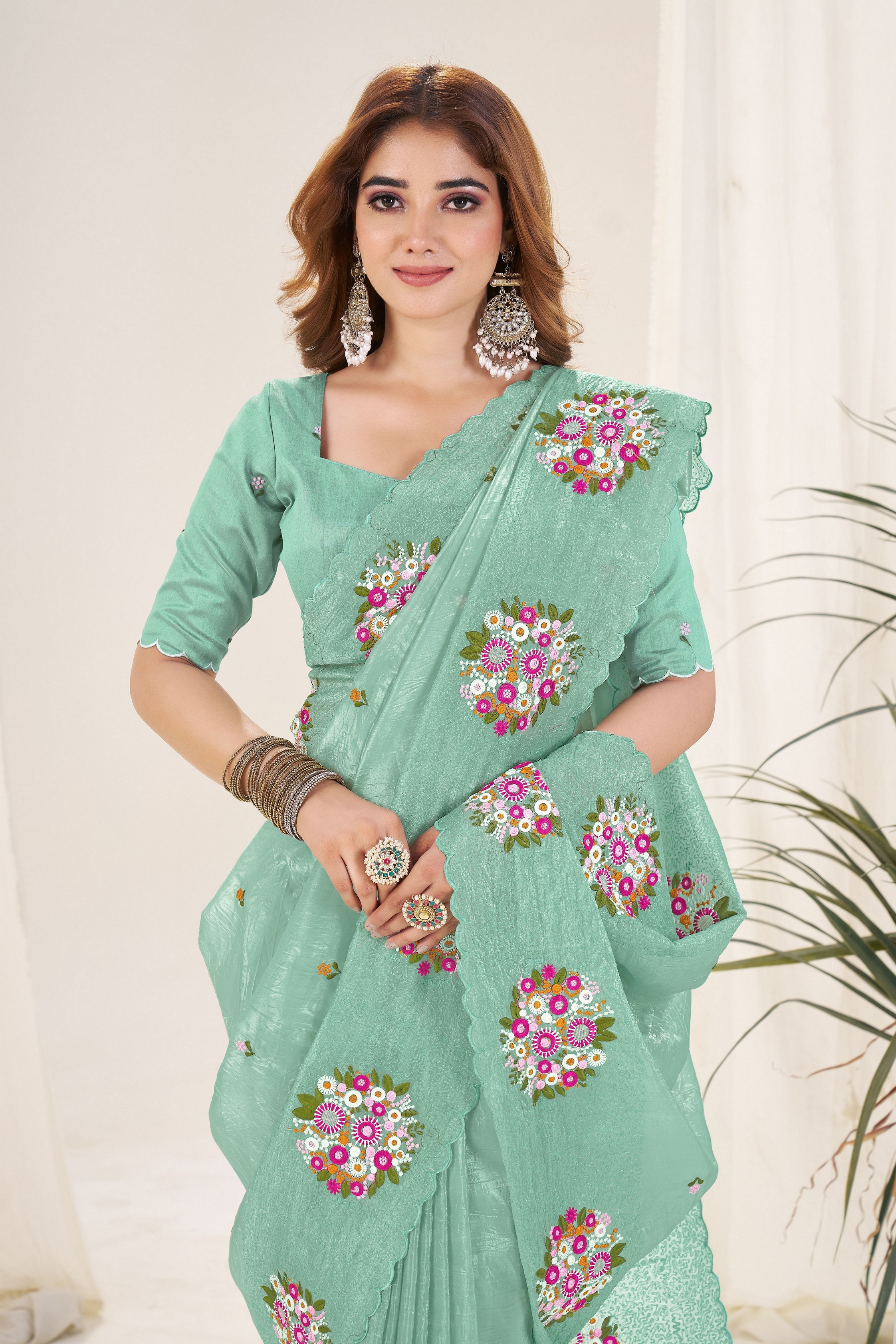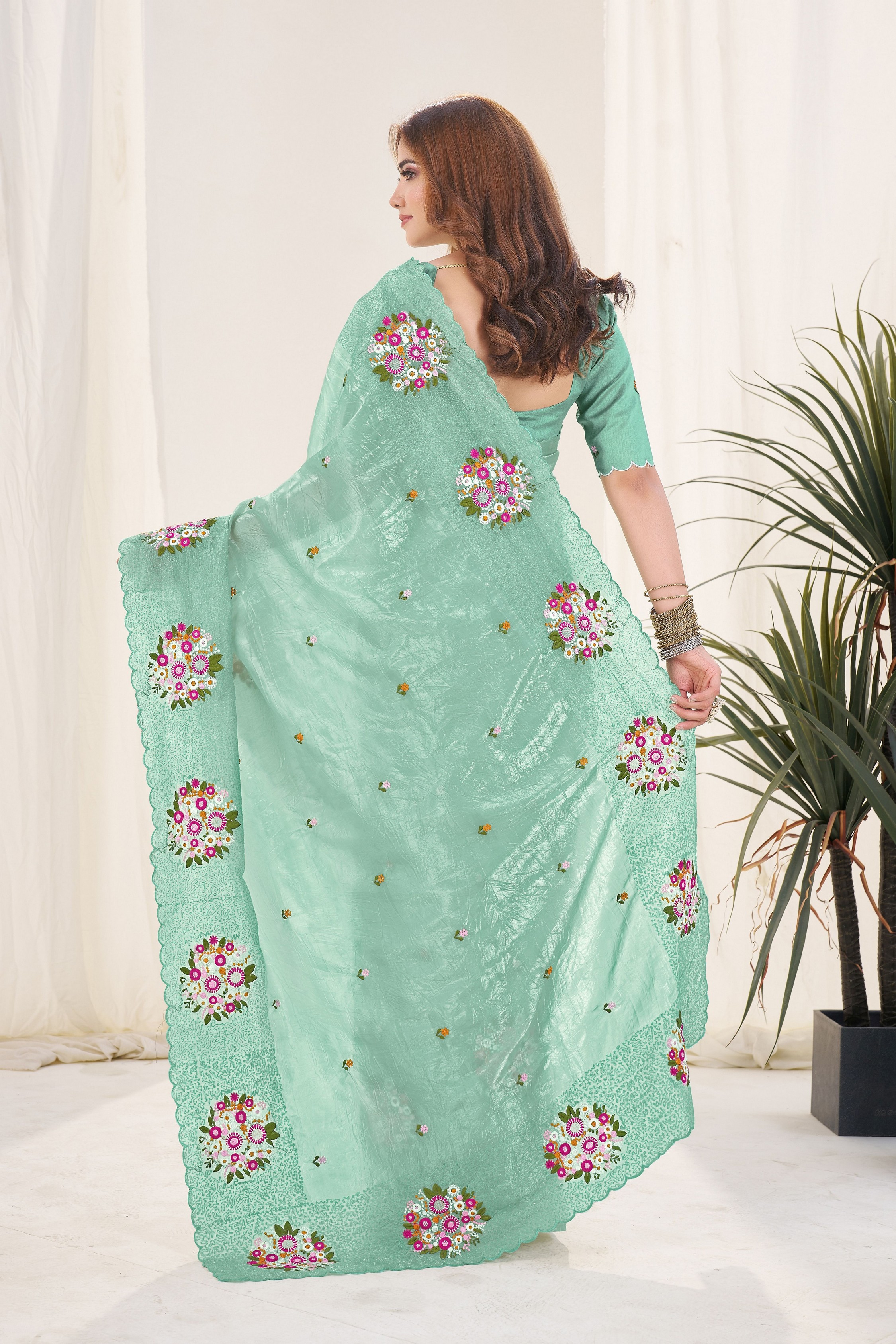 Green Color Gold Crush Fabric Designer Embroidered Saree
