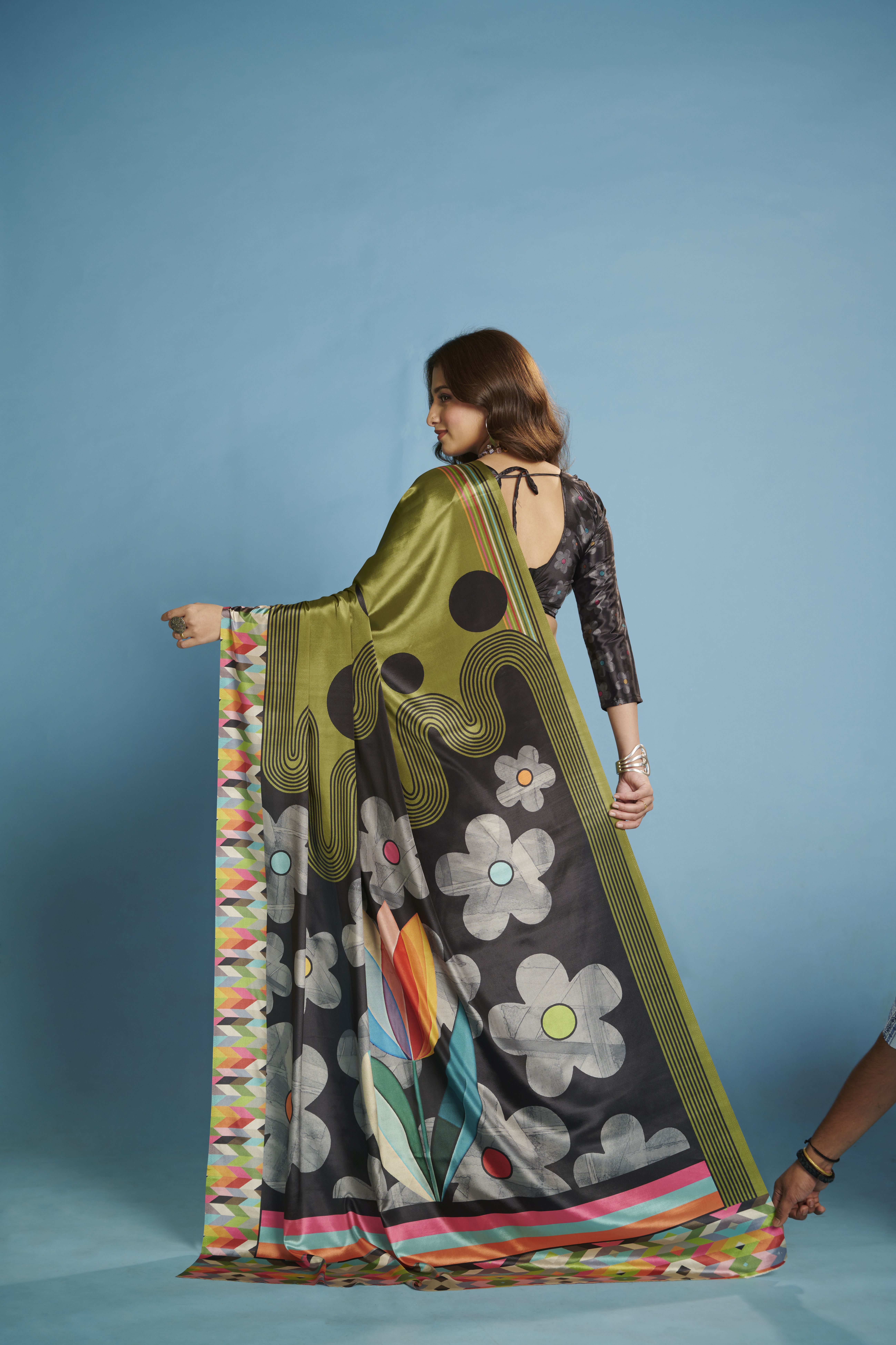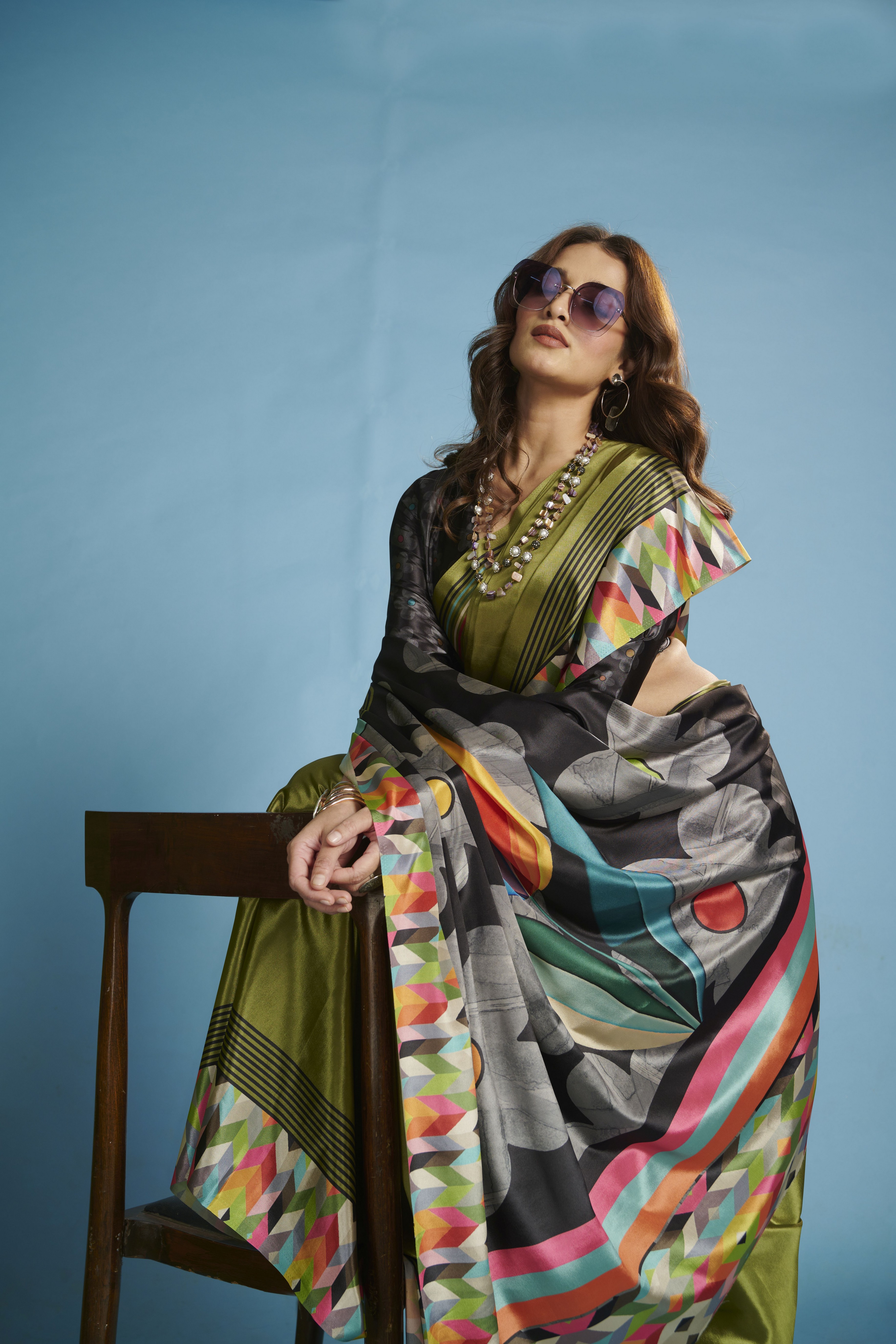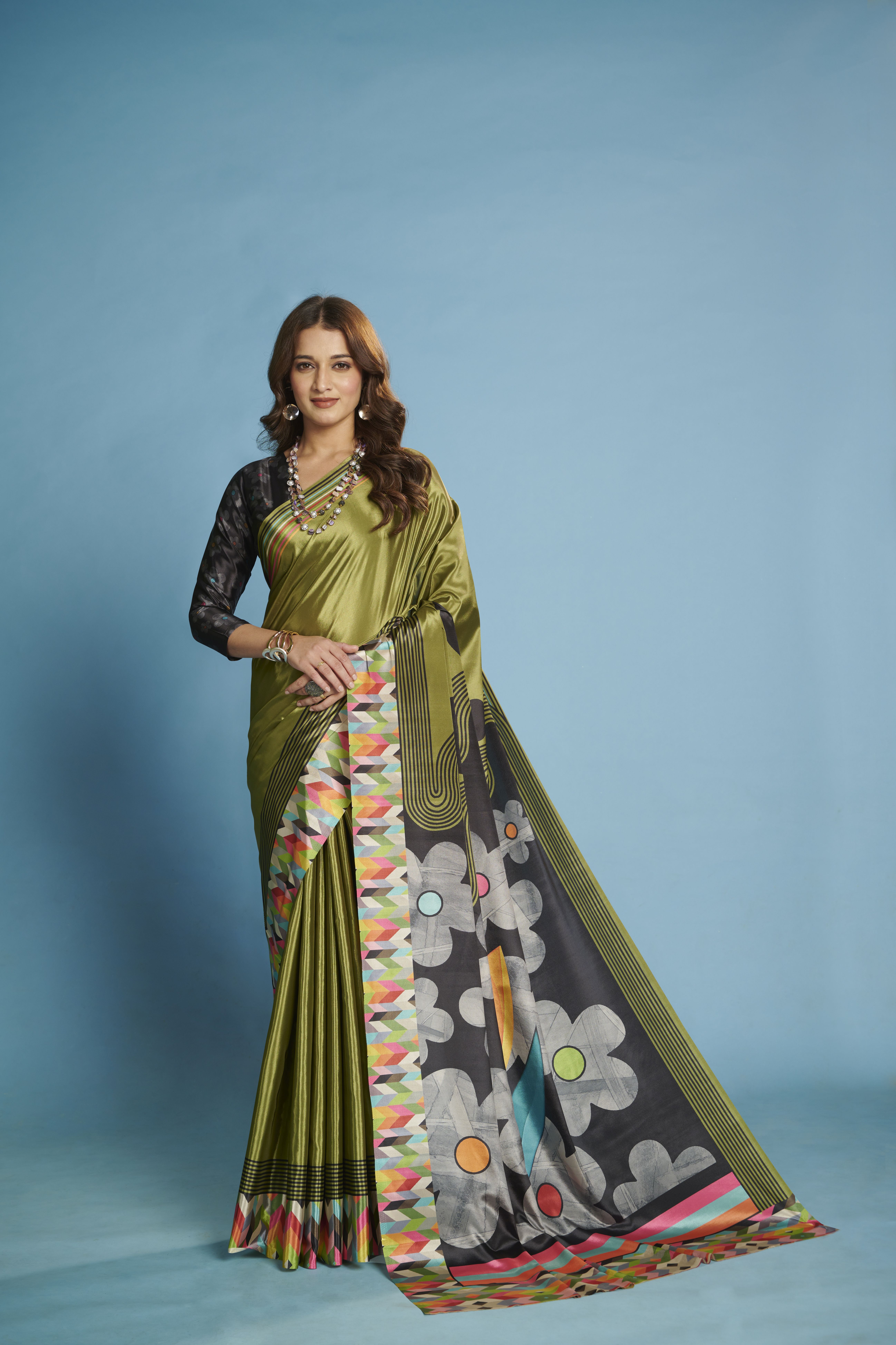 Green Color Malai Crepe Silk Fabric Beautiful Digital Printed Saree