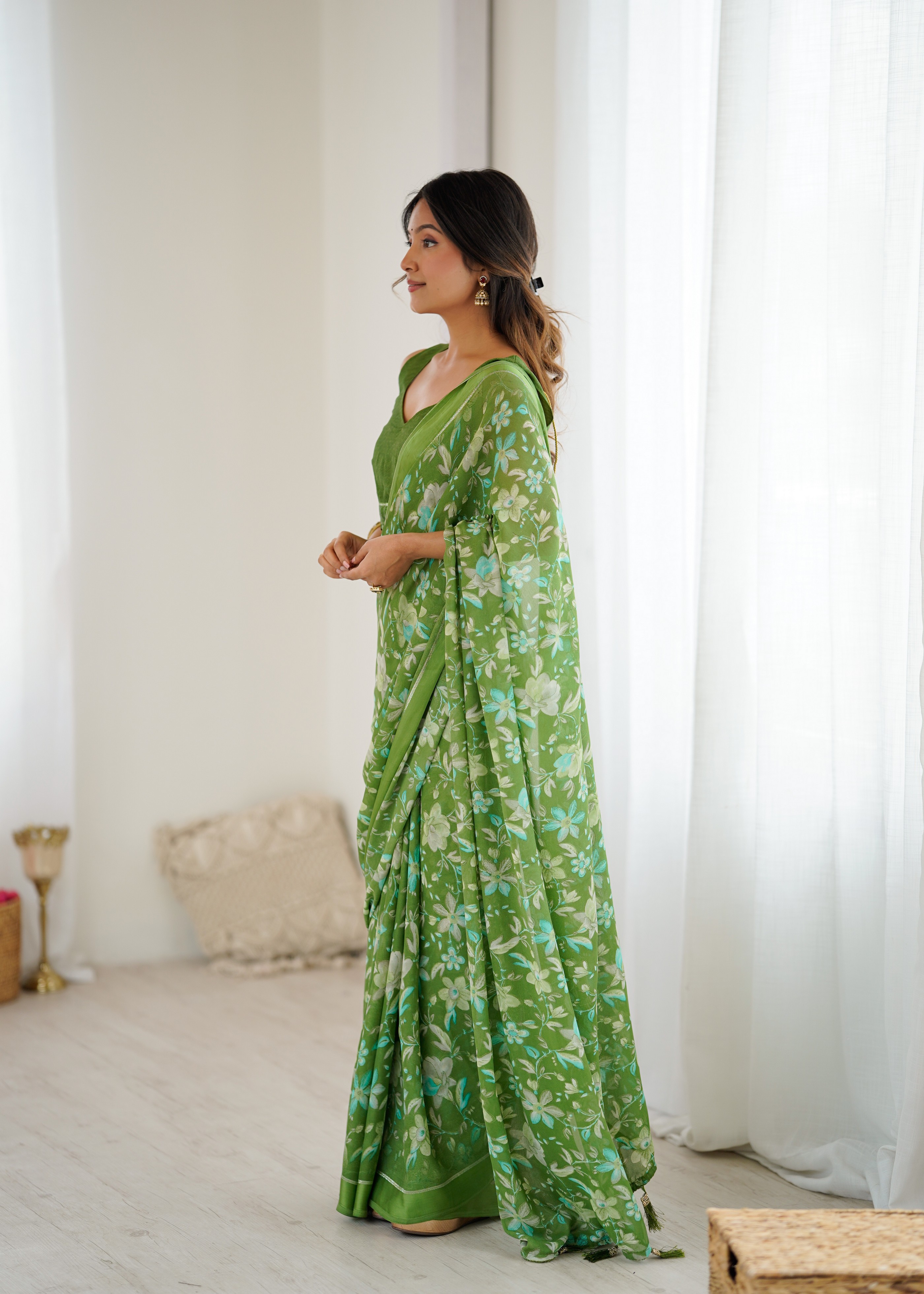 Green Color Moss Satin Patta Printed Ethnic Partywear Saree