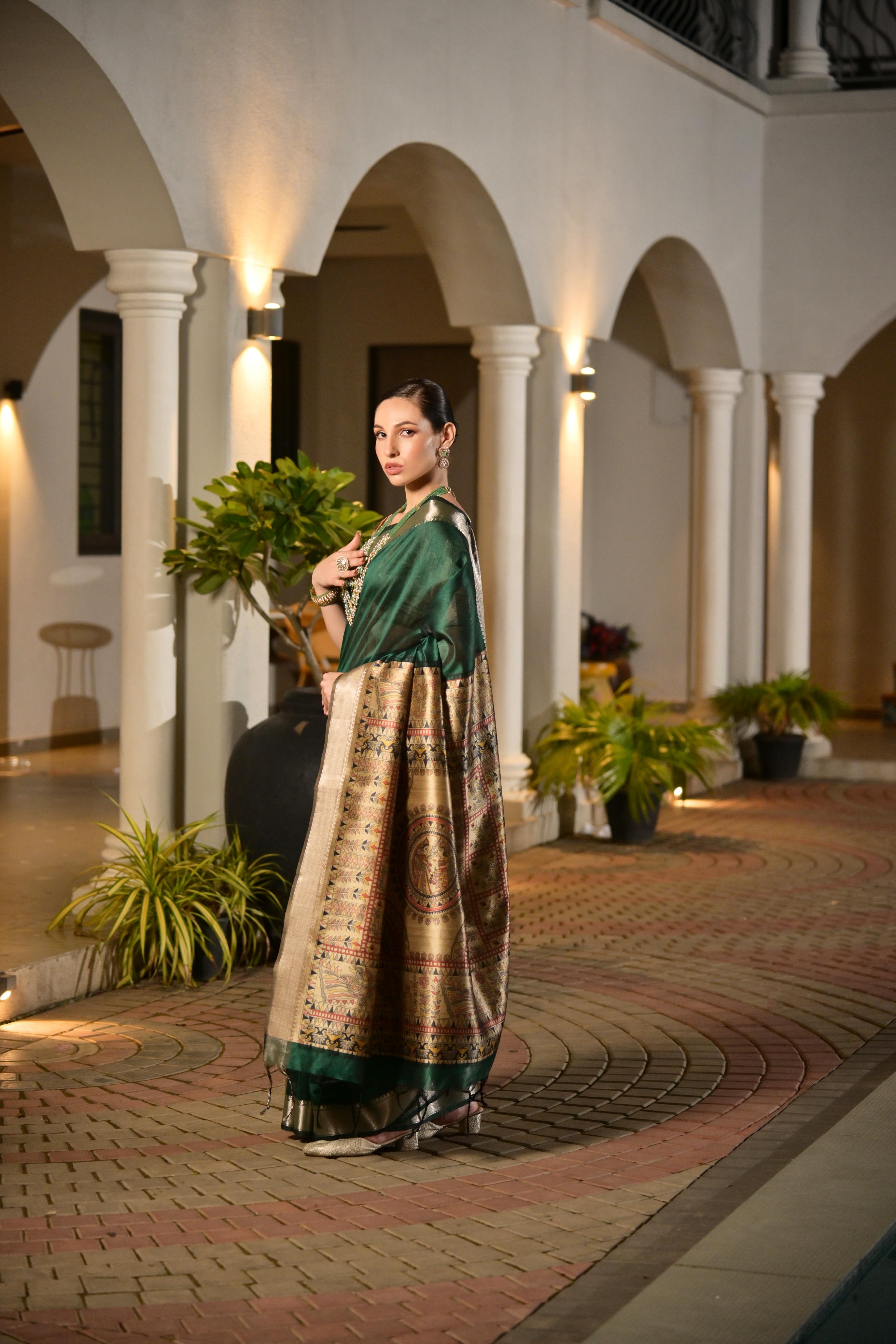 Green Color Smart Khadi Raw Silk Saree With Graceful Madhubani Style Print